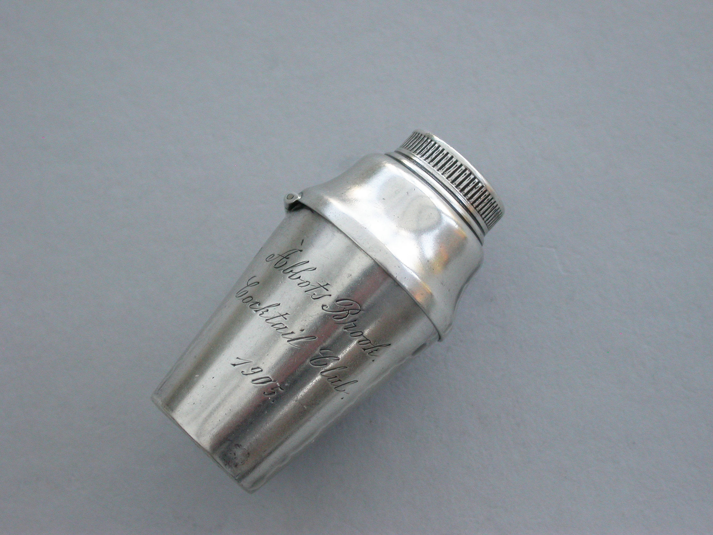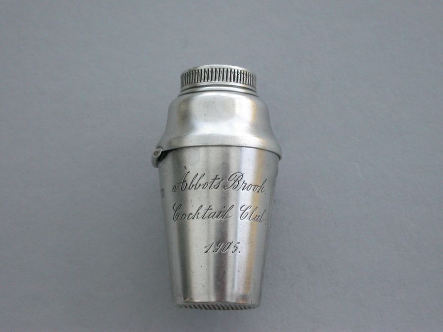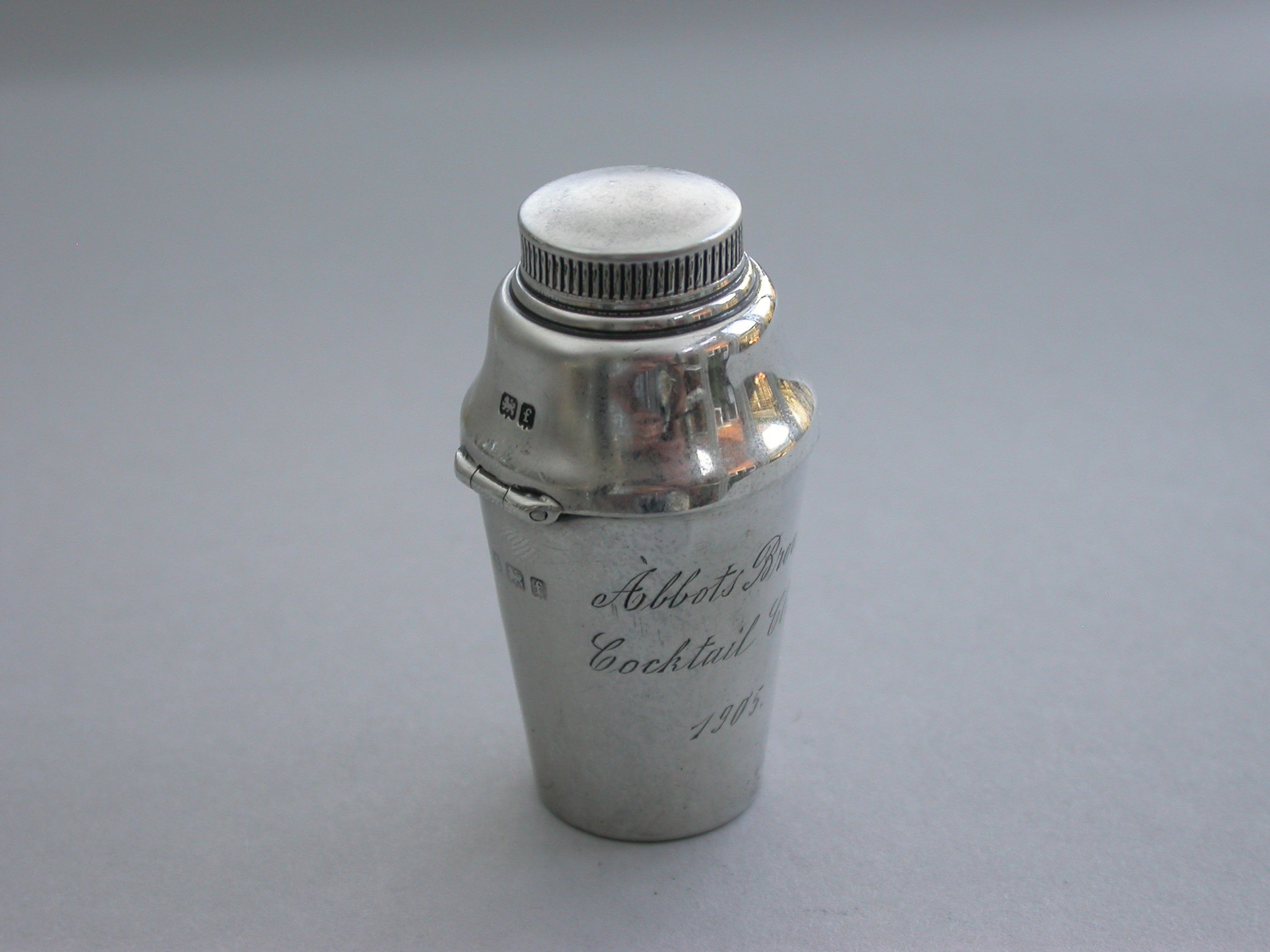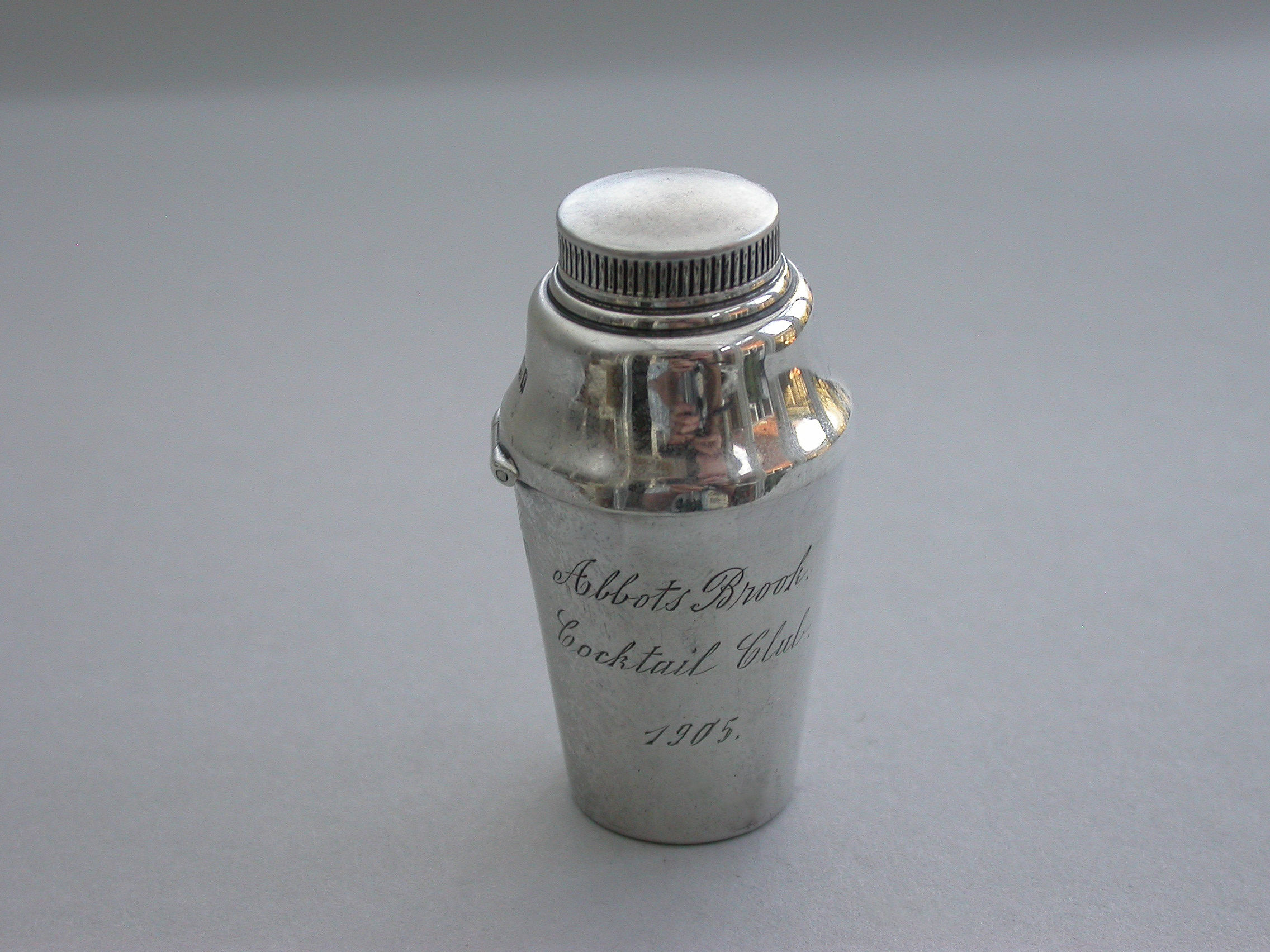 A rare Edwardian novelty silver Vesta Case made in the form of a Cocktail Shaker, the body engraved ""shake!!"" and ""Abbots Brook Cocktail Club 1905"". Hinged lid and engraved striker to the base.