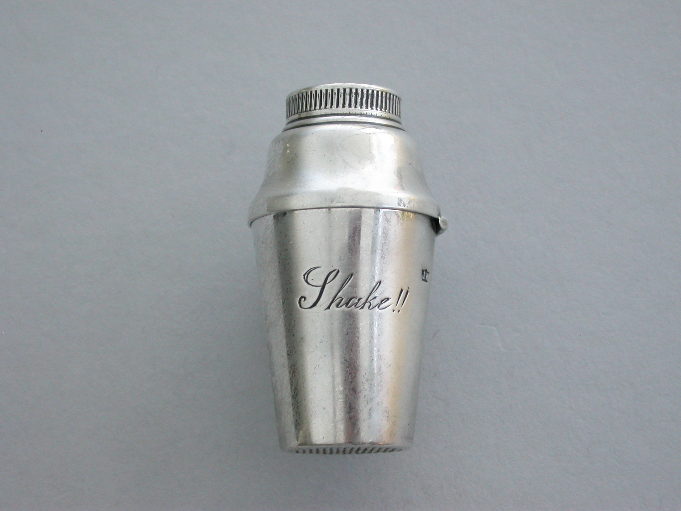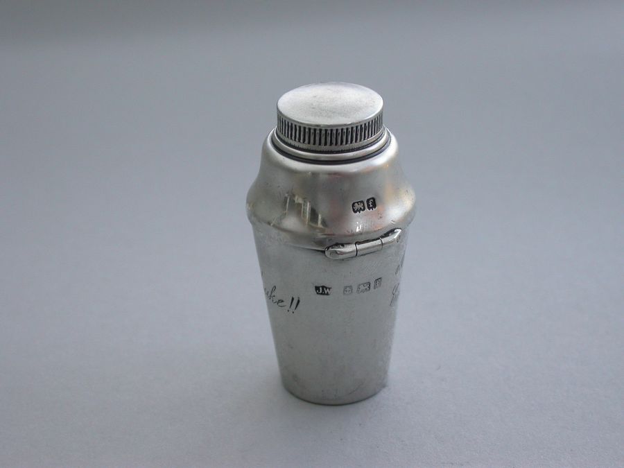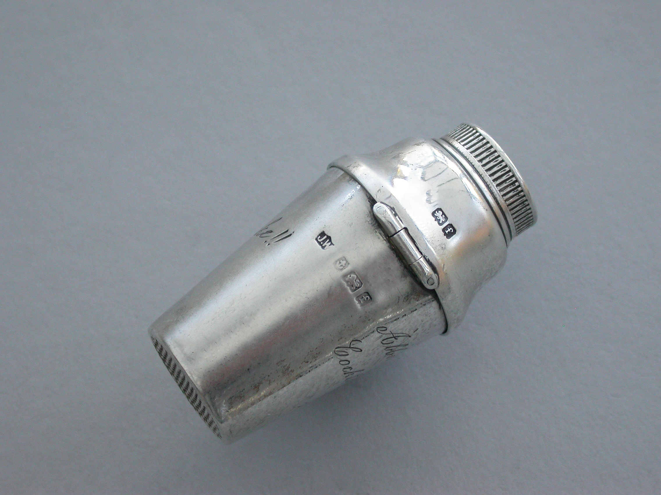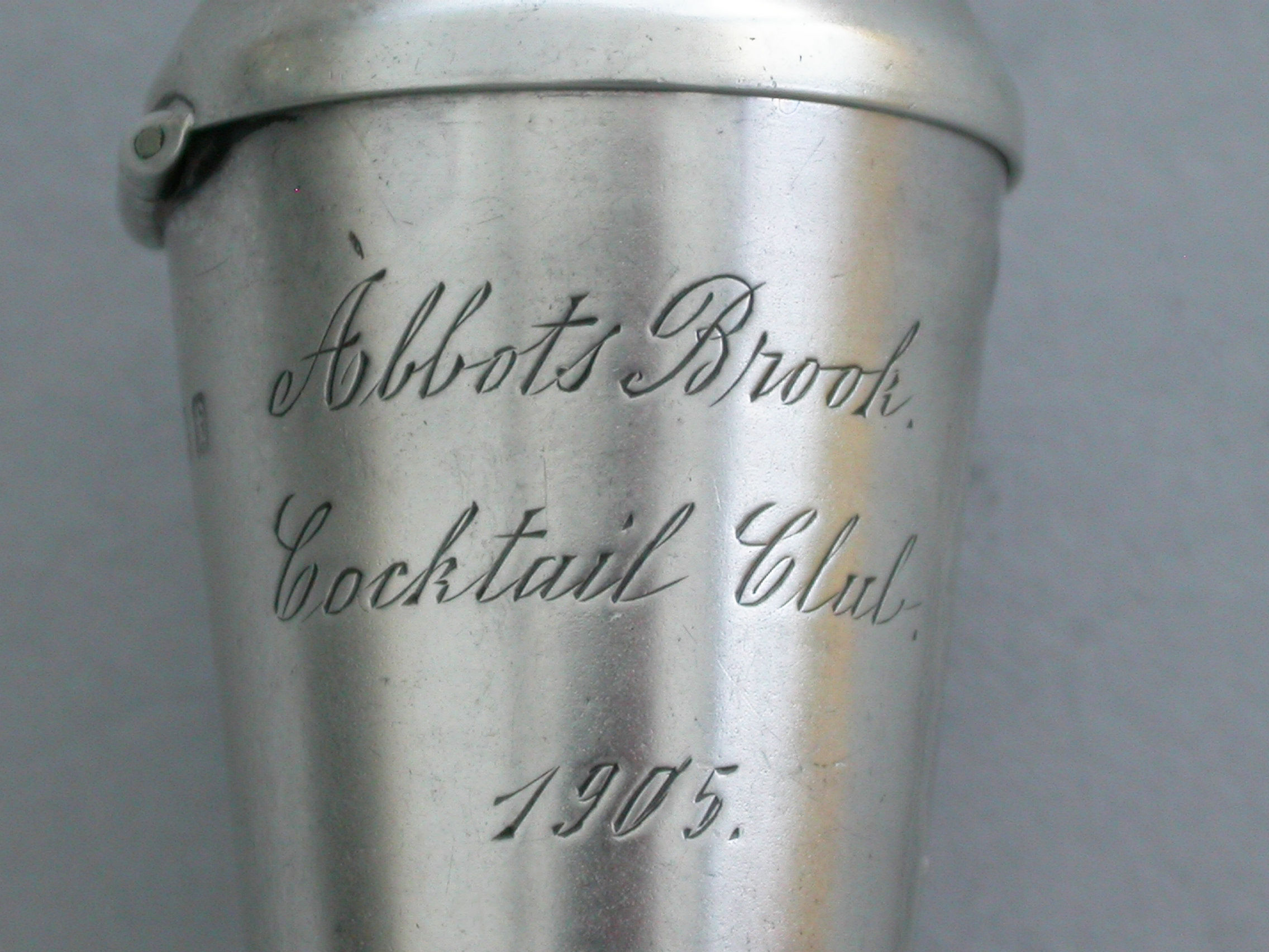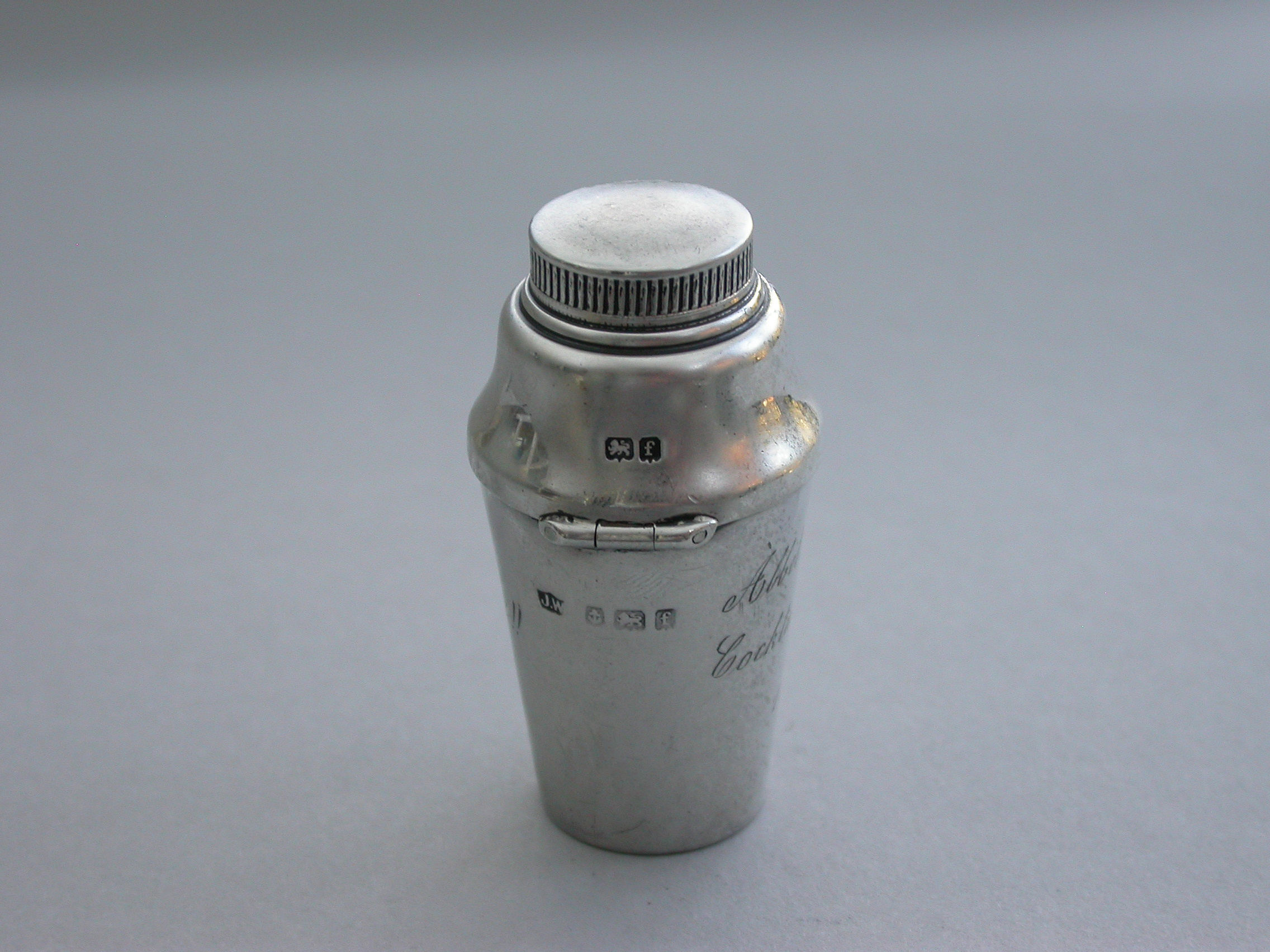 A rare Edwardian novelty silver Vesta Case made in the form of a Cocktail Shaker, the body engraved ""shake!!"" and ""Abbots Brook Cocktail Club 1905"". Hinged lid and engraved striker to the base.