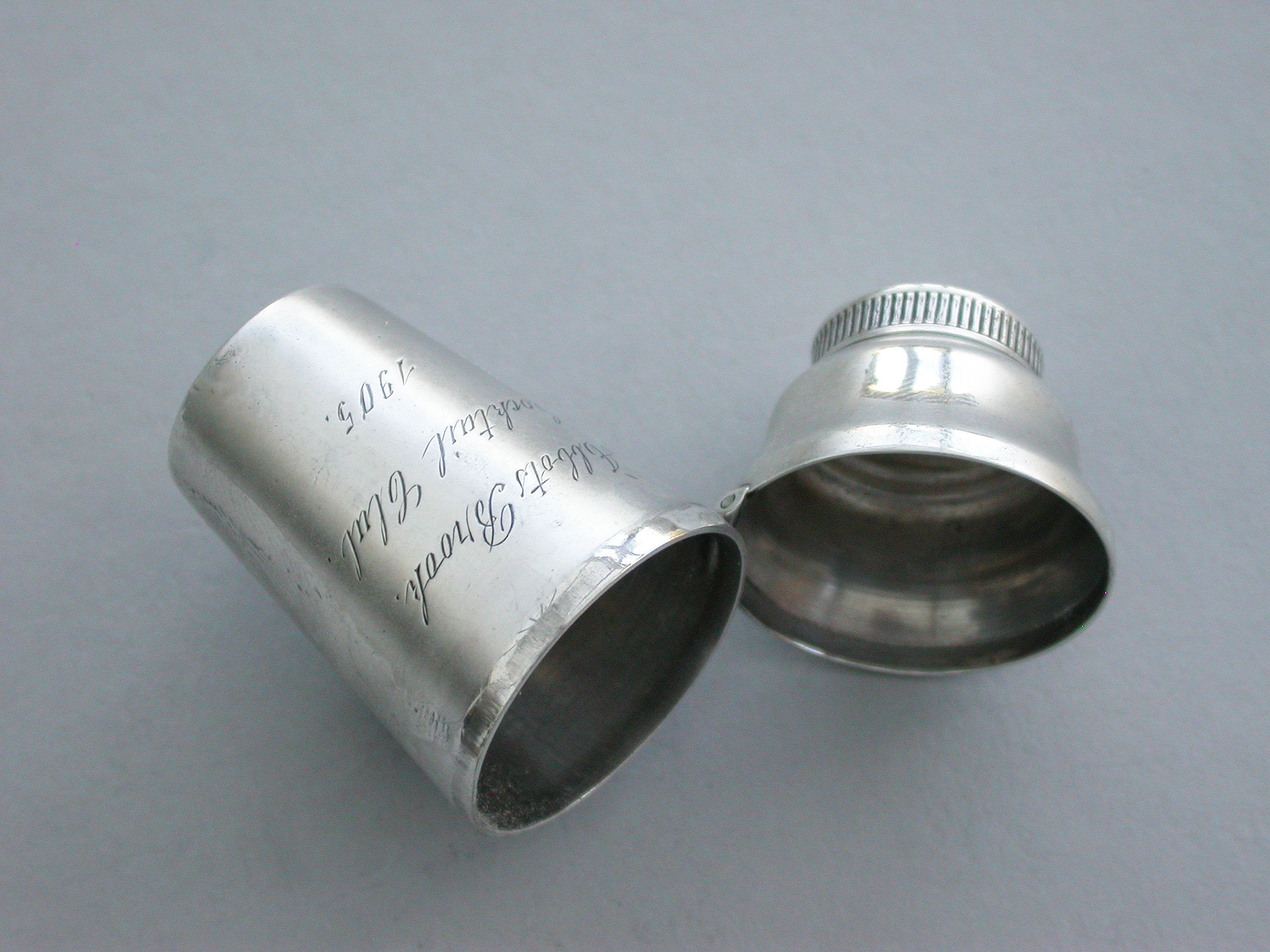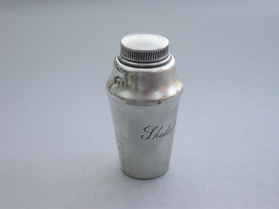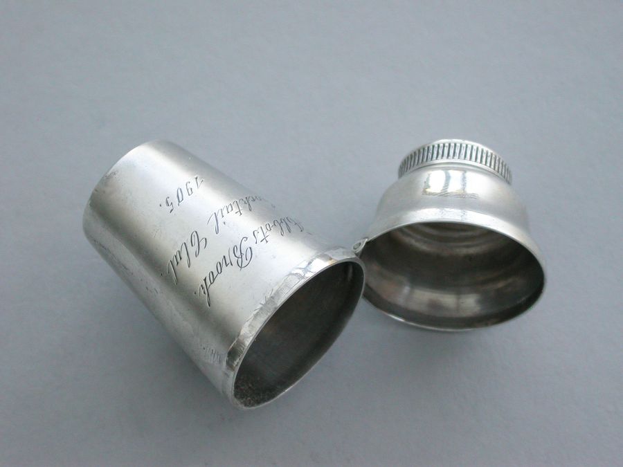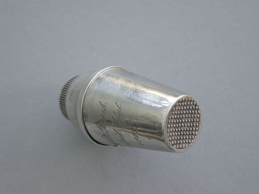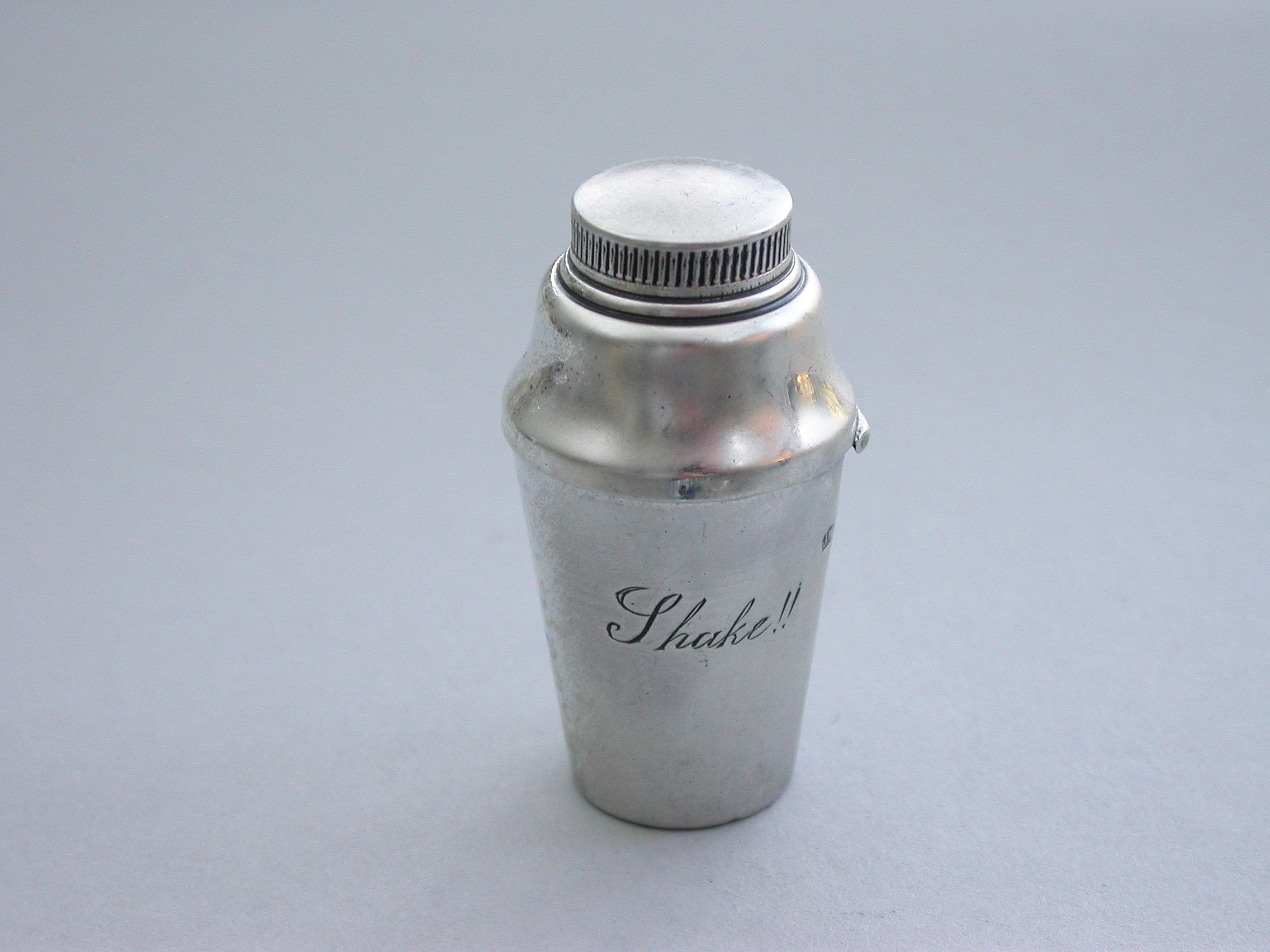 A rare Edwardian novelty silver Vesta Case made in the form of a Cocktail Shaker, the body engraved ""shake!!"" and ""Abbots Brook Cocktail Club 1905"". Hinged lid and engraved striker to the base.