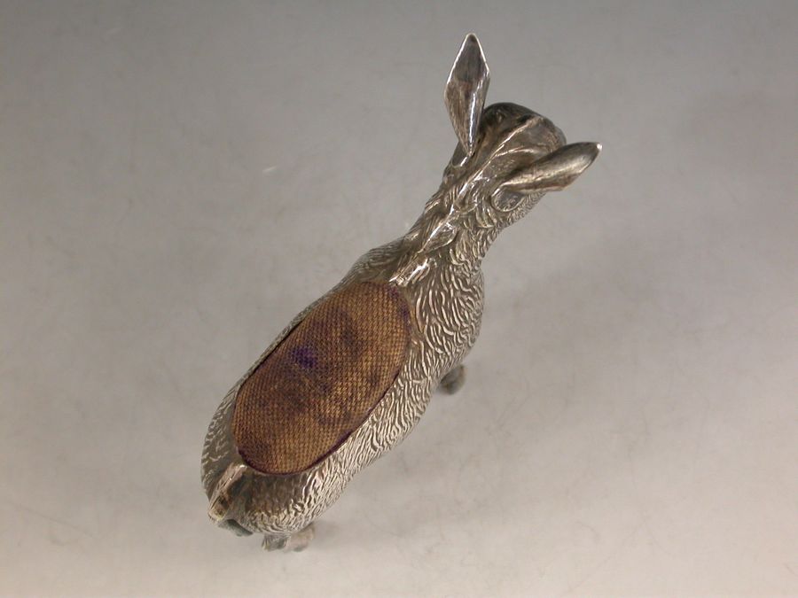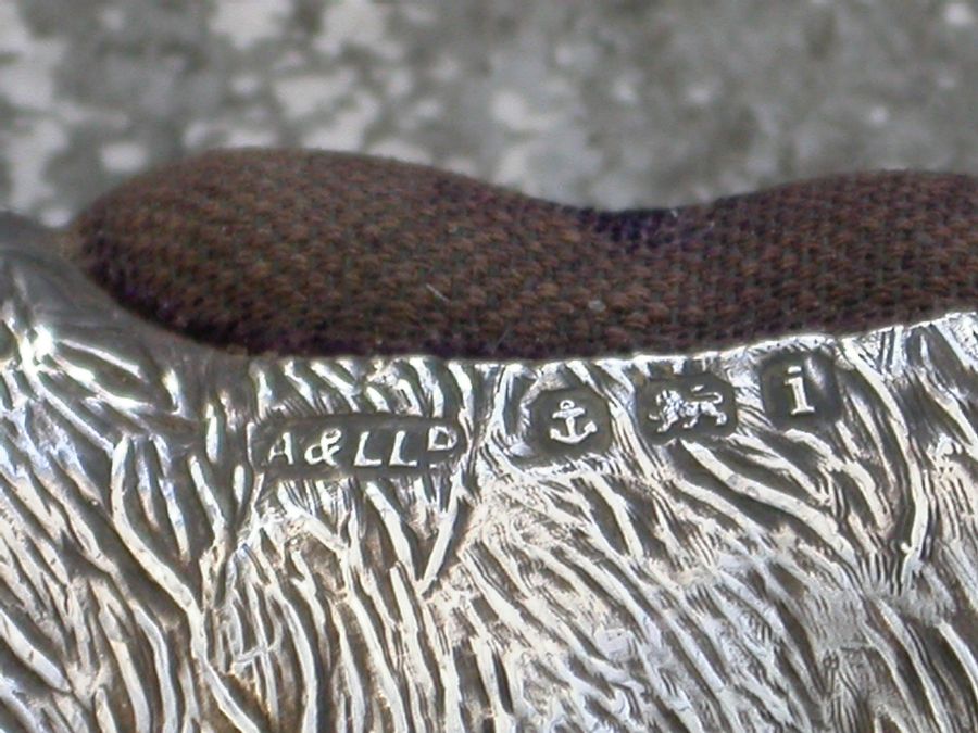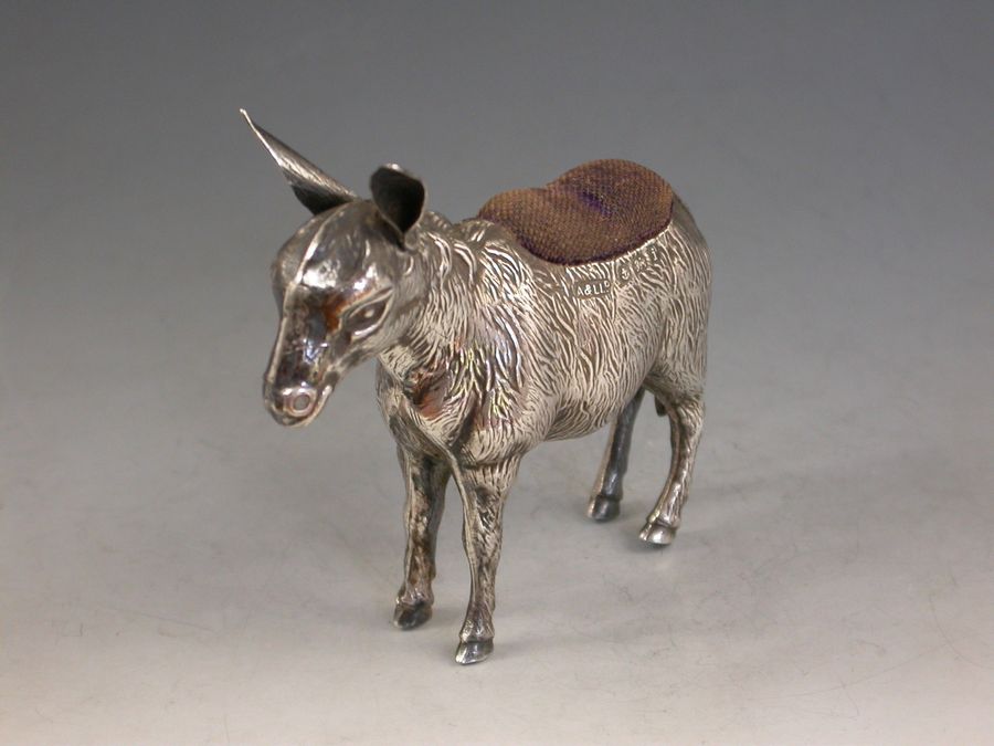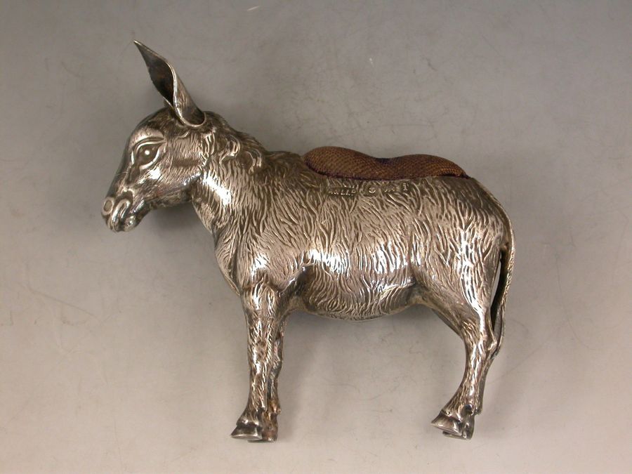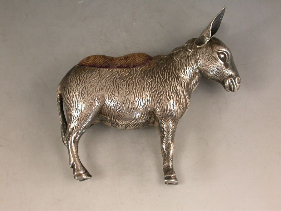 A very good Edwardian novelty silver Pin cushion, made in the form of a Donkey, complete with original blue velvet cushion.