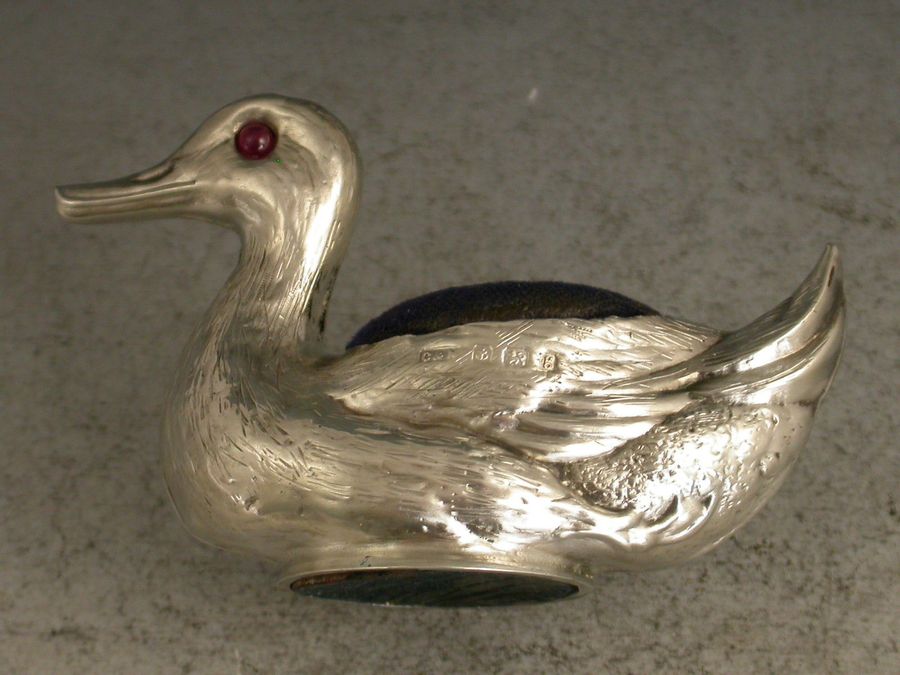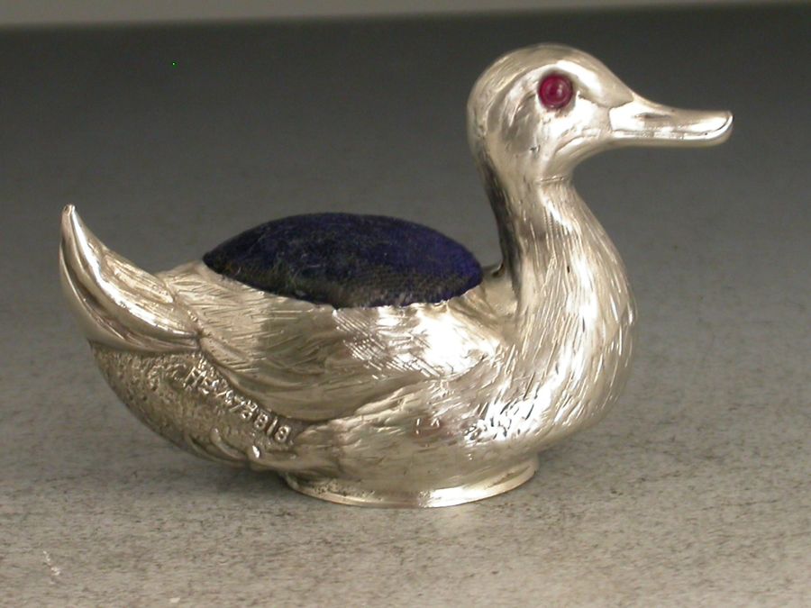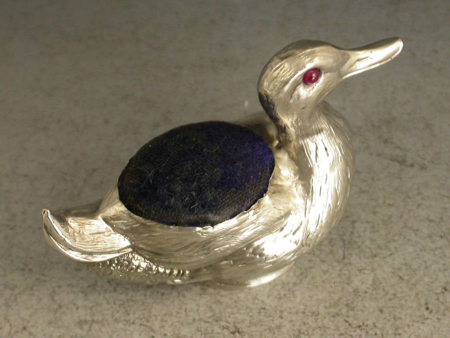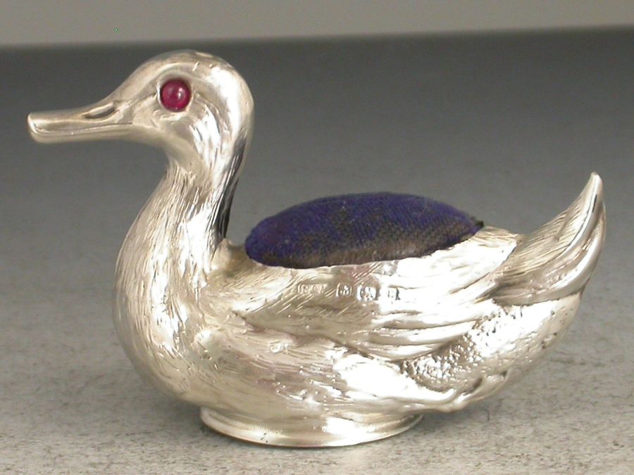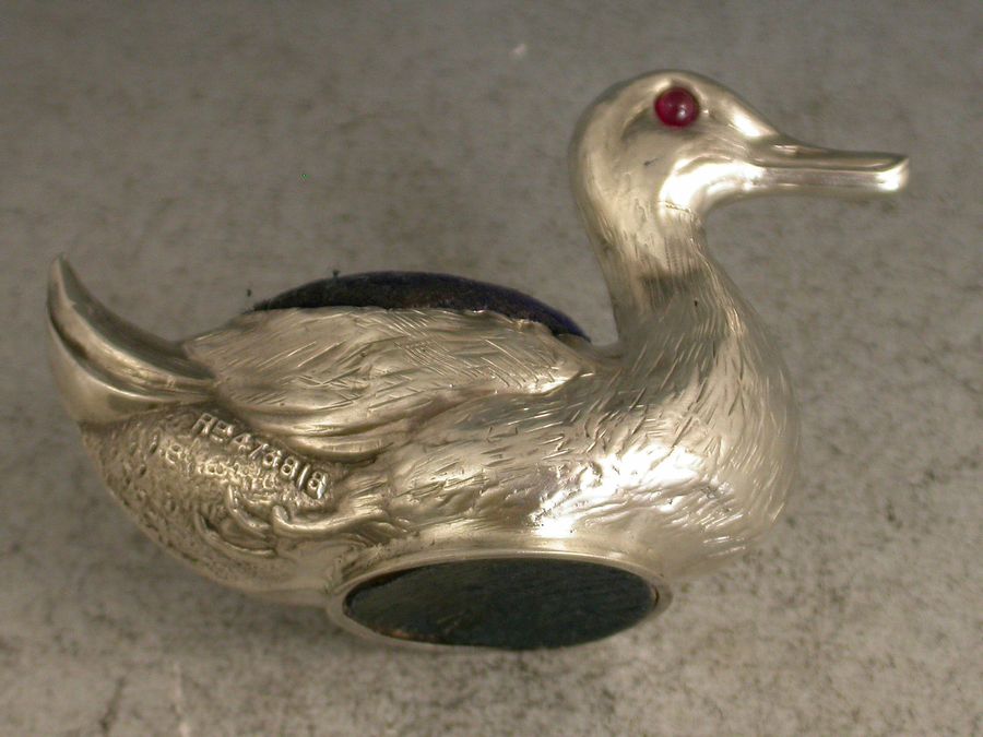 A good Edwardian novelty silver Pin Cushion realistically modelled as a swimming duck with up-turned tail, complete with ruby red glass eyes and original blue velvet cushion.