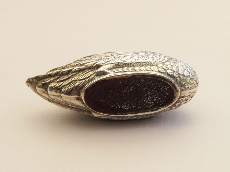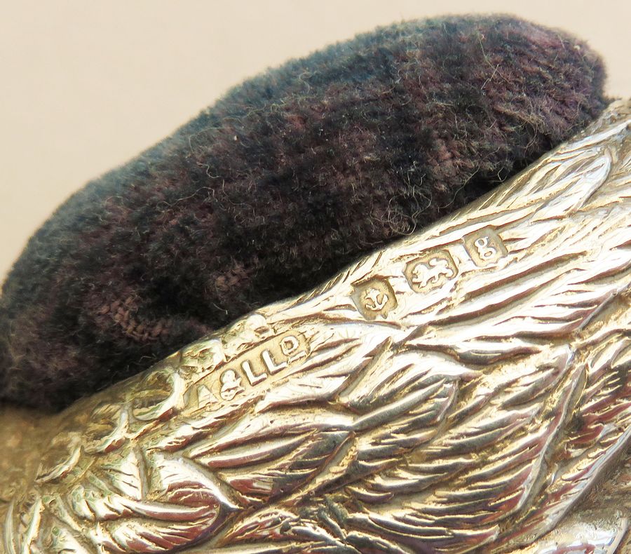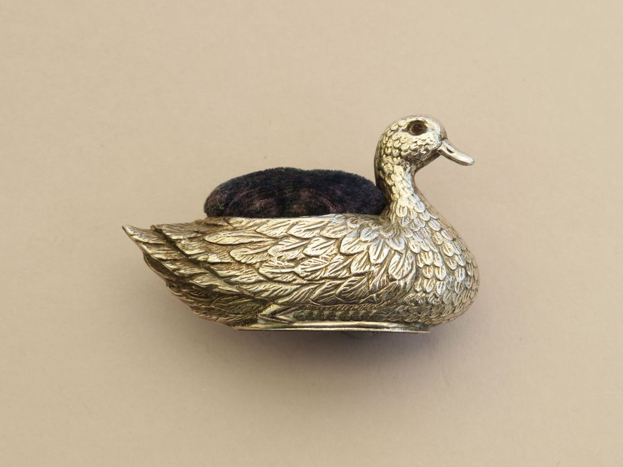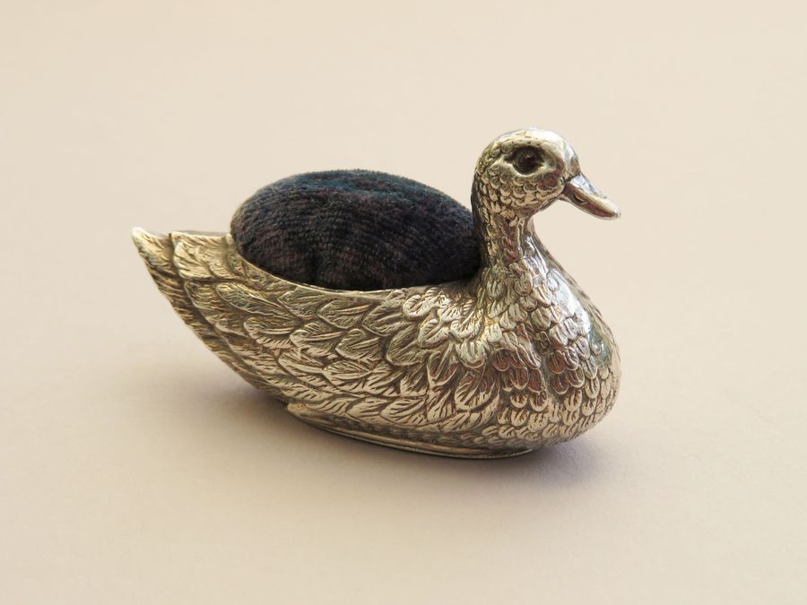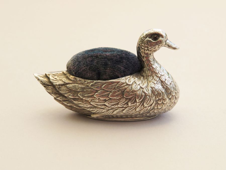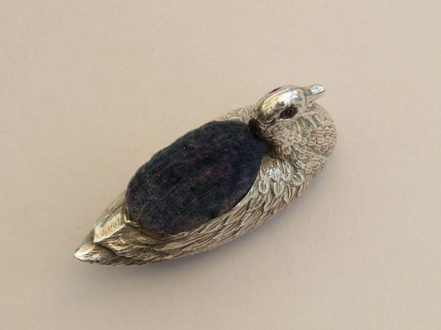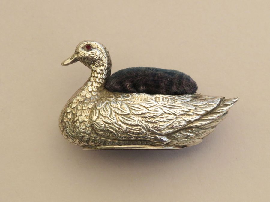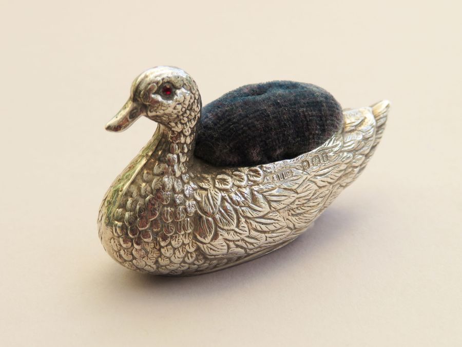 A good Edwardian novelty silver Pin Cushion, made in the form of a swimming duck, with textured feathers and complete with original blue velvet cushion and ruby glass eyes.