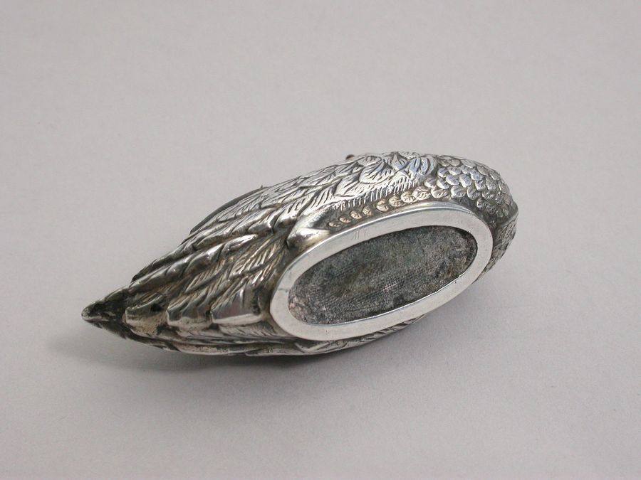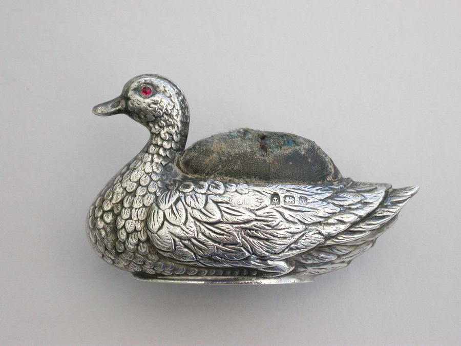 A good Edwardian novelty silver Pin Cushion, made in the form of a swimming duck, with textured feathers and complete with original velvet cushion and ruby glass eyes.