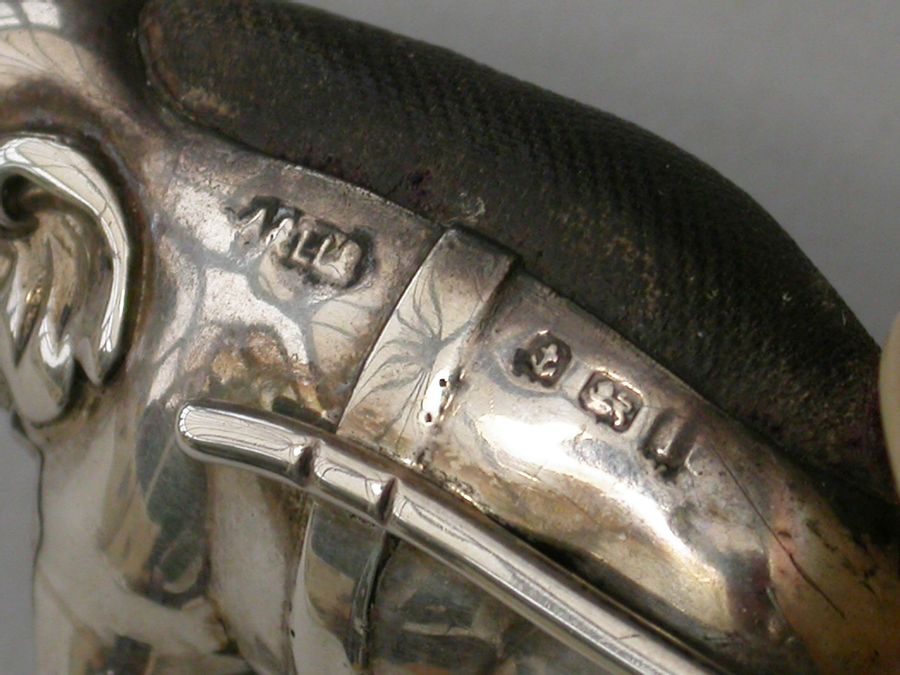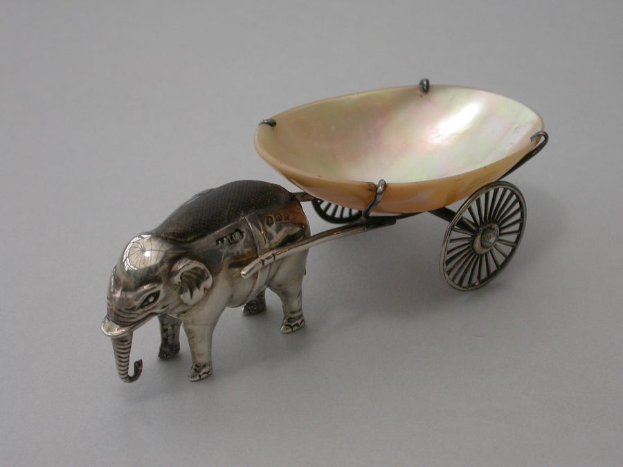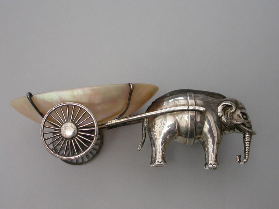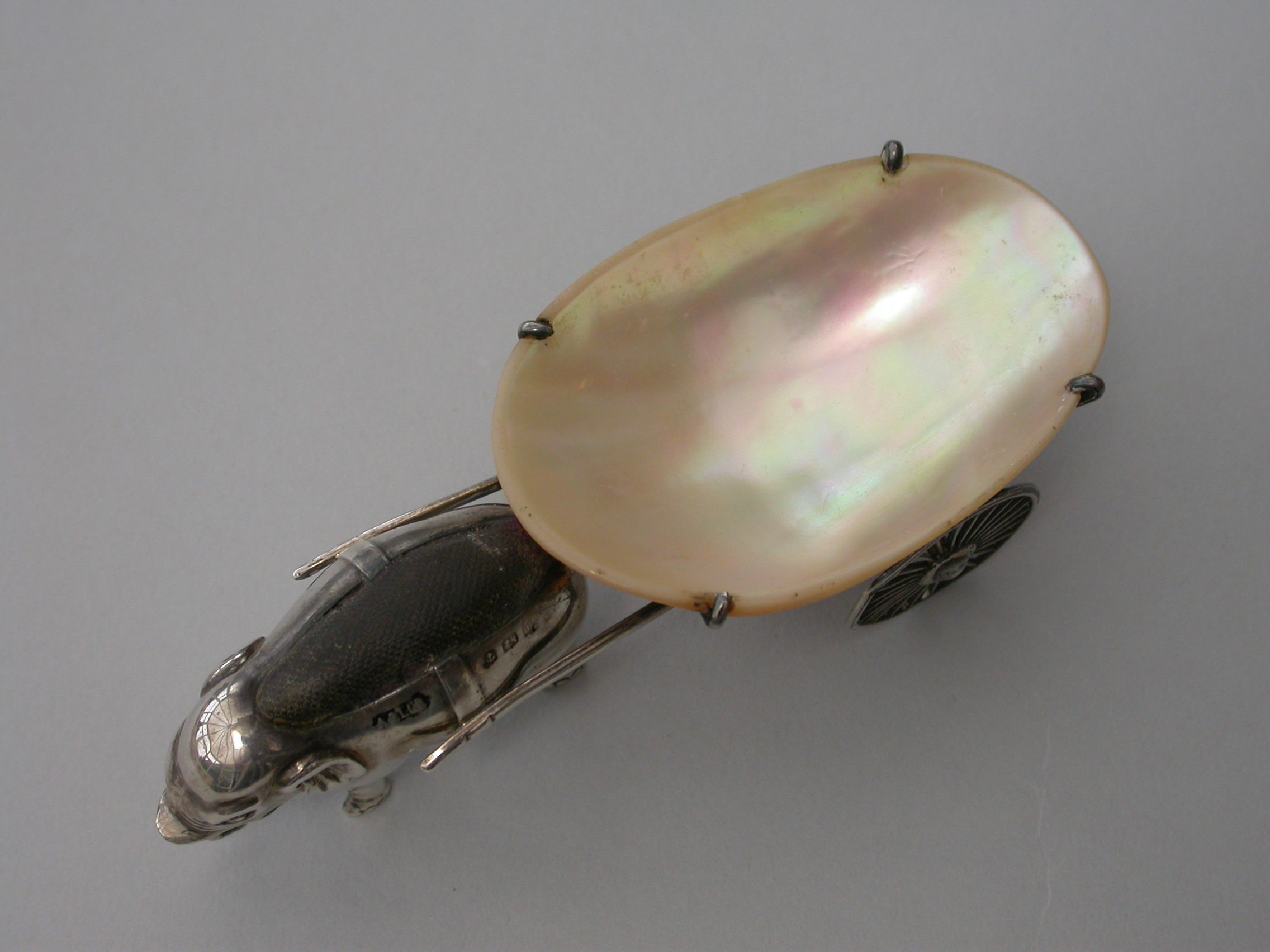 A rare Edwardian novelty silver Pin cushion made in the form of an elephant pulling a mother of pearl cart.