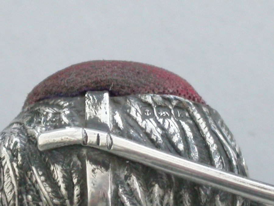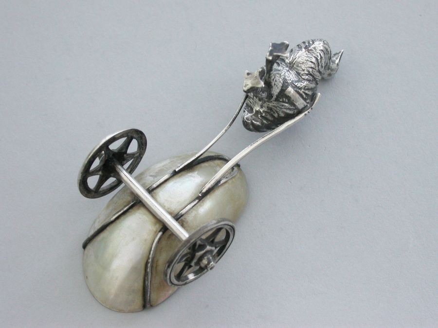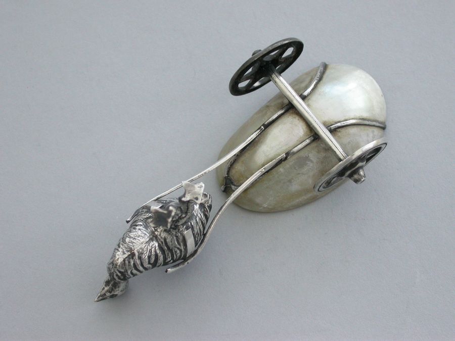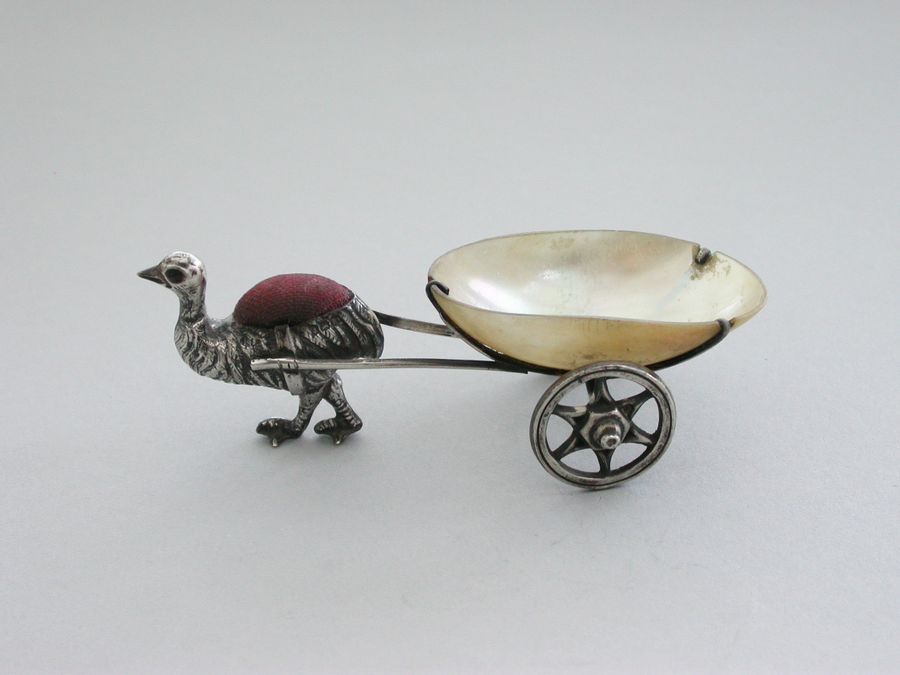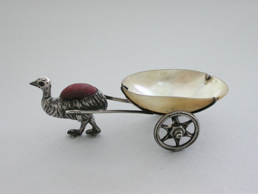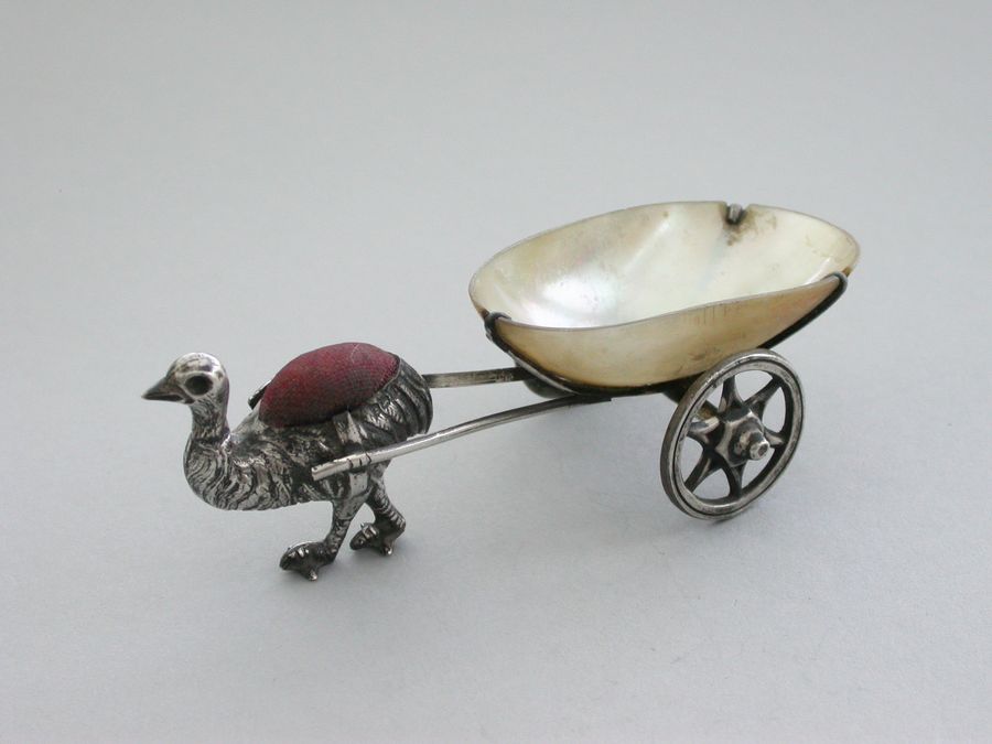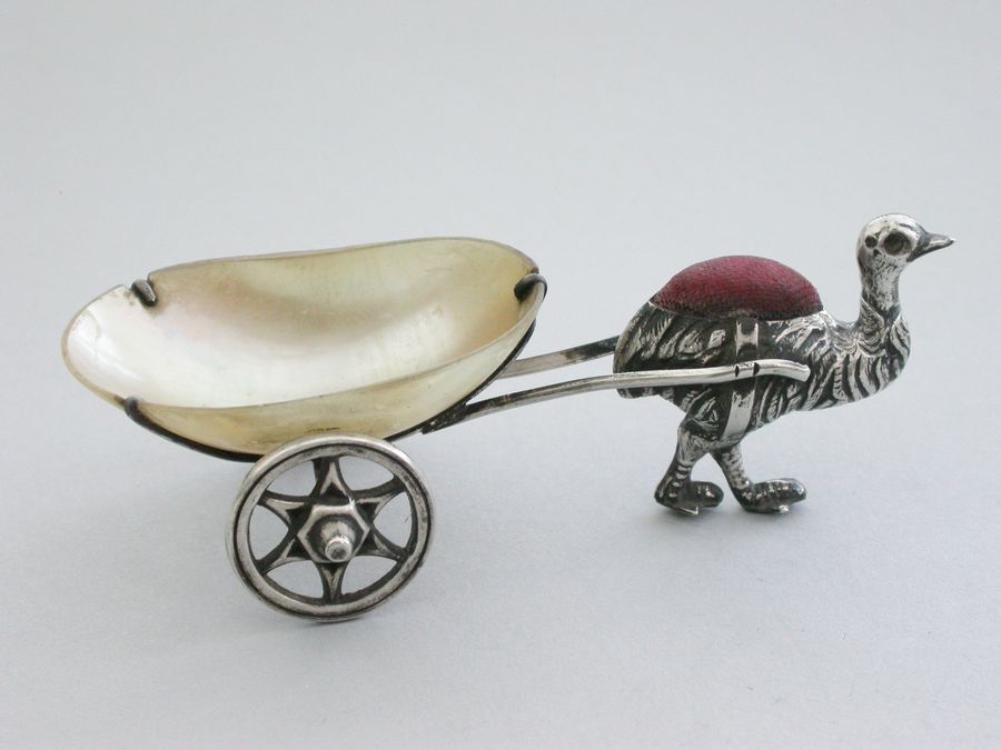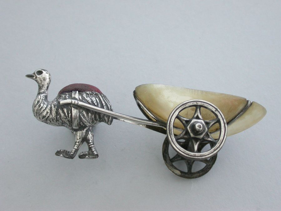 An extremely rare Edwardian novelty silver Pin Cushion, modelled as an Emu pulling a Mother of Pearl cart on two wheels. The Emu realistically modelled with fine detail and complete with original red velvet cushion.