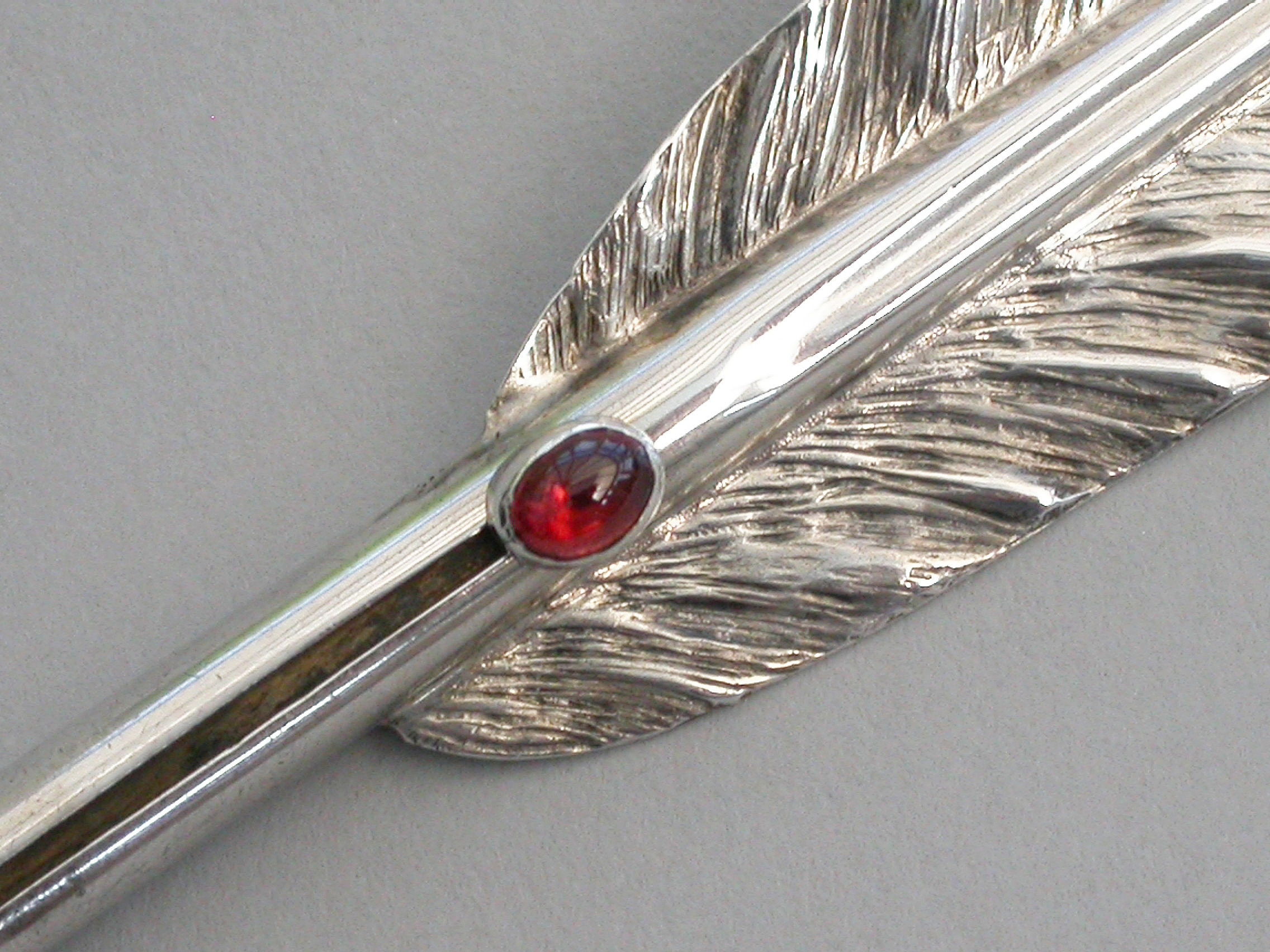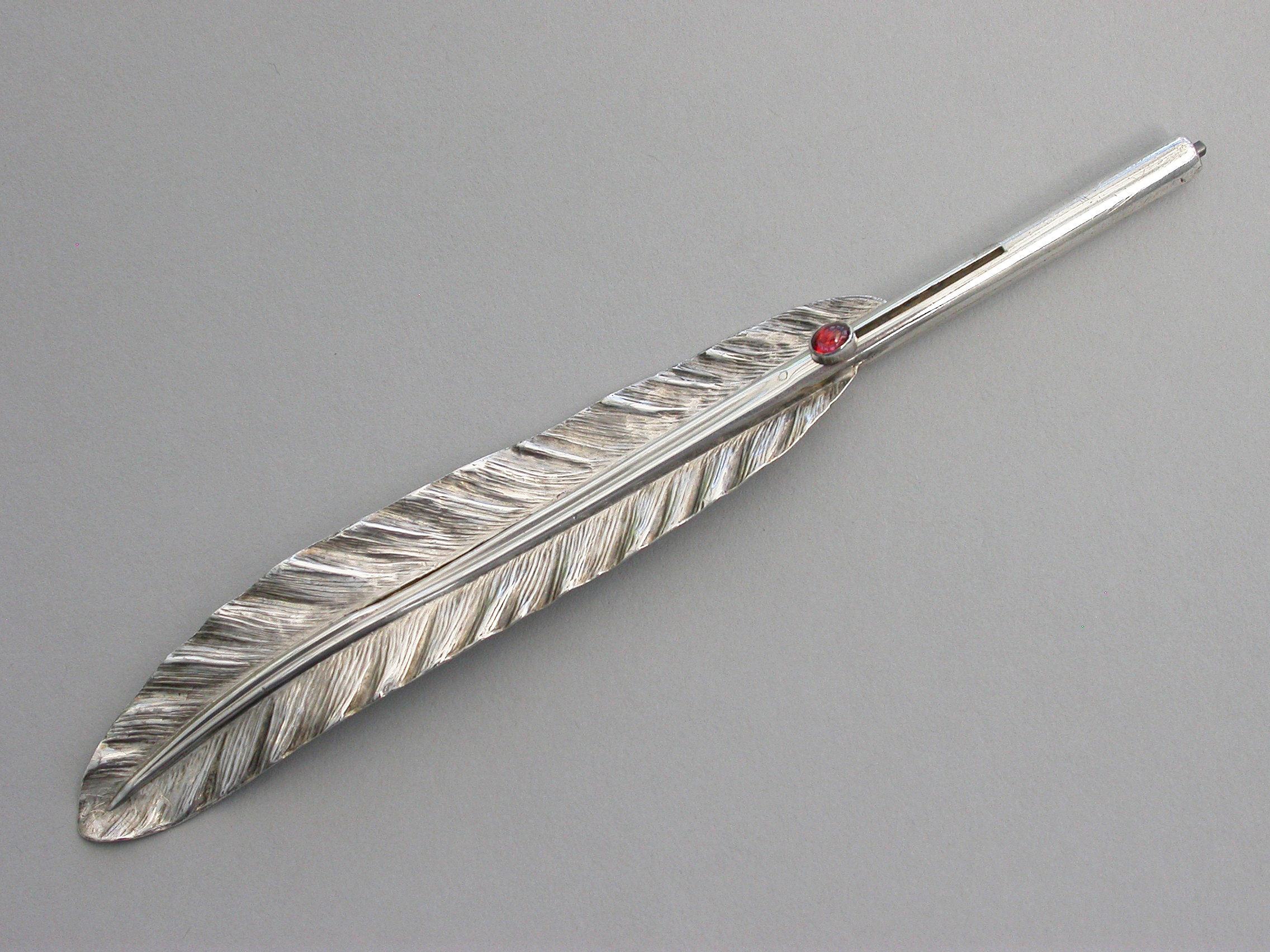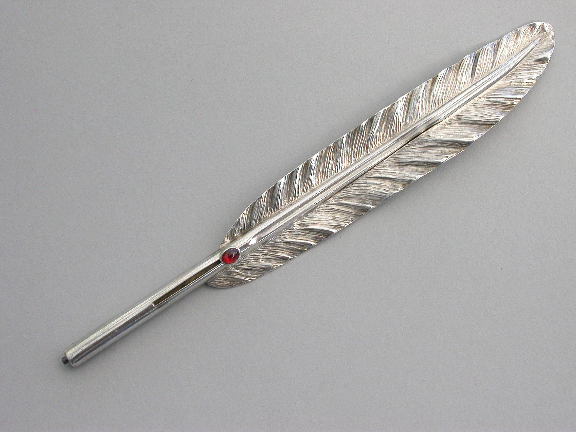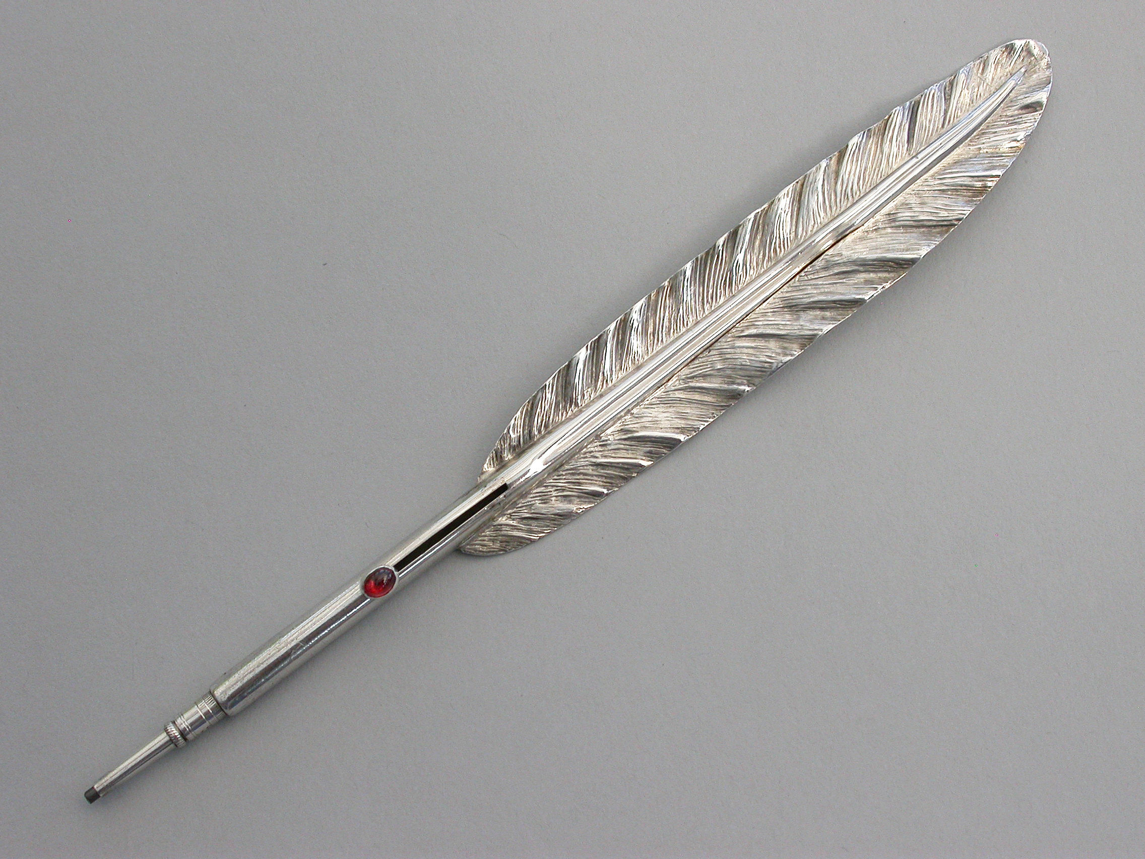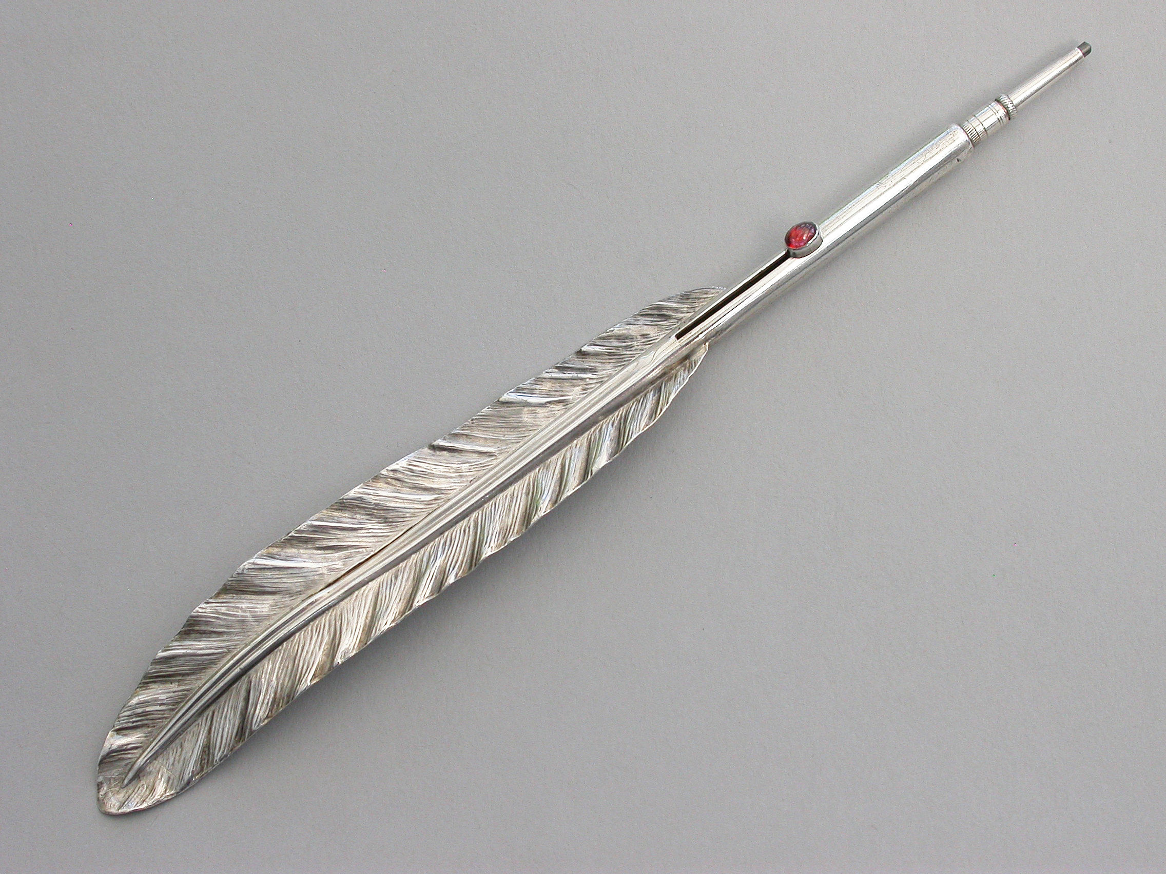 A rare Edwardian novelty silver sliding Propelling Pencil made in the form of a feather, the slider button set with a garnet stone.