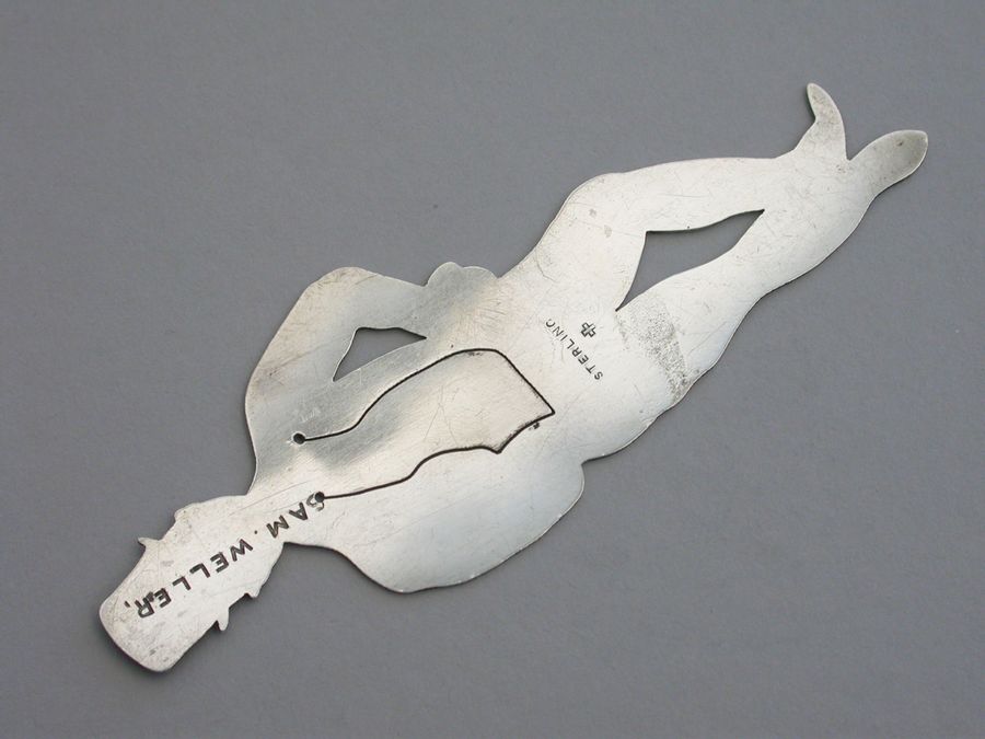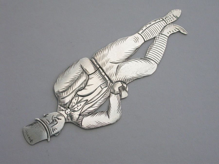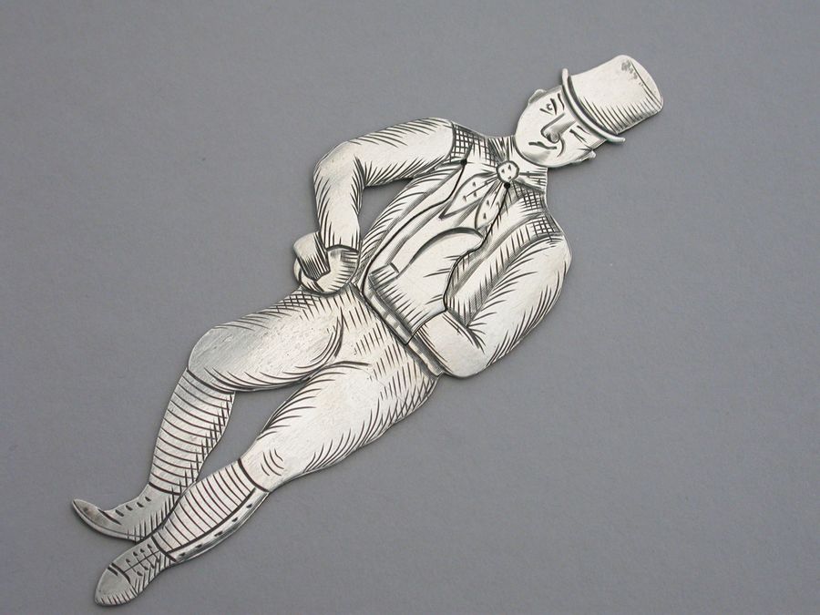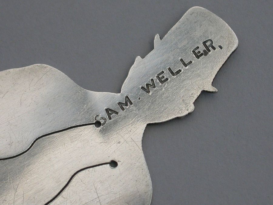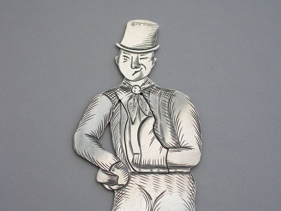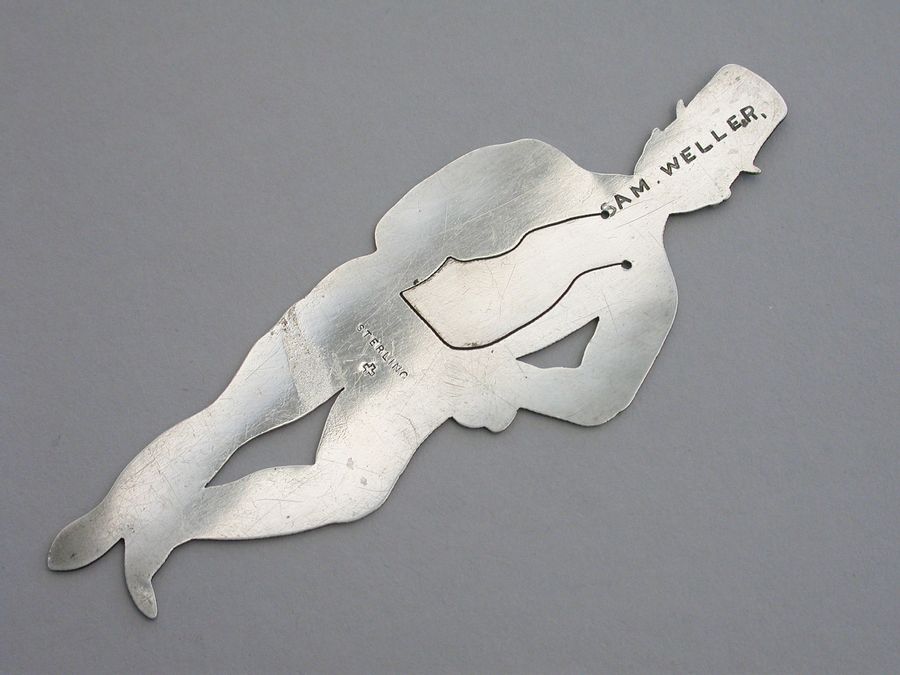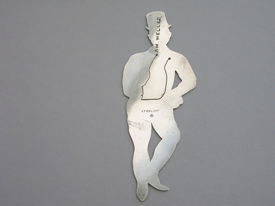 A rare early 20th century American novelty silver figural Bookmark, depicting the character Sam Weller from the Charles Dickens novel, The Pickwick Papers.