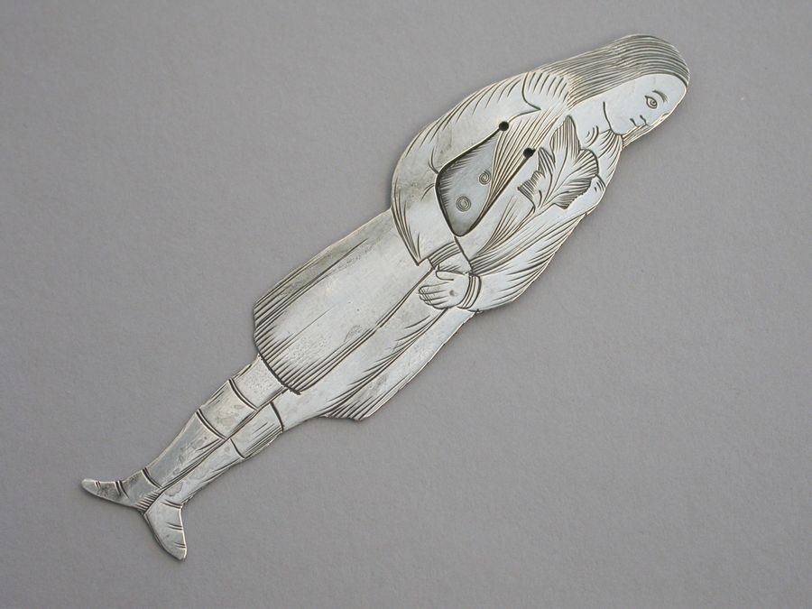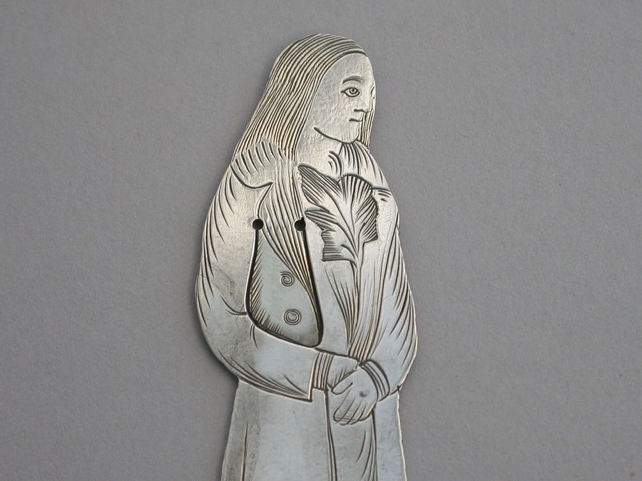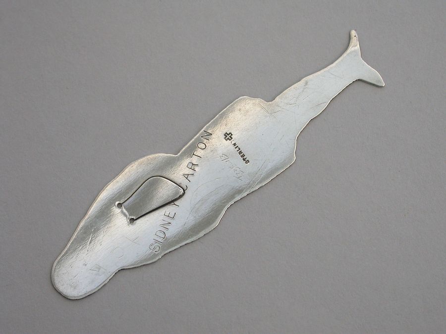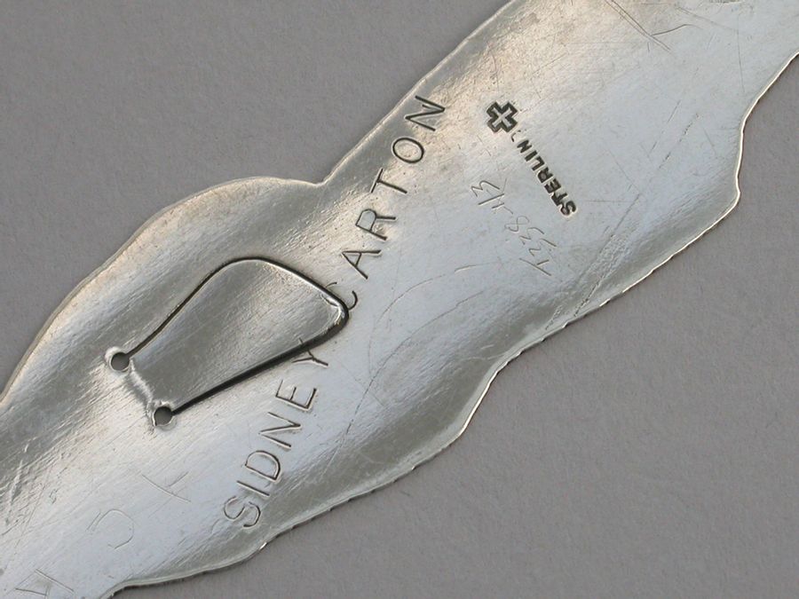A rare early 20th century American novelty silver figural Bookmark, depicting the character Sydney Carton, from the Charles Dickens novel, A Tale of Two Cities.