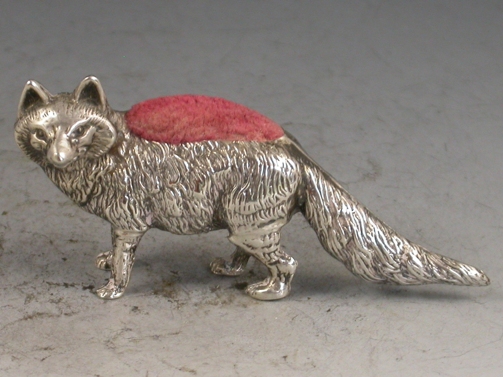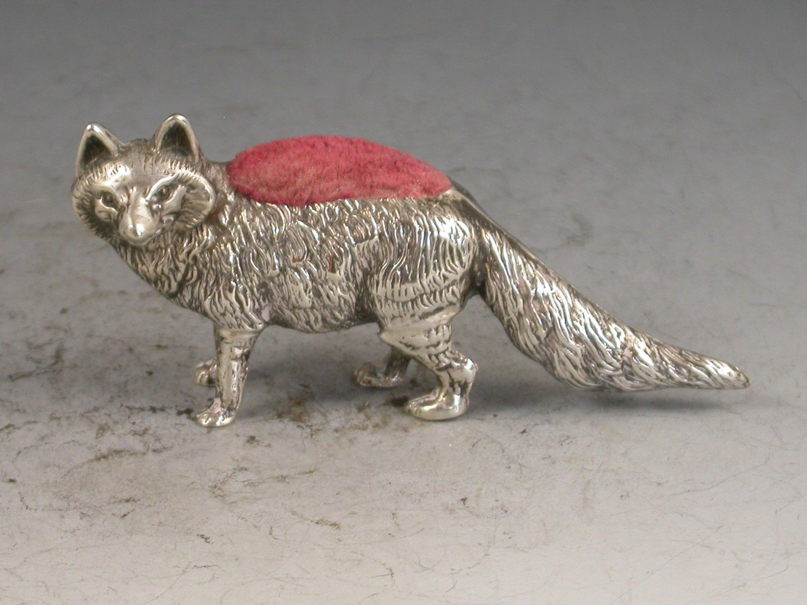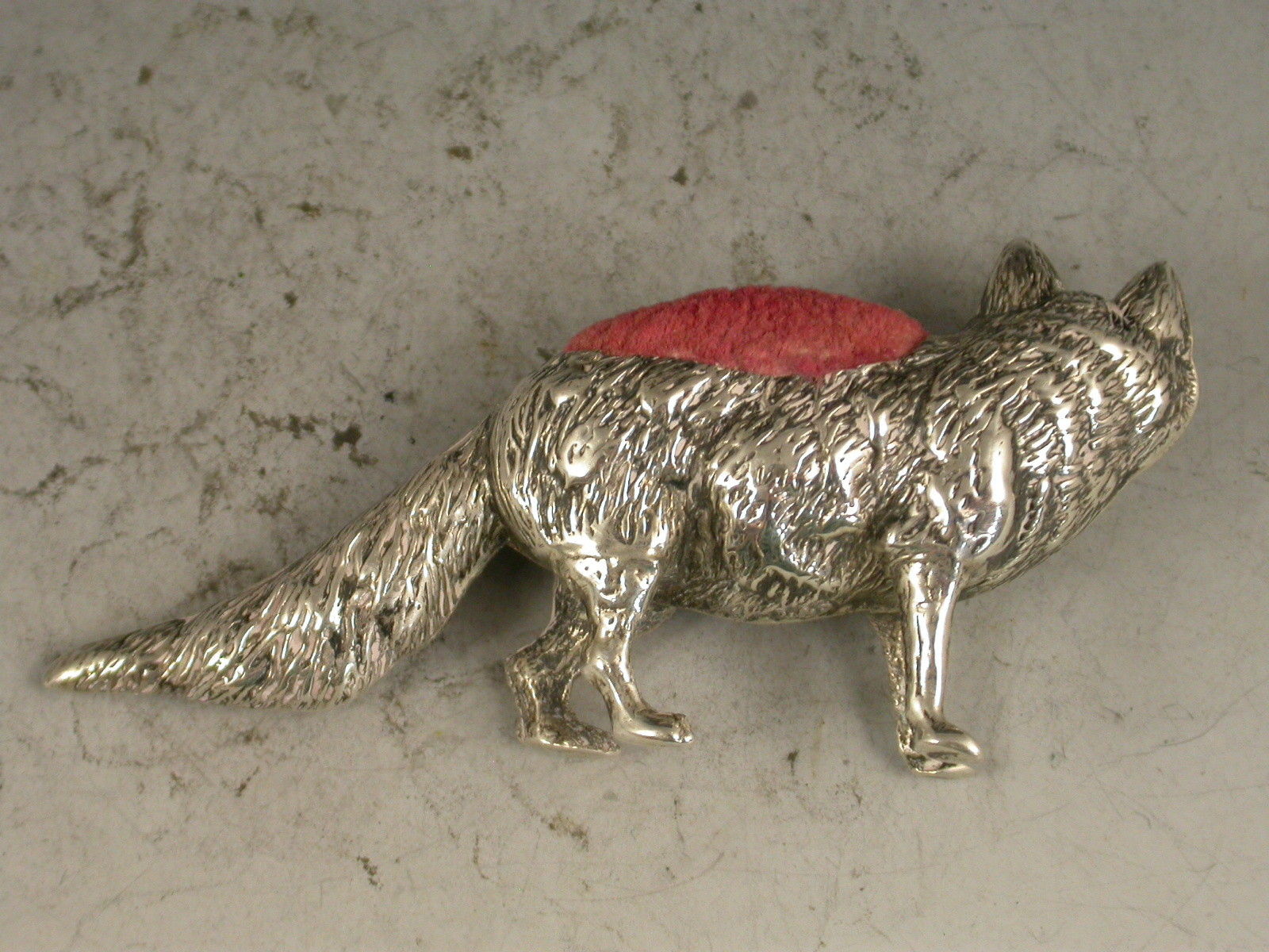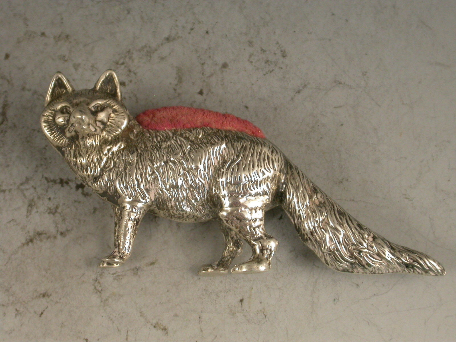 A rare Edwardian novelty silver Pin Cushion made in the form of a Fox, with pink velvet cushion.