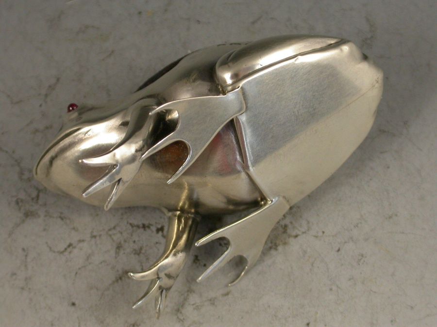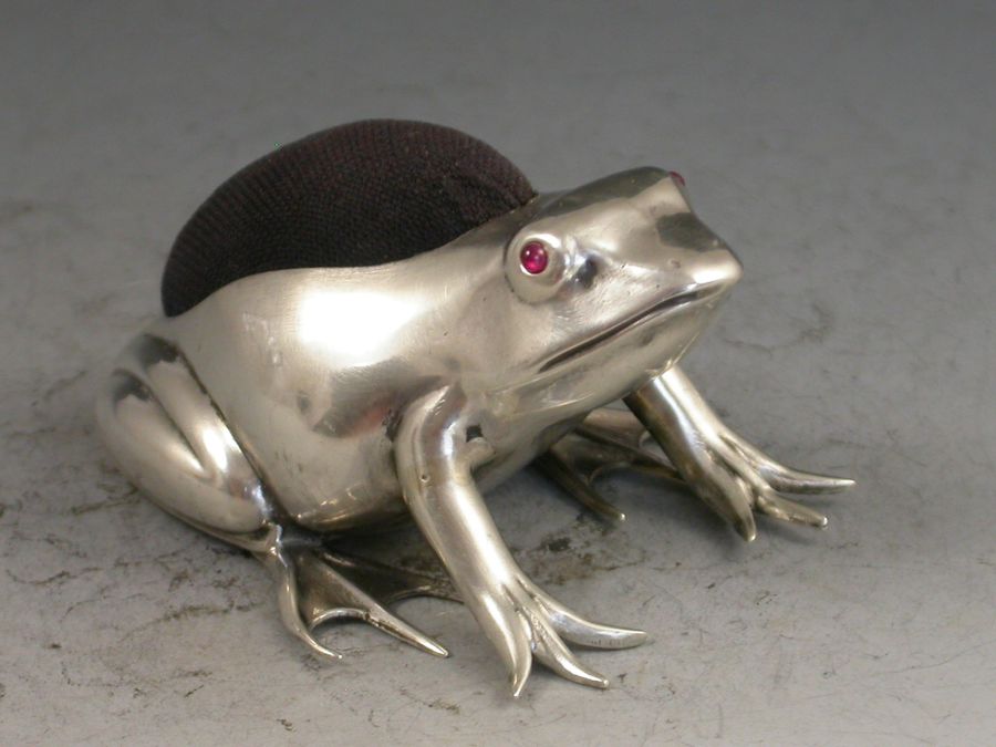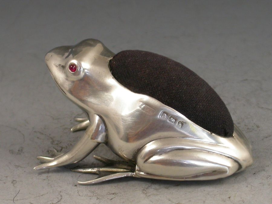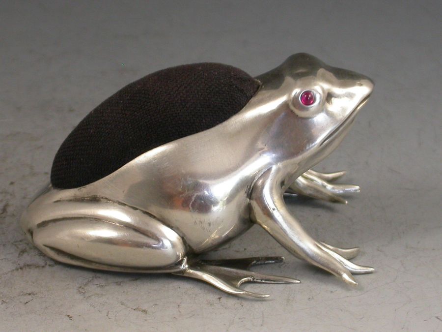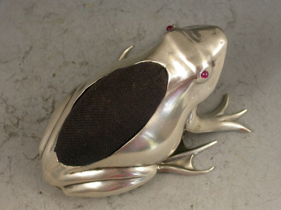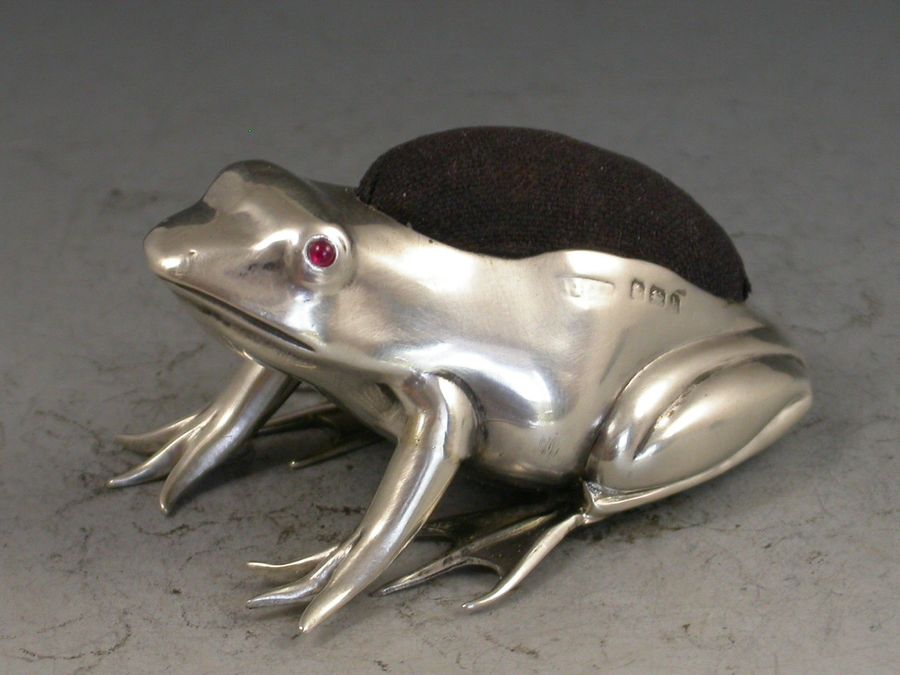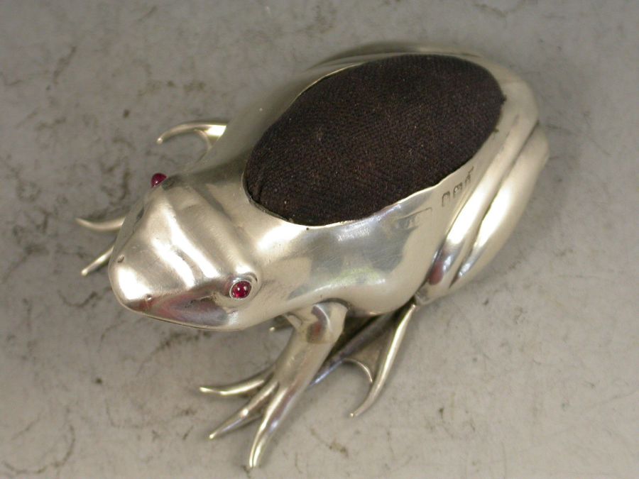 A good Edwardian novelty silver Pin Cushion made in the form of a crouching frog, with blue velvet cushion and ruby red glass eyes.