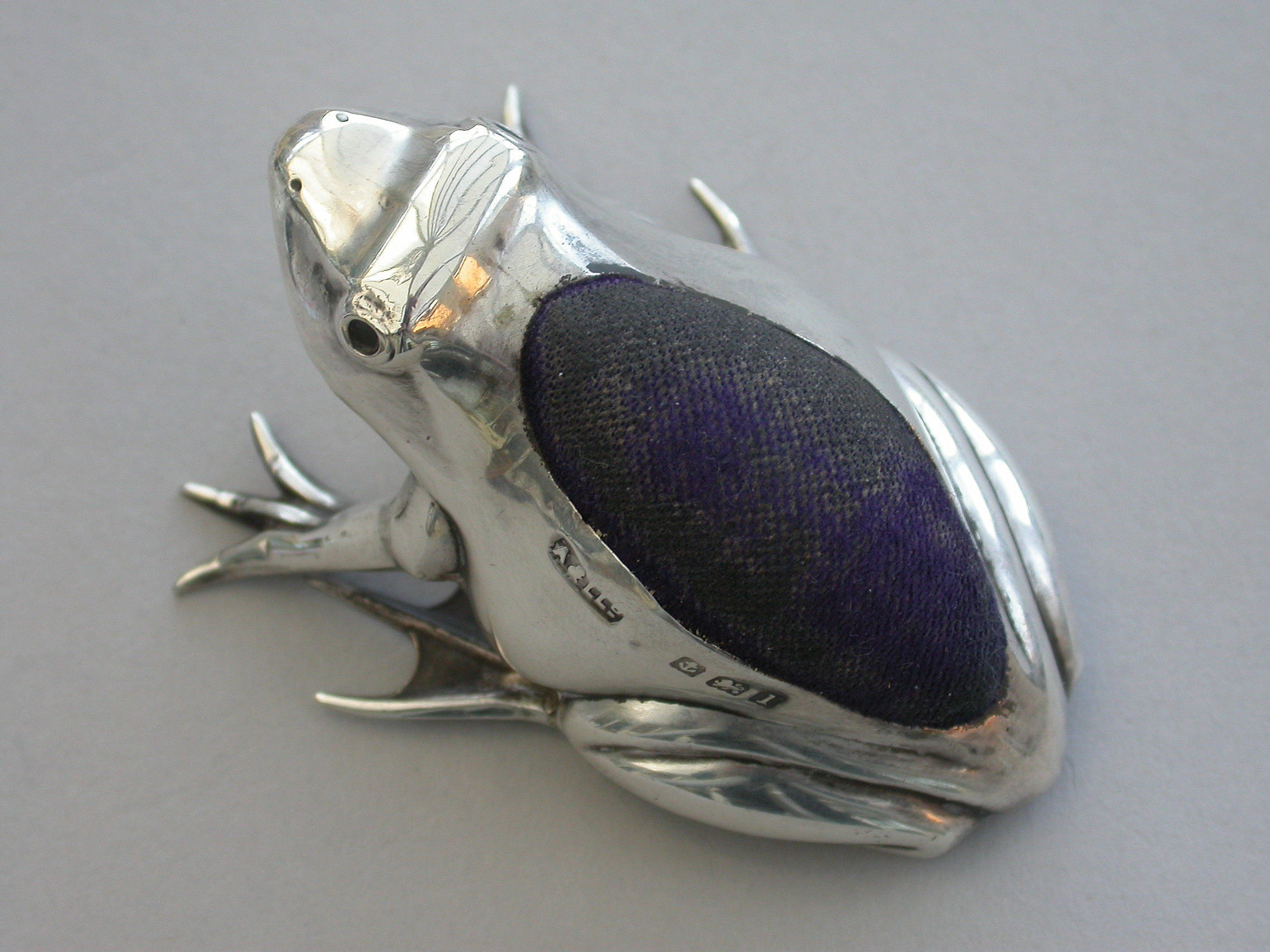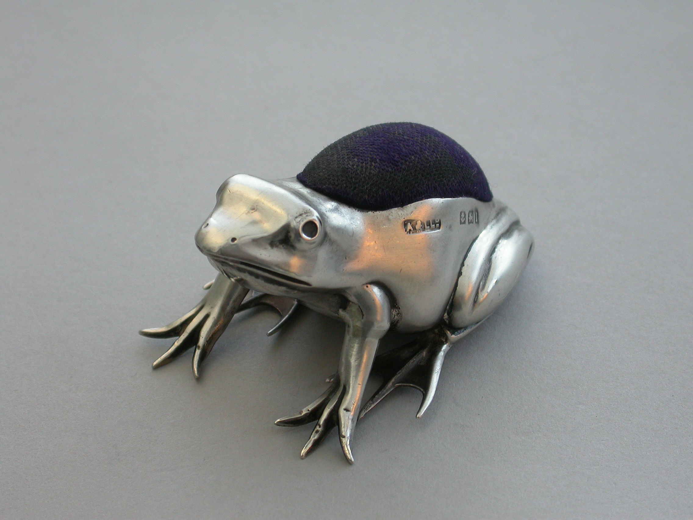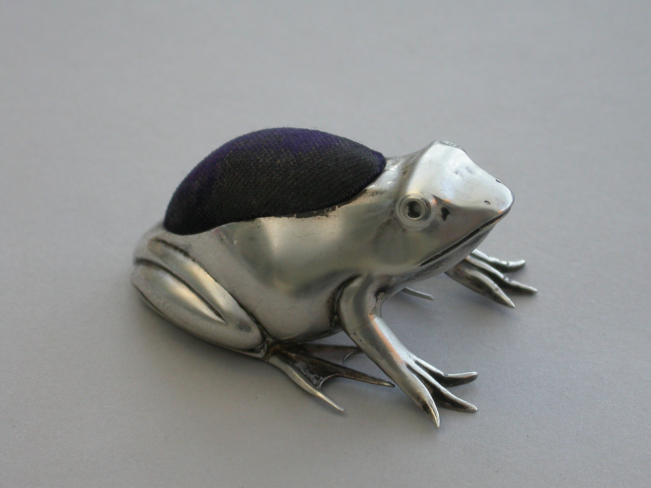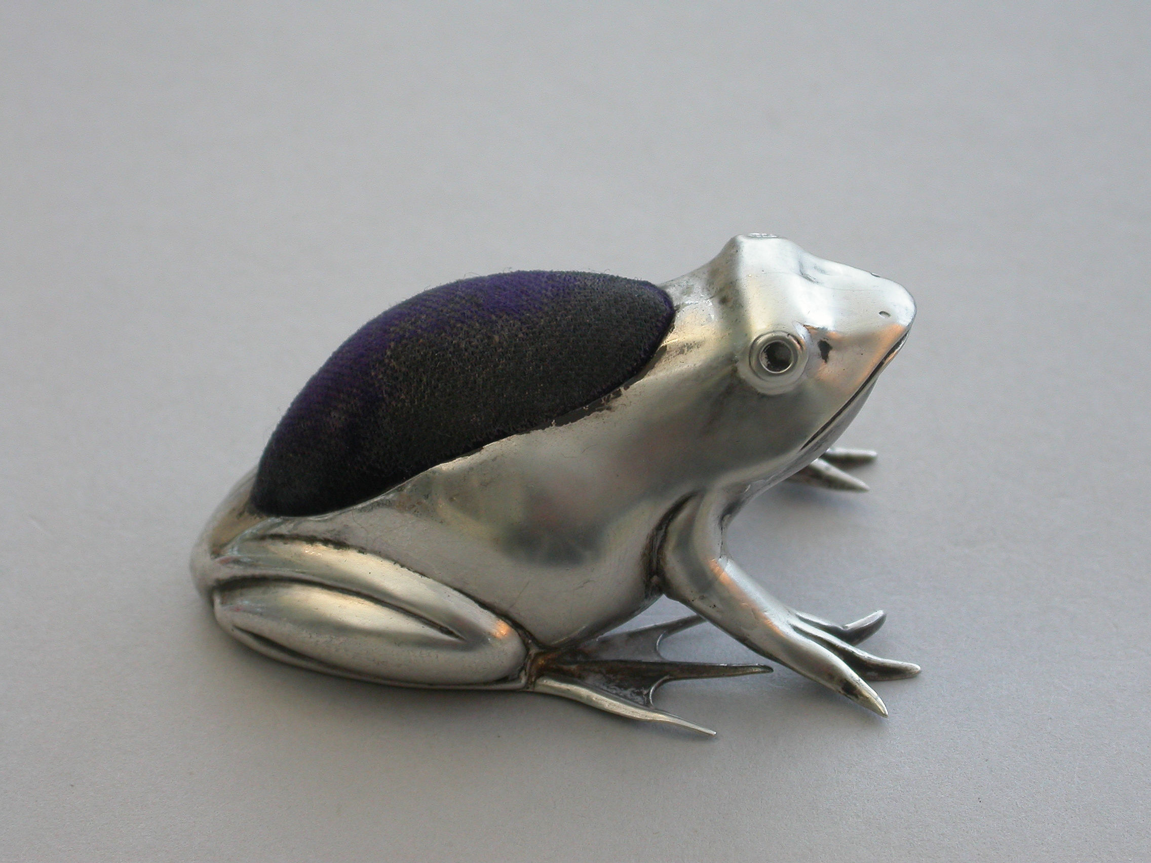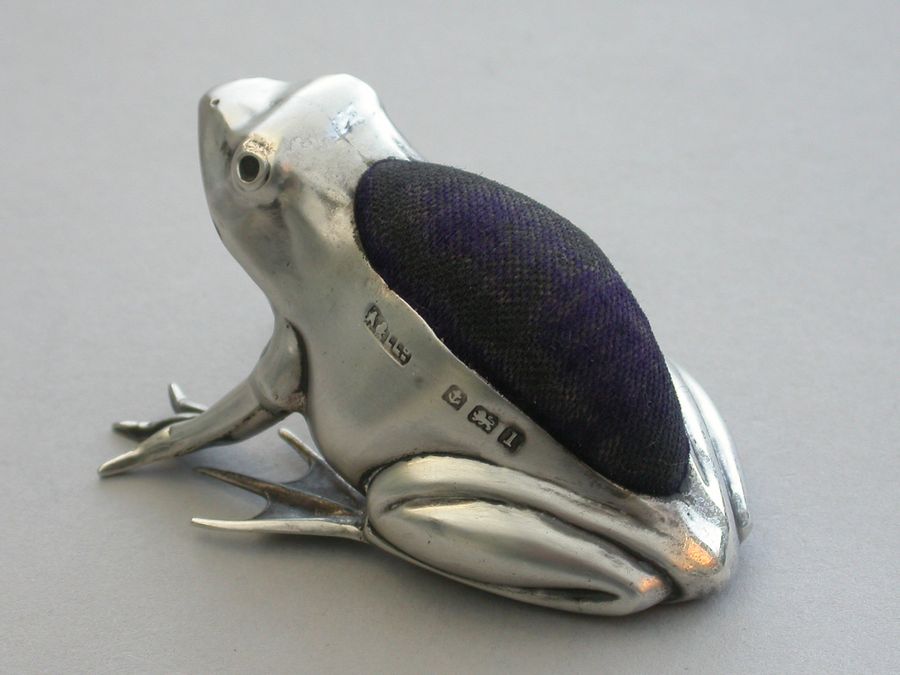 A good Edwardian novelty silver Pin Cushion made in the form of a crouching frog.