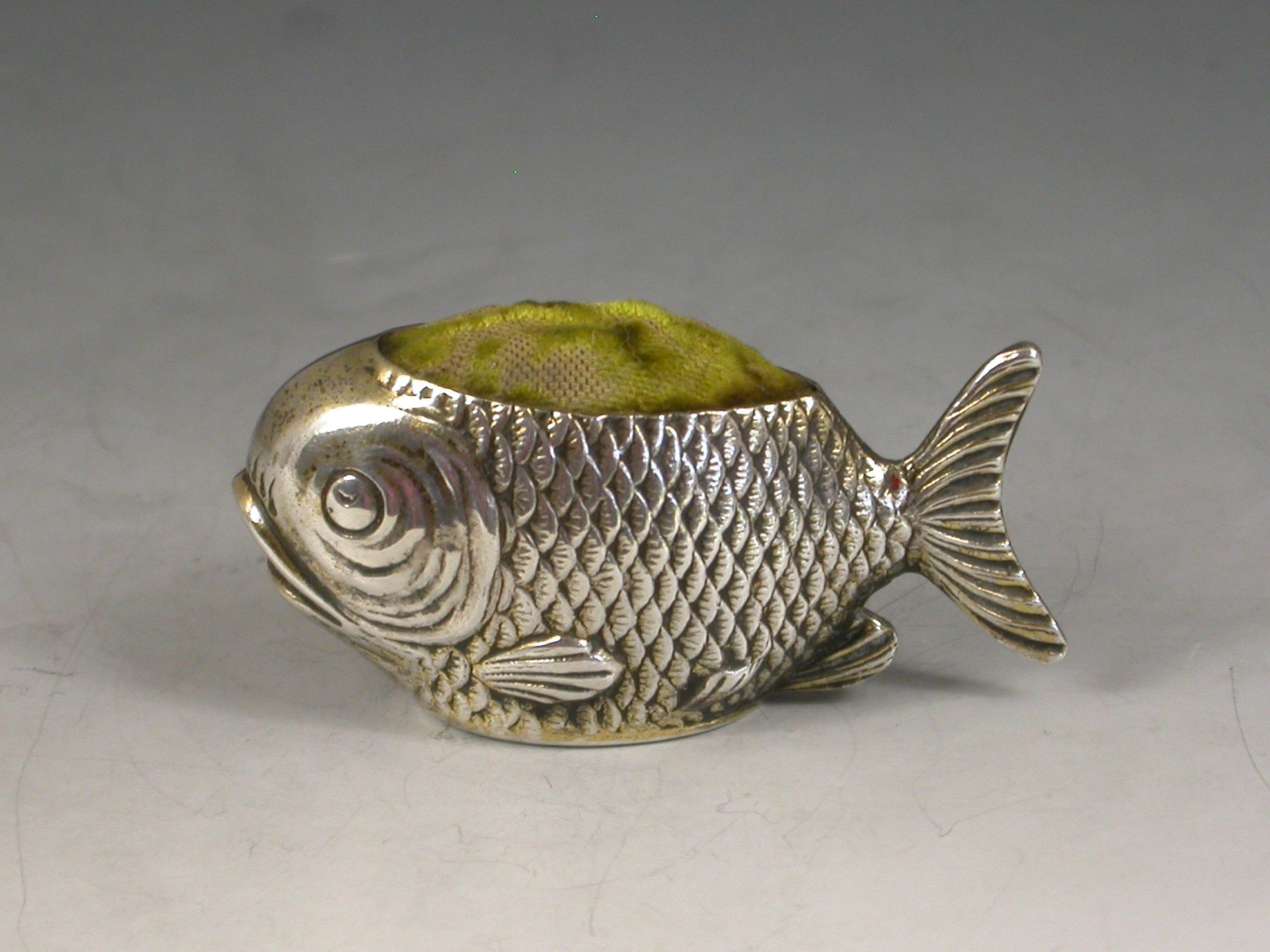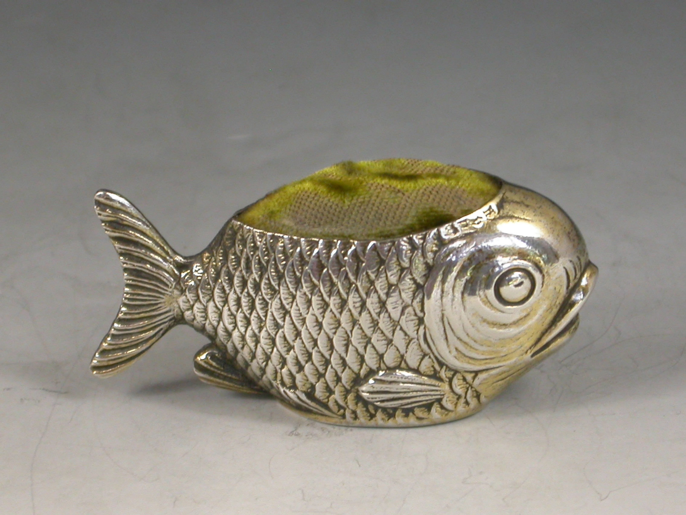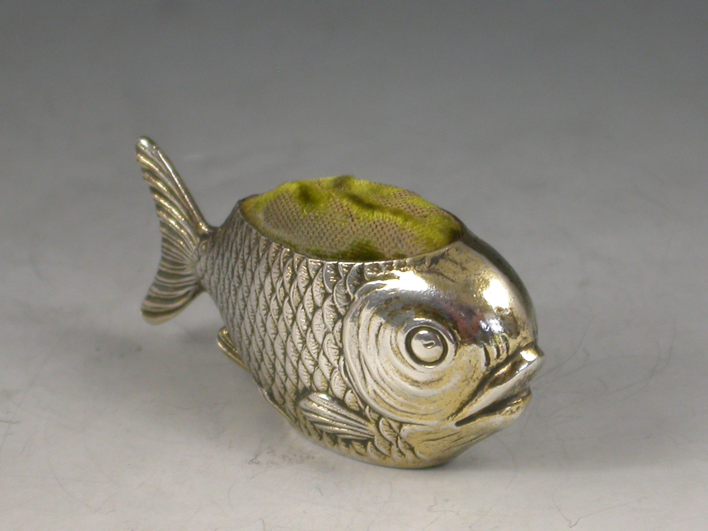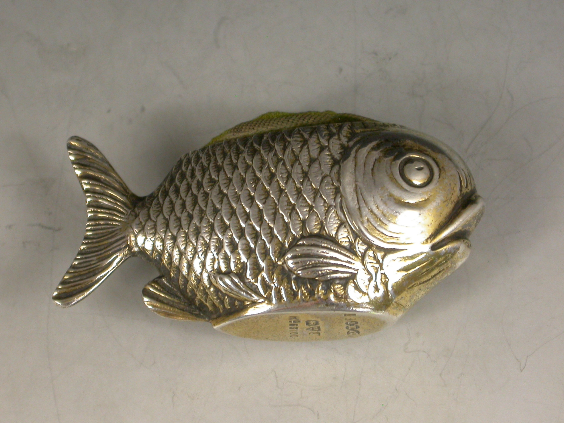 A rare early 20th century novelty silver gilt Pin cushion made in the form of a fish, complete with original green velvet cushion.