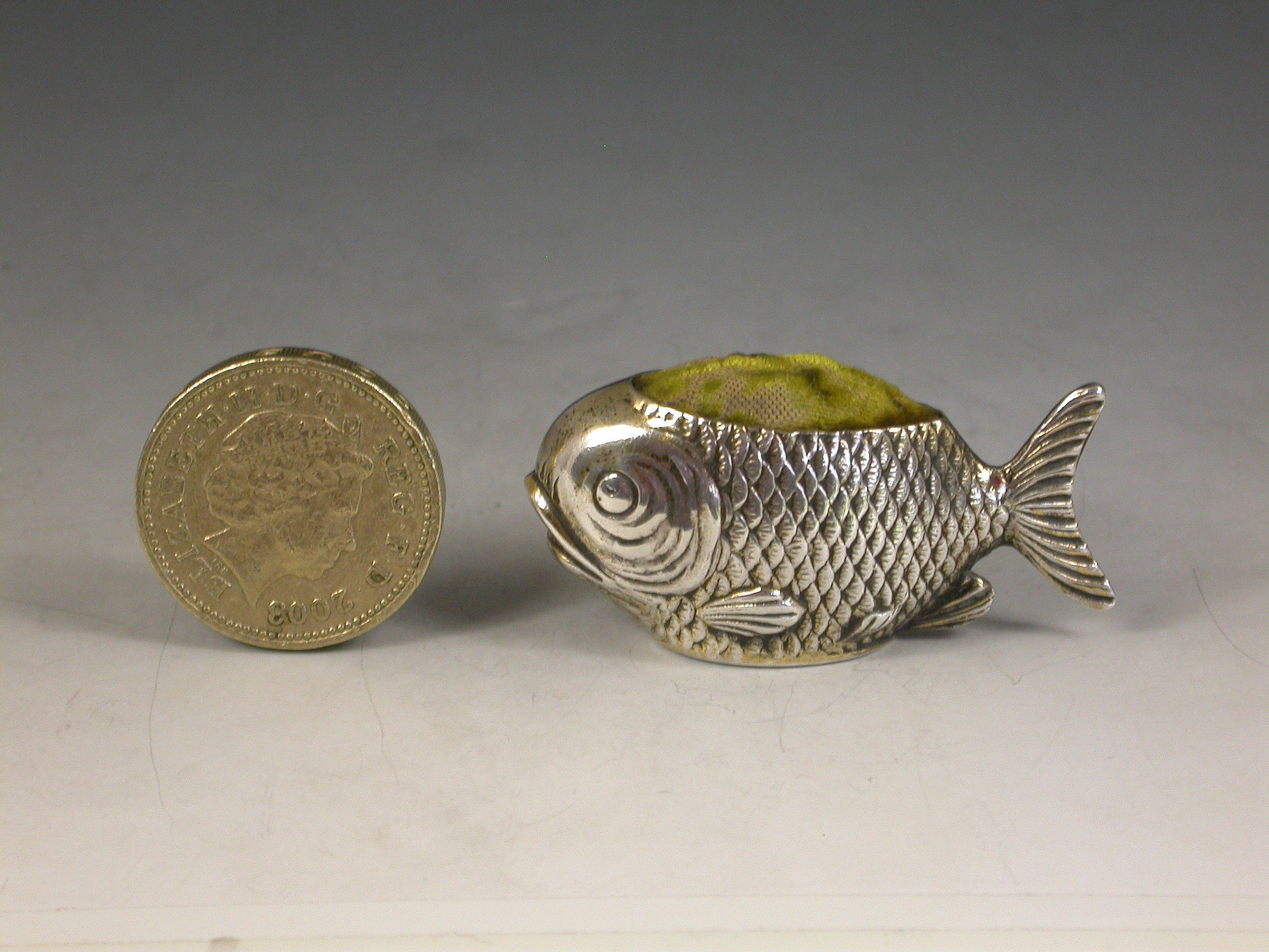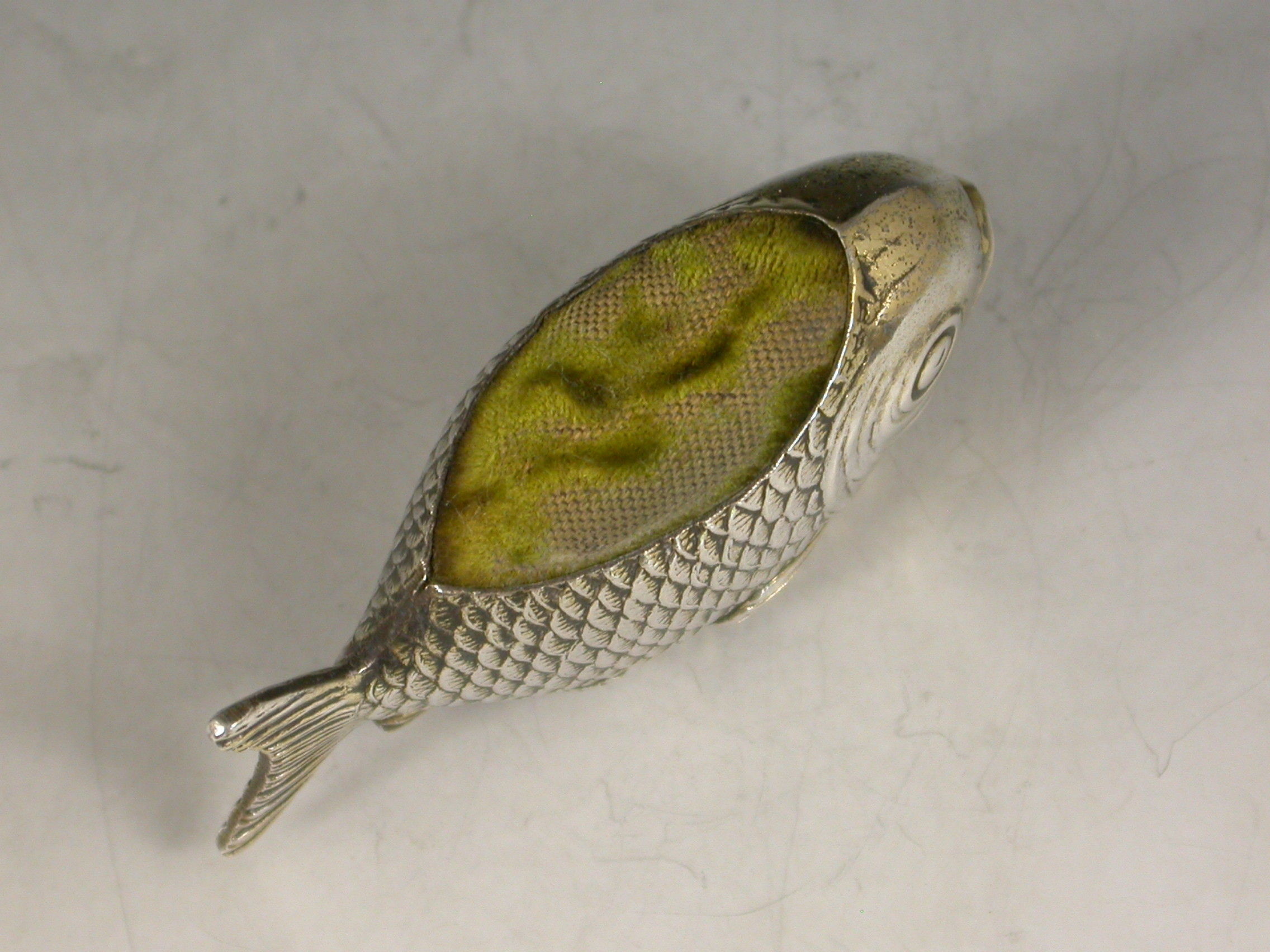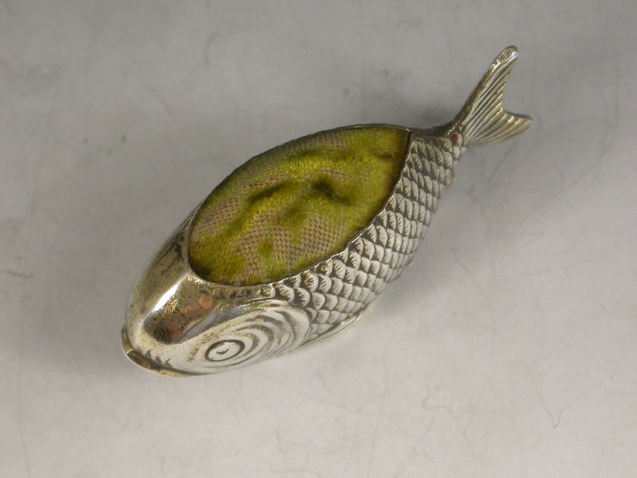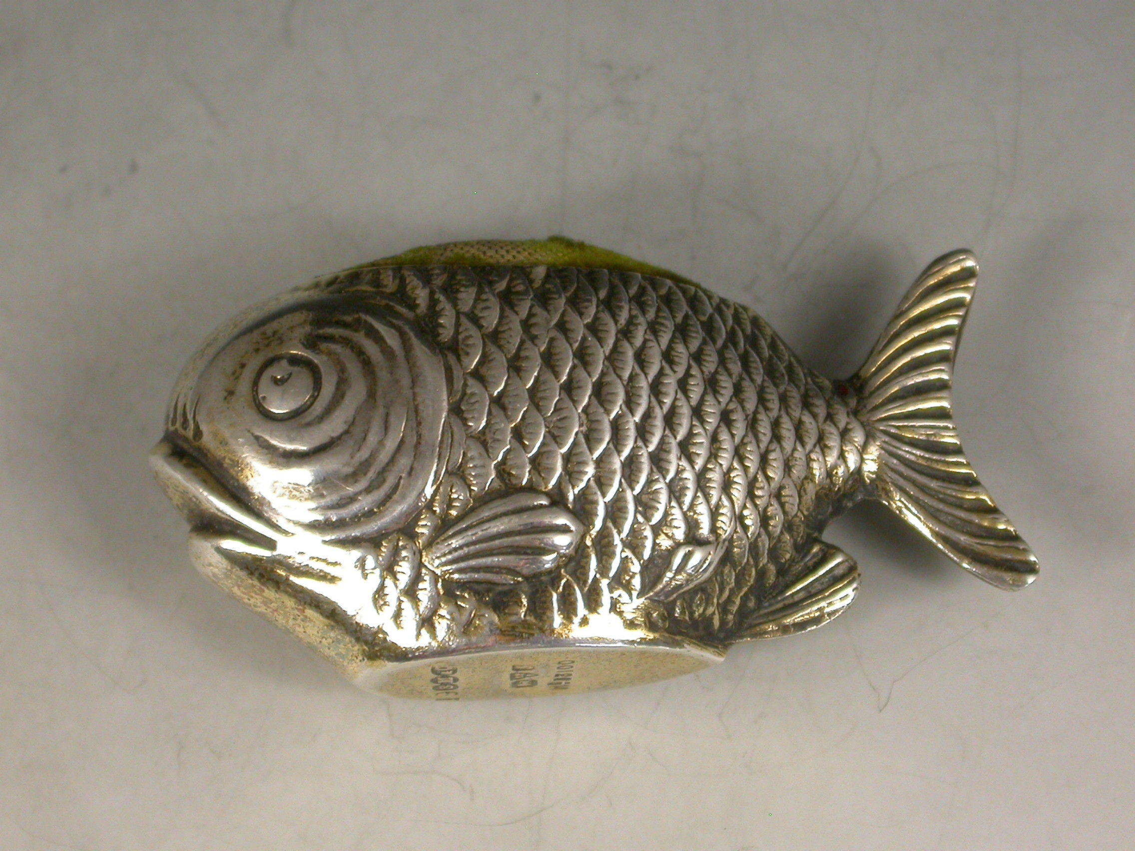 A rare early 20th century novelty silver gilt Pin cushion made in the form of a fish, complete with original green velvet cushion.
