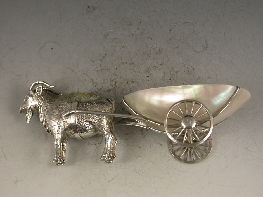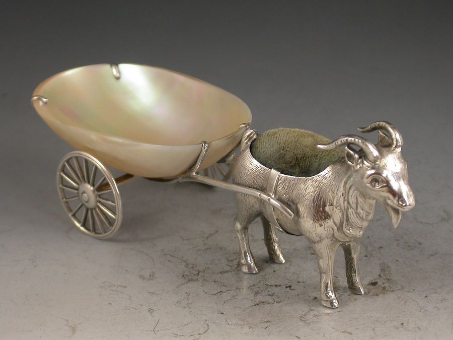 A rare Edwardian novelty silver Pin cushion made in the form of a Goat pulling a mother of pearl cart with two revolving silver wheels.