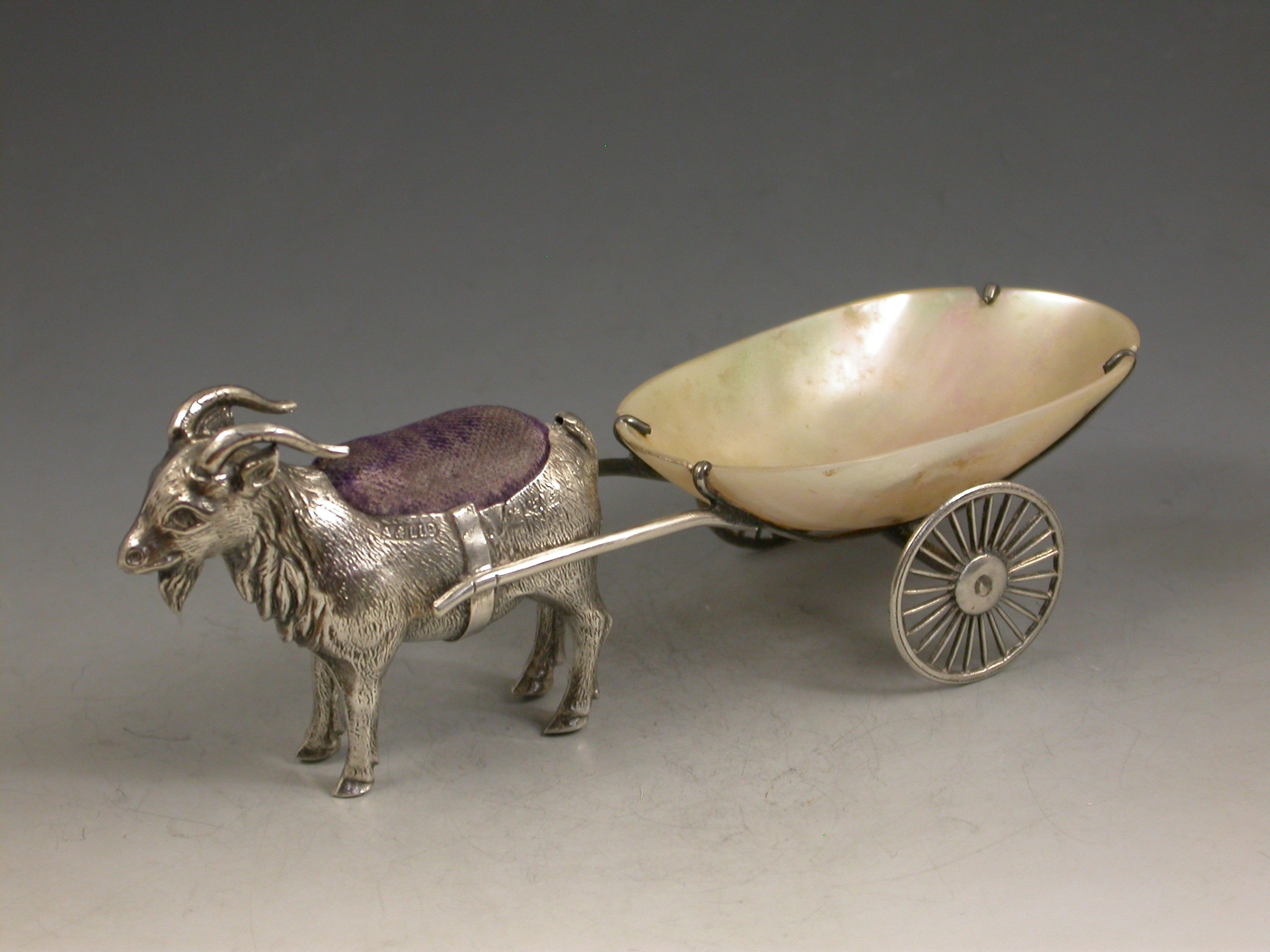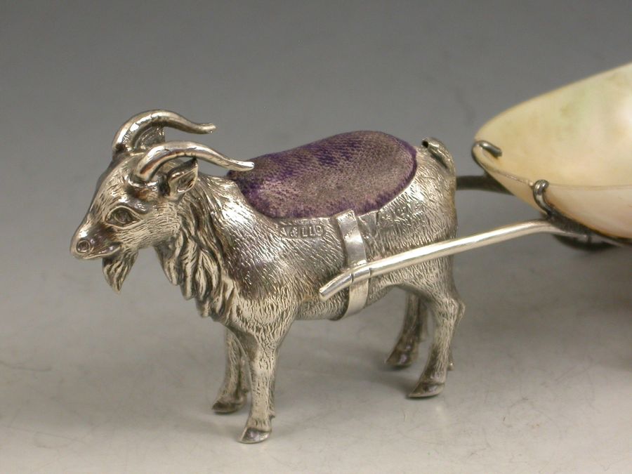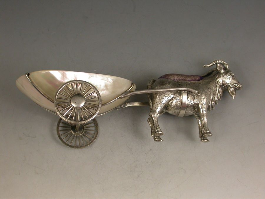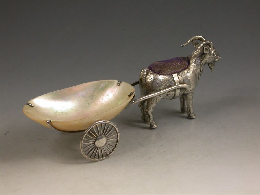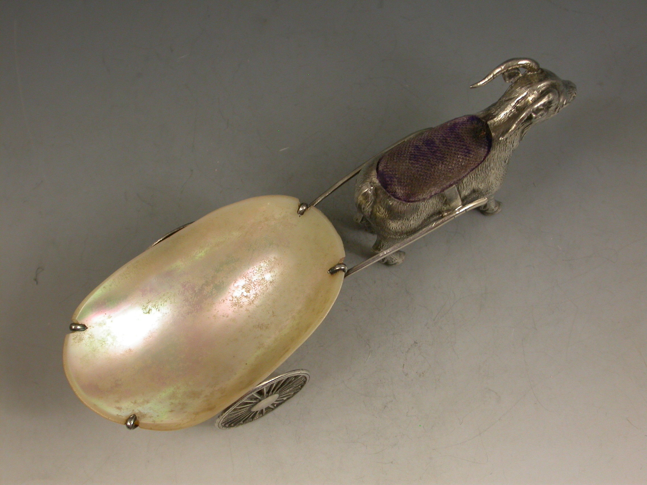 An extremely rare George V novelty silver Pin Cushion, modeled as a Goat pulling a shaped Mother of Pearl cart on two wheels. The Goat realistically modeled with fine detail and complete with original blue velvet cushion.