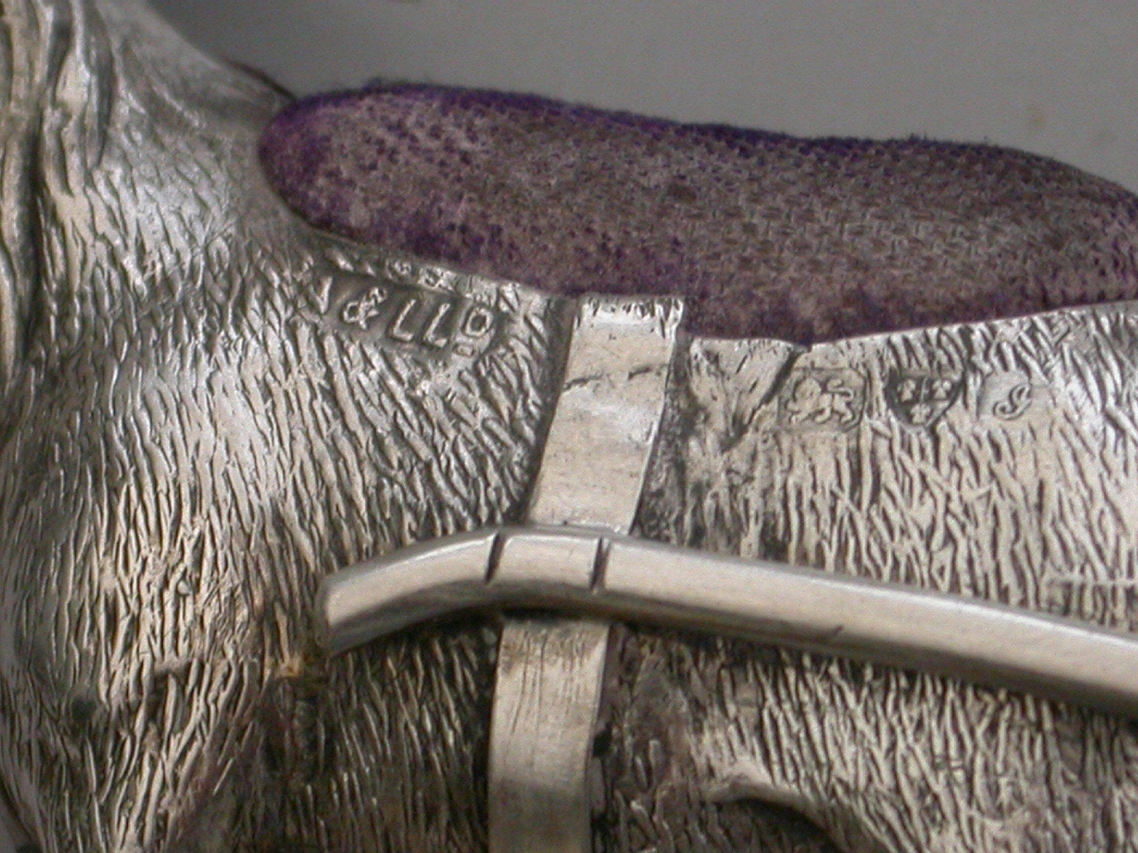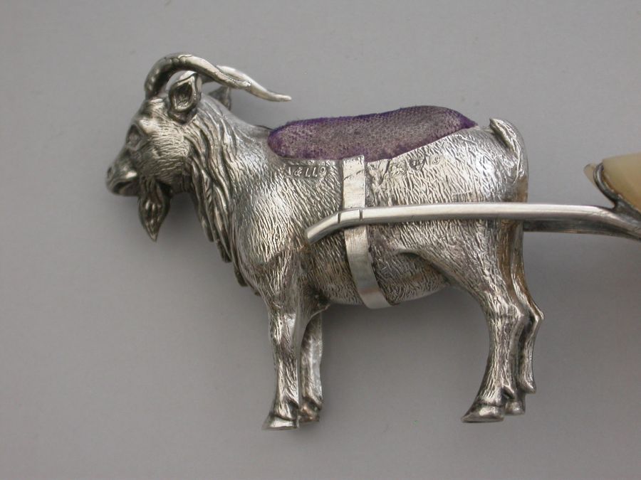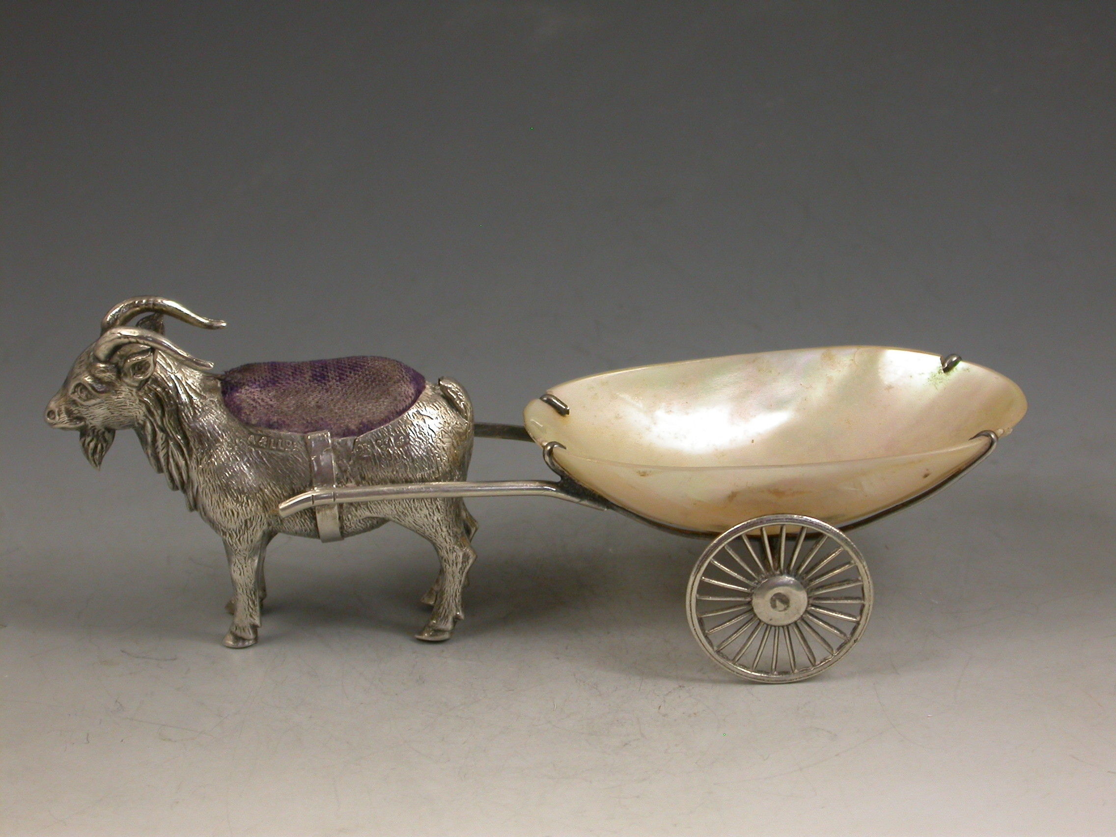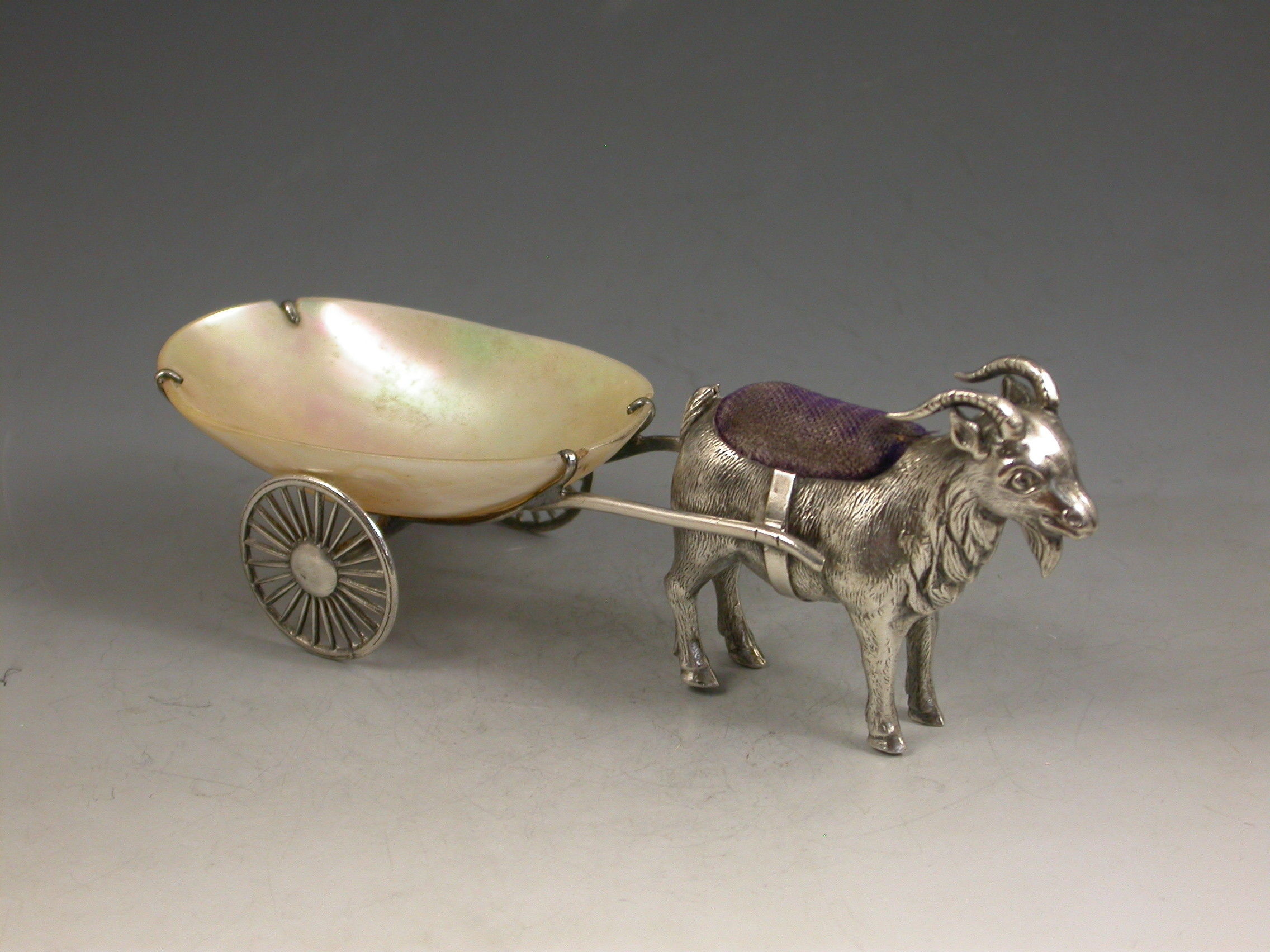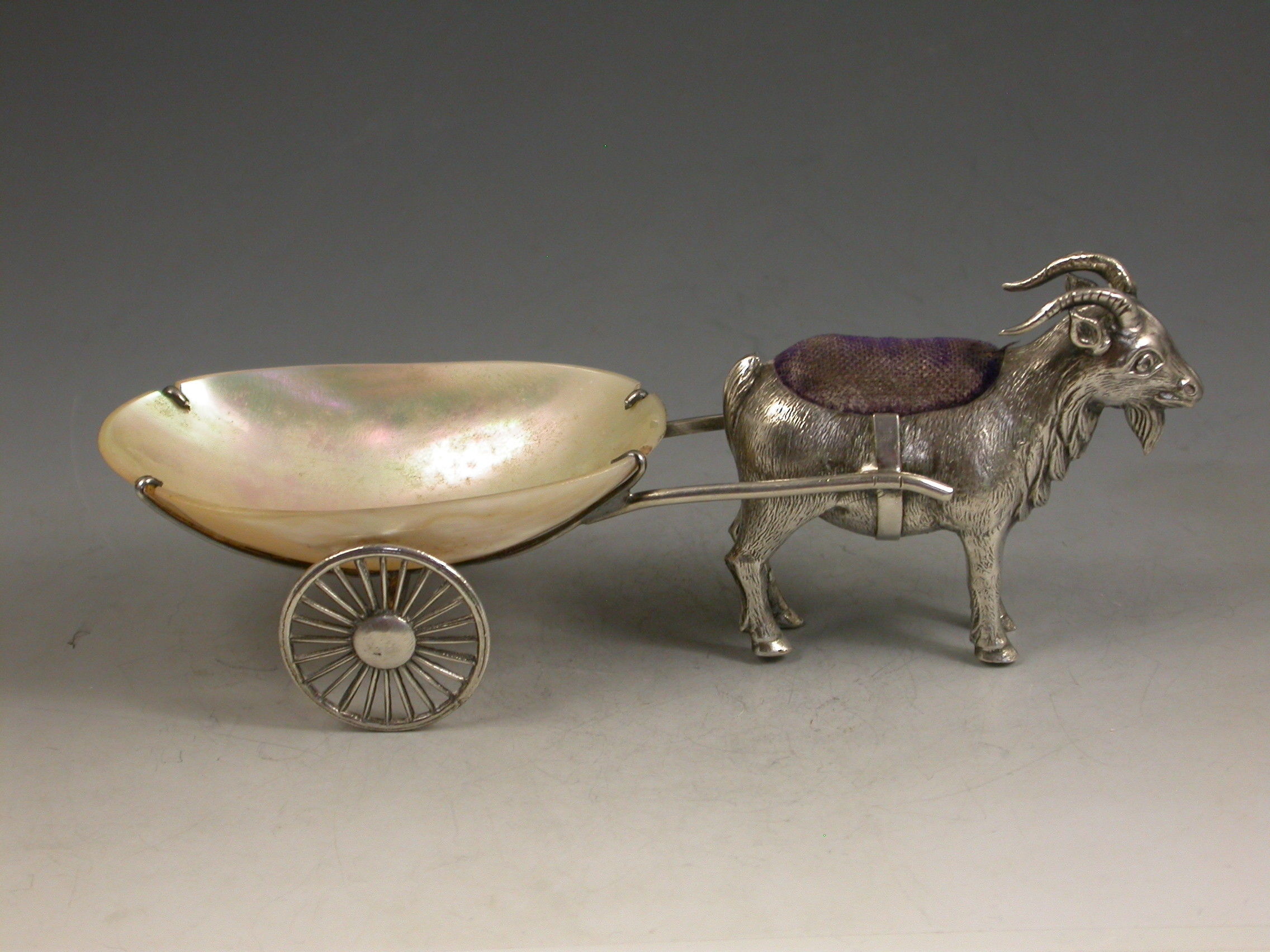 An extremely rare George V novelty silver Pin Cushion, modeled as a Goat pulling a shaped Mother of Pearl cart on two wheels. The Goat realistically modeled with fine detail and complete with original blue velvet cushion.