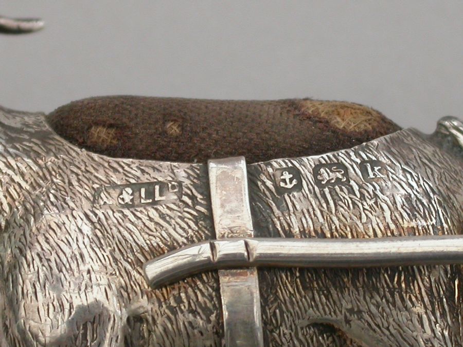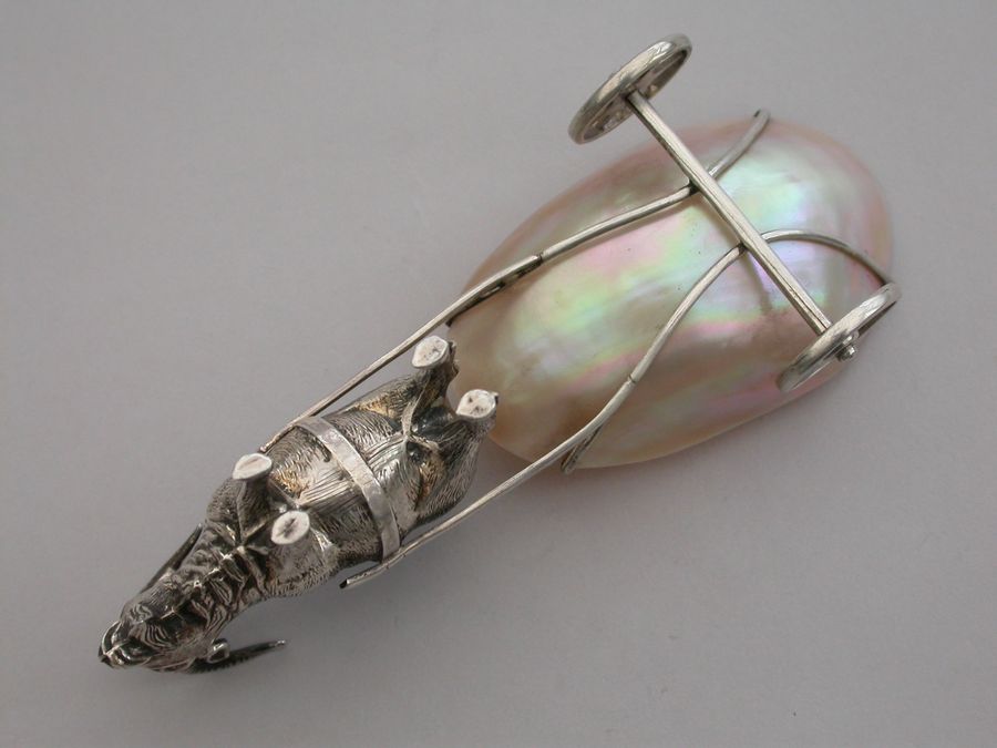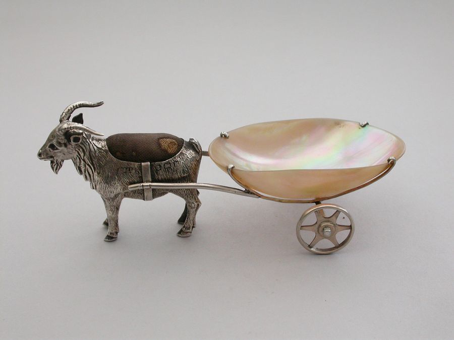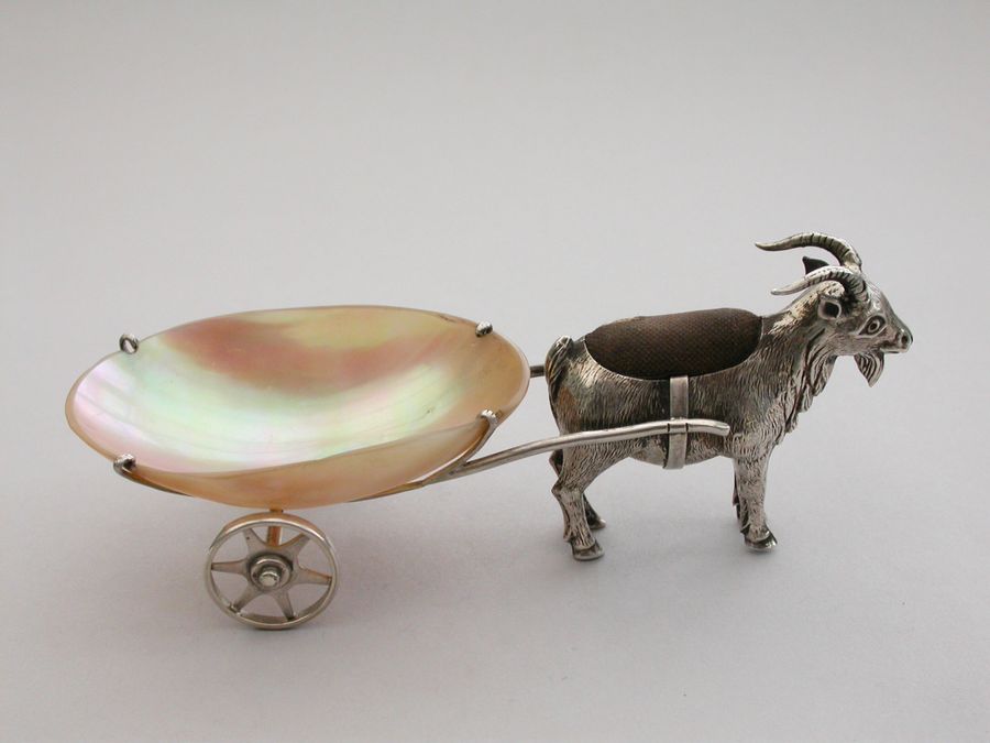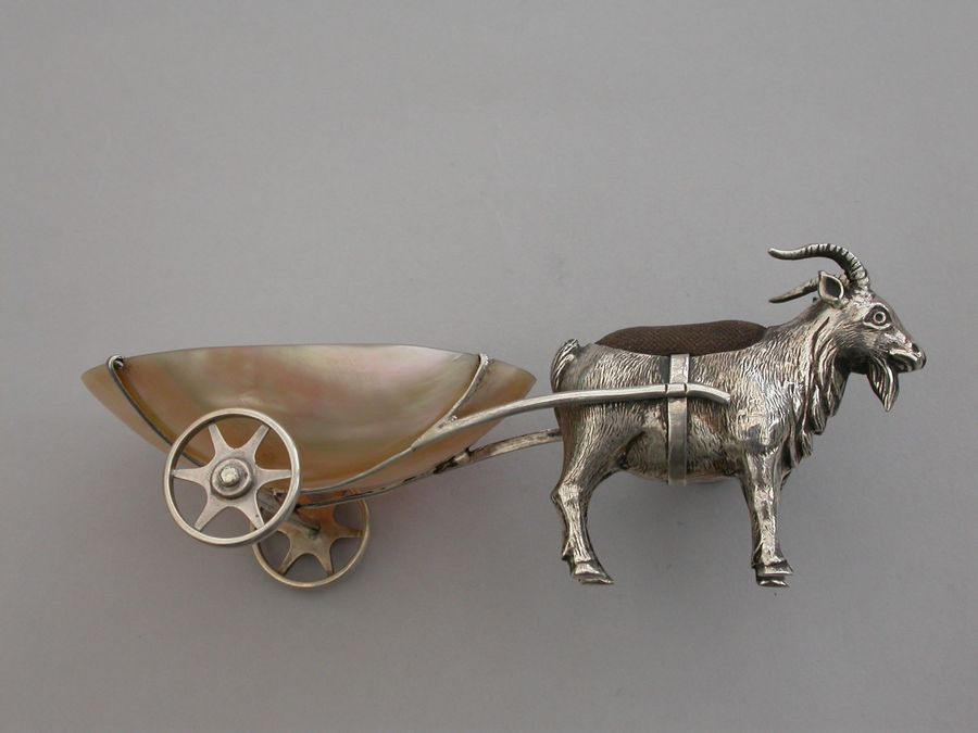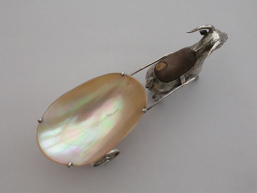 An extremely rare Edwardian novelty silver Pin Cushion, modeled as a Goat pulling a shaped Mother of Pearl cart on two wheels. The Goat realistically modeled with fine detail and complete with original velvet cushion.