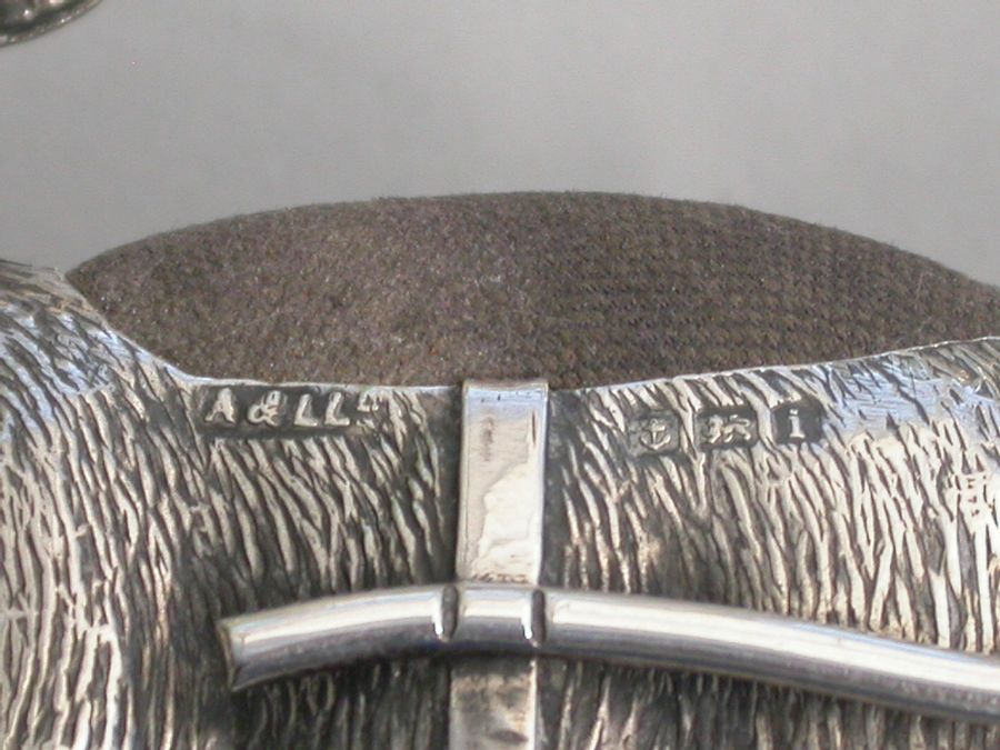 An extremely rare Edwardian novelty silver Pin Cushion, modeled as a Goat pulling a shaped Mother of Pearl cart on two wheels. The Goat realistically modeled with fine detail and complete with original velvet cushion.