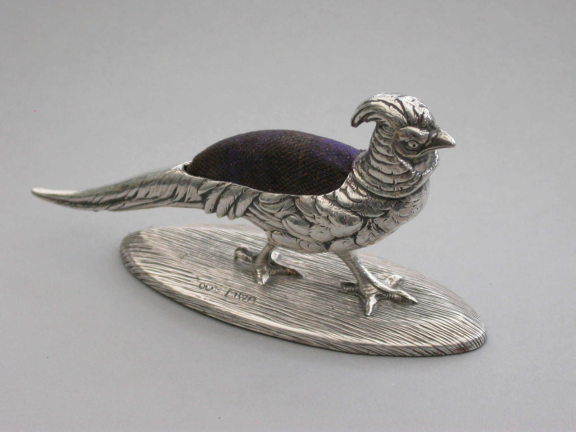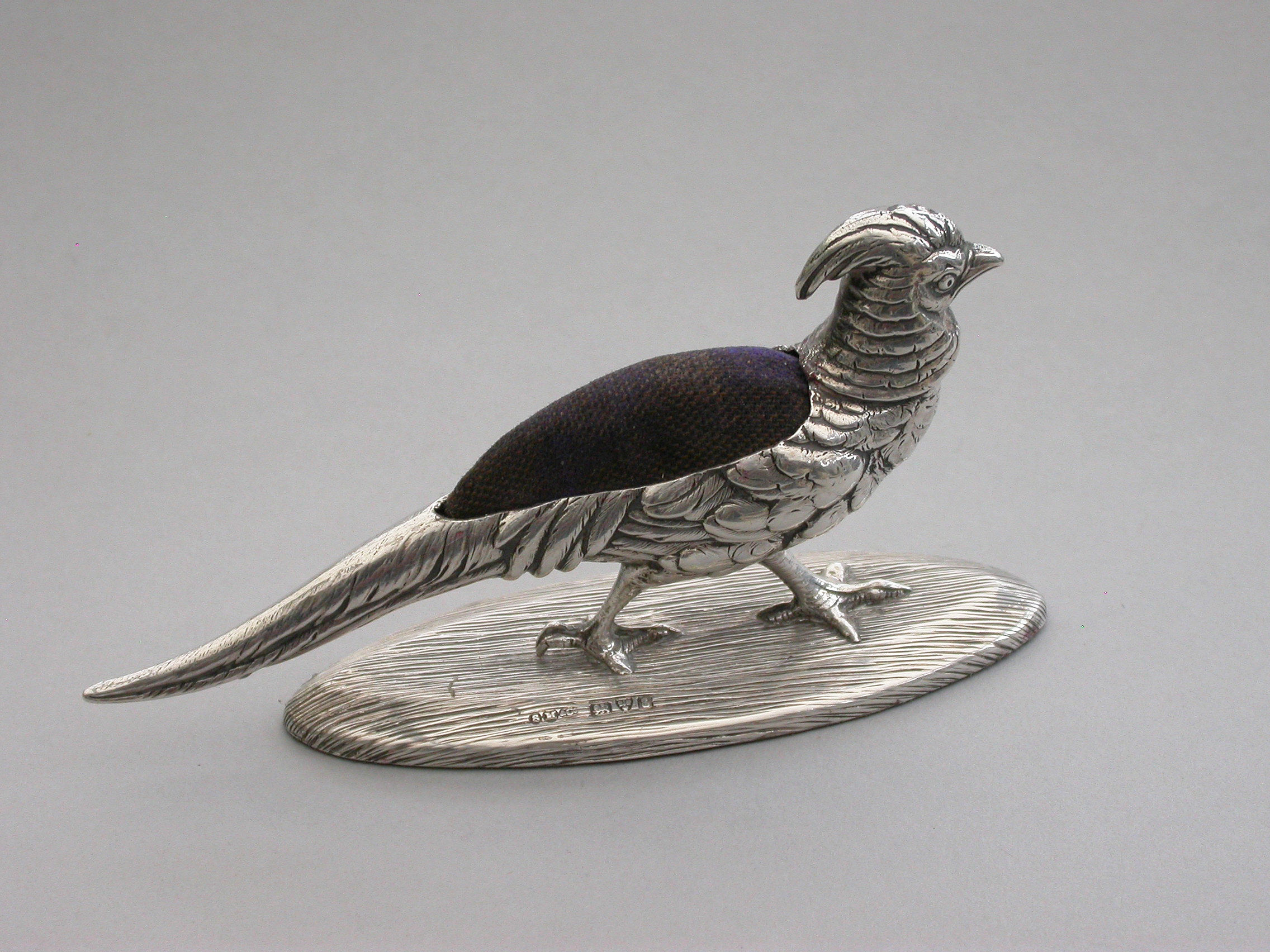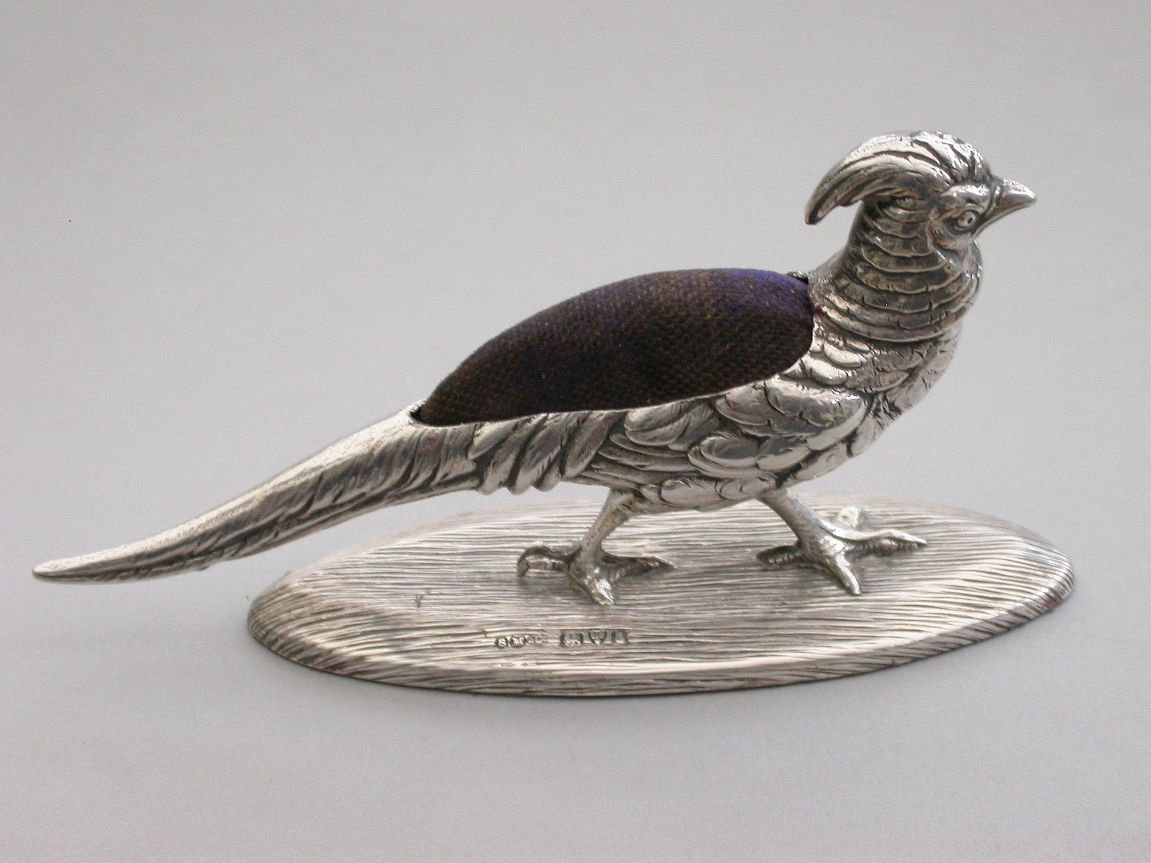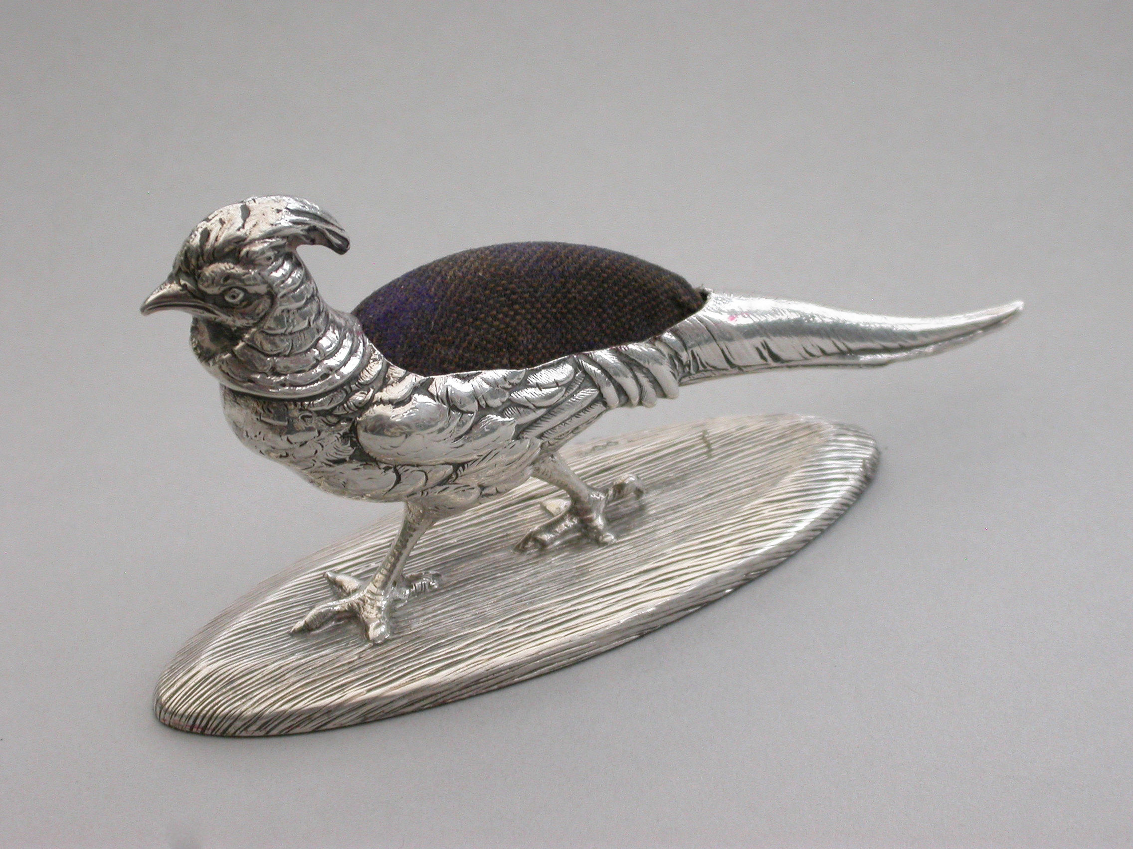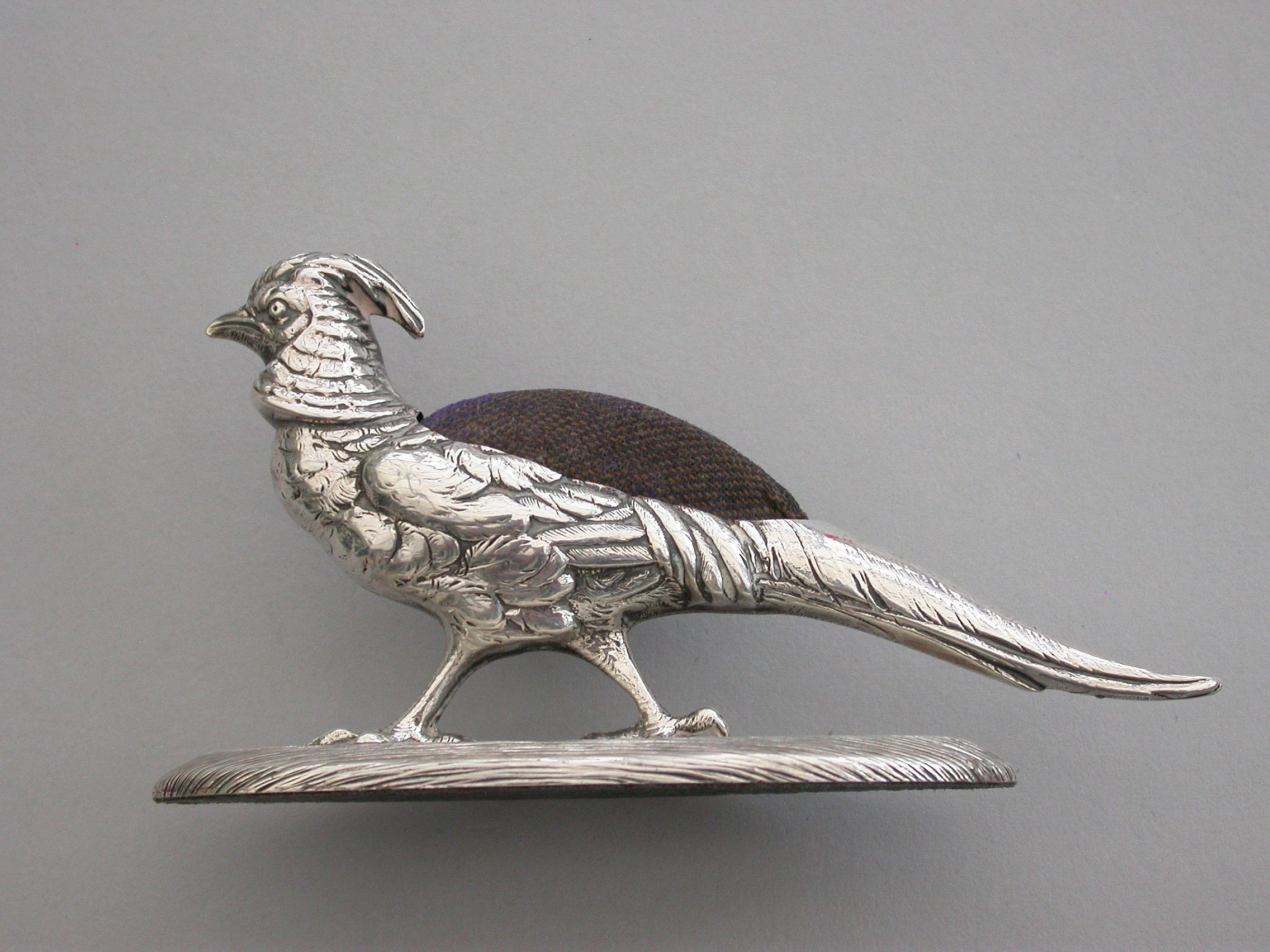A good quality Edwardian novelty silver Pin Cushion made in the form of a Golden Pheasant, standing on a textured oval silver base, with fine feather detailing and complete with original blue velvet cushion