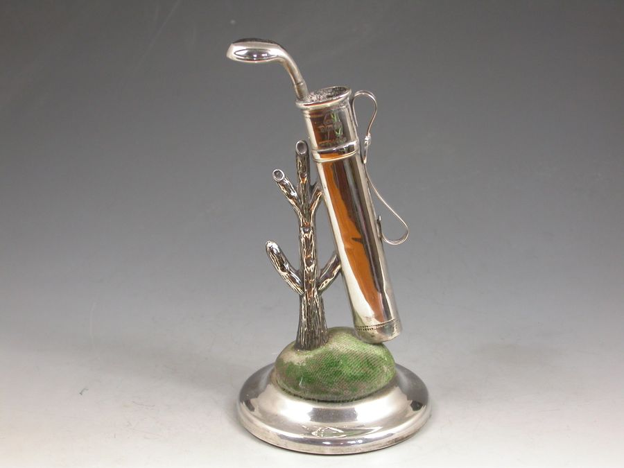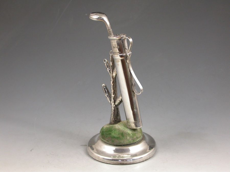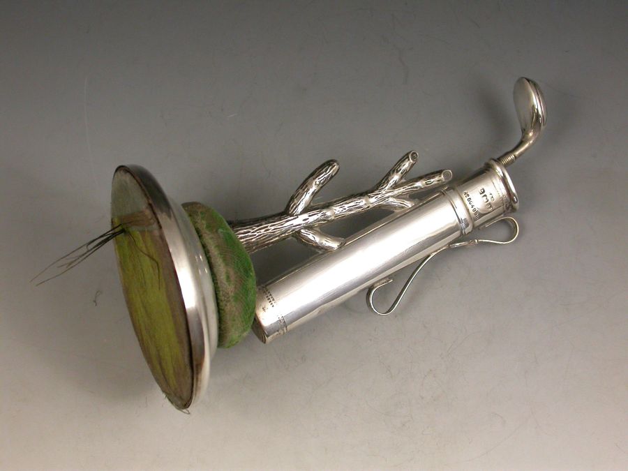 A good Edwardian novelty silver combined Hat Pin Cushion and Ring Tree modeled as a golf bag containing a single golf club leaning against a tree stump. Complete with original green velvet cushion on circular silver pedestal base.