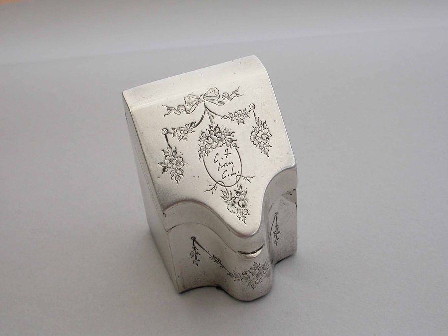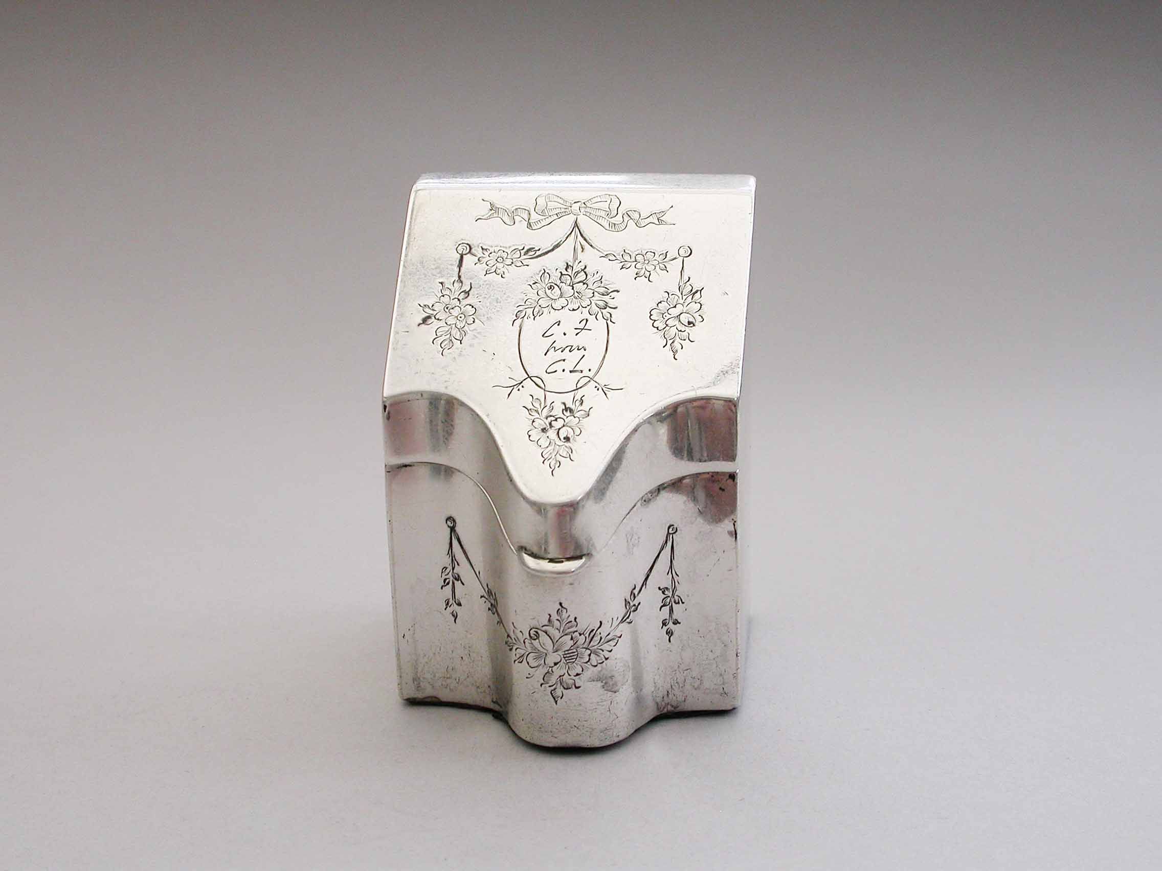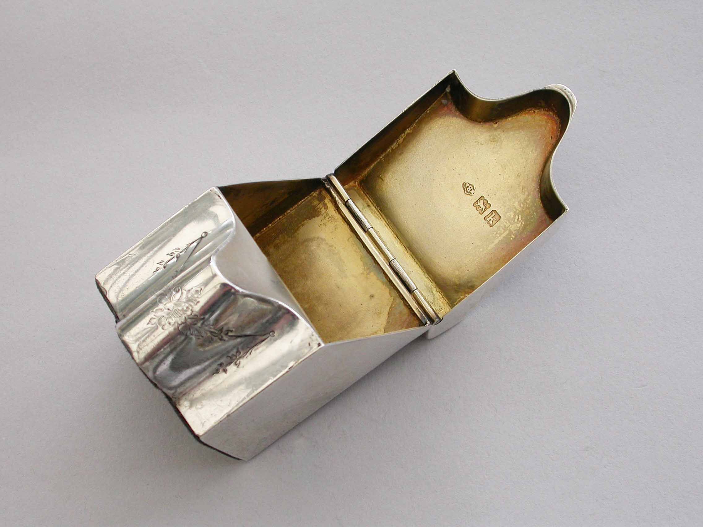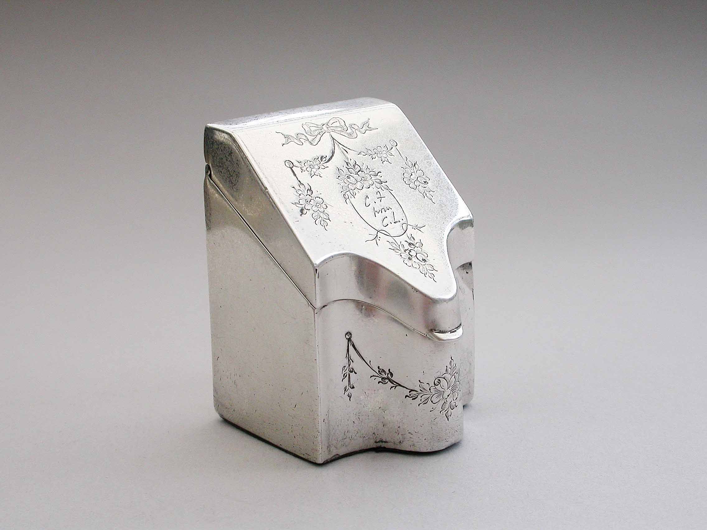 A rare Edwardian novelty silver Stamp Box modeled as a wooden Knife Box, the bow front and sloping hinged lid engraved with floral garlands and an oval cartouche engraved with contemporary initials, the interior with single gilded sloping compartment.