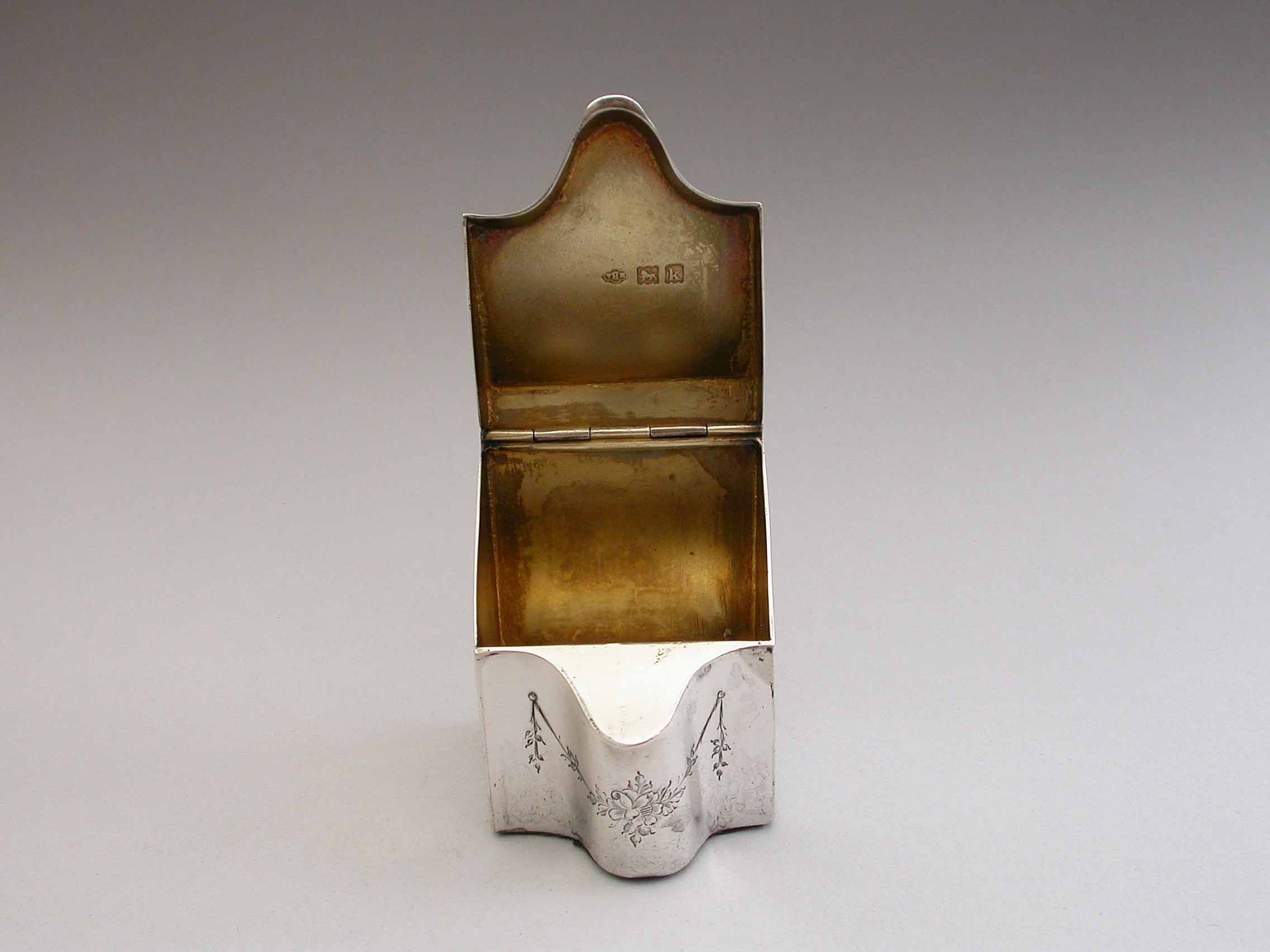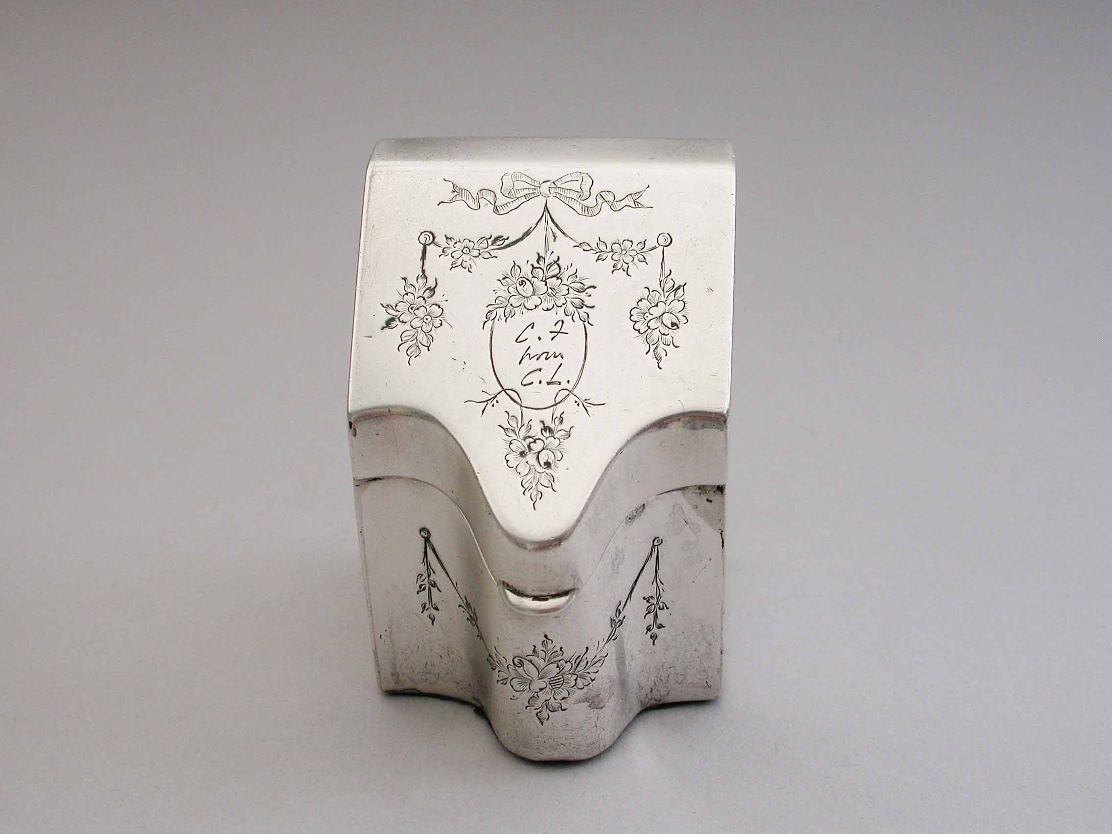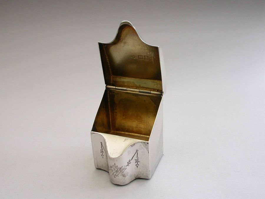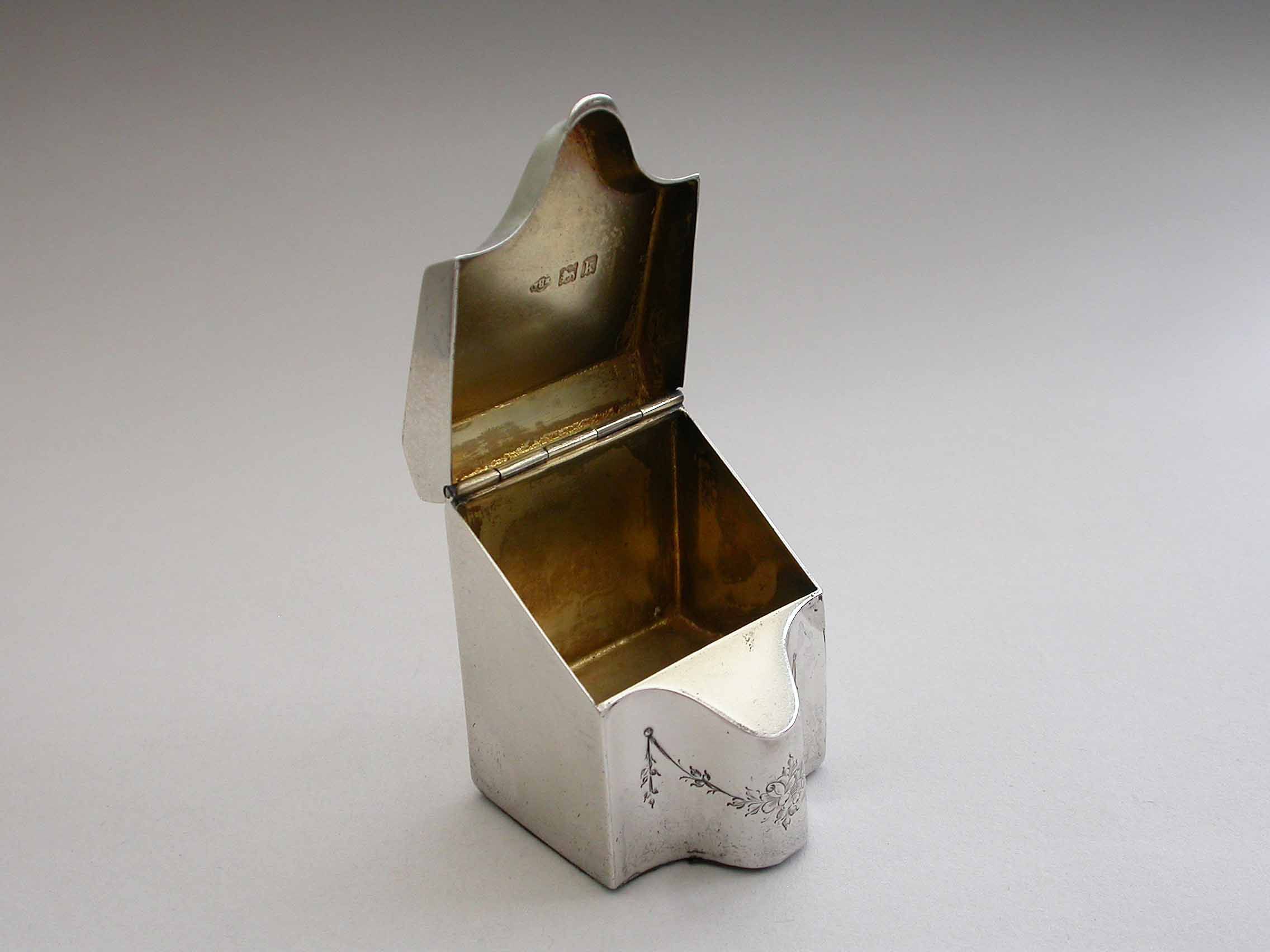 A rare Edwardian novelty silver Stamp Box modeled as a wooden Knife Box, the bow front and sloping hinged lid engraved with floral garlands and an oval cartouche engraved with contemporary initials, the interior with single gilded sloping compartment.