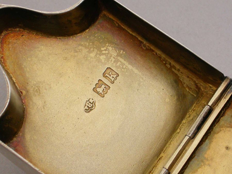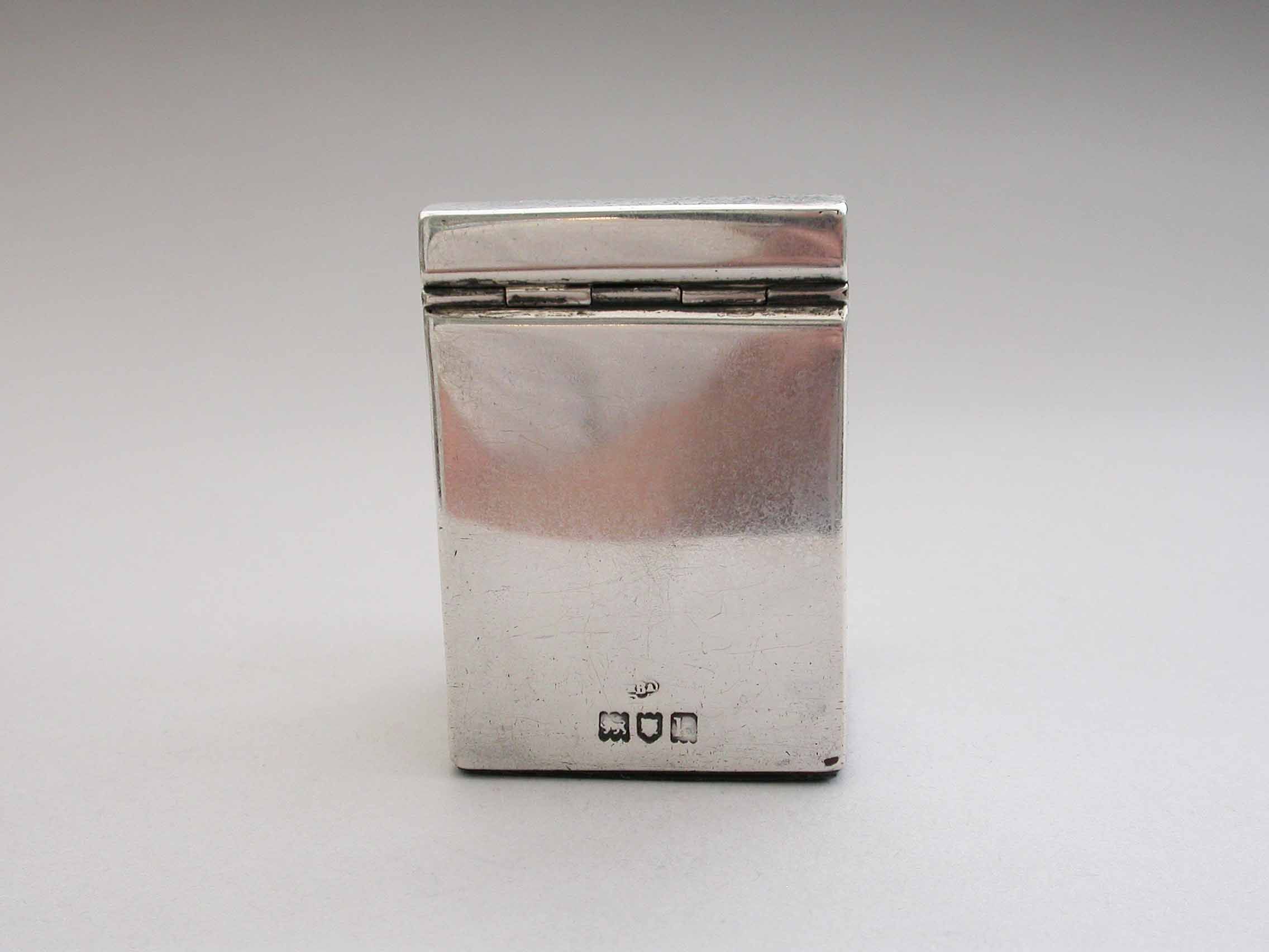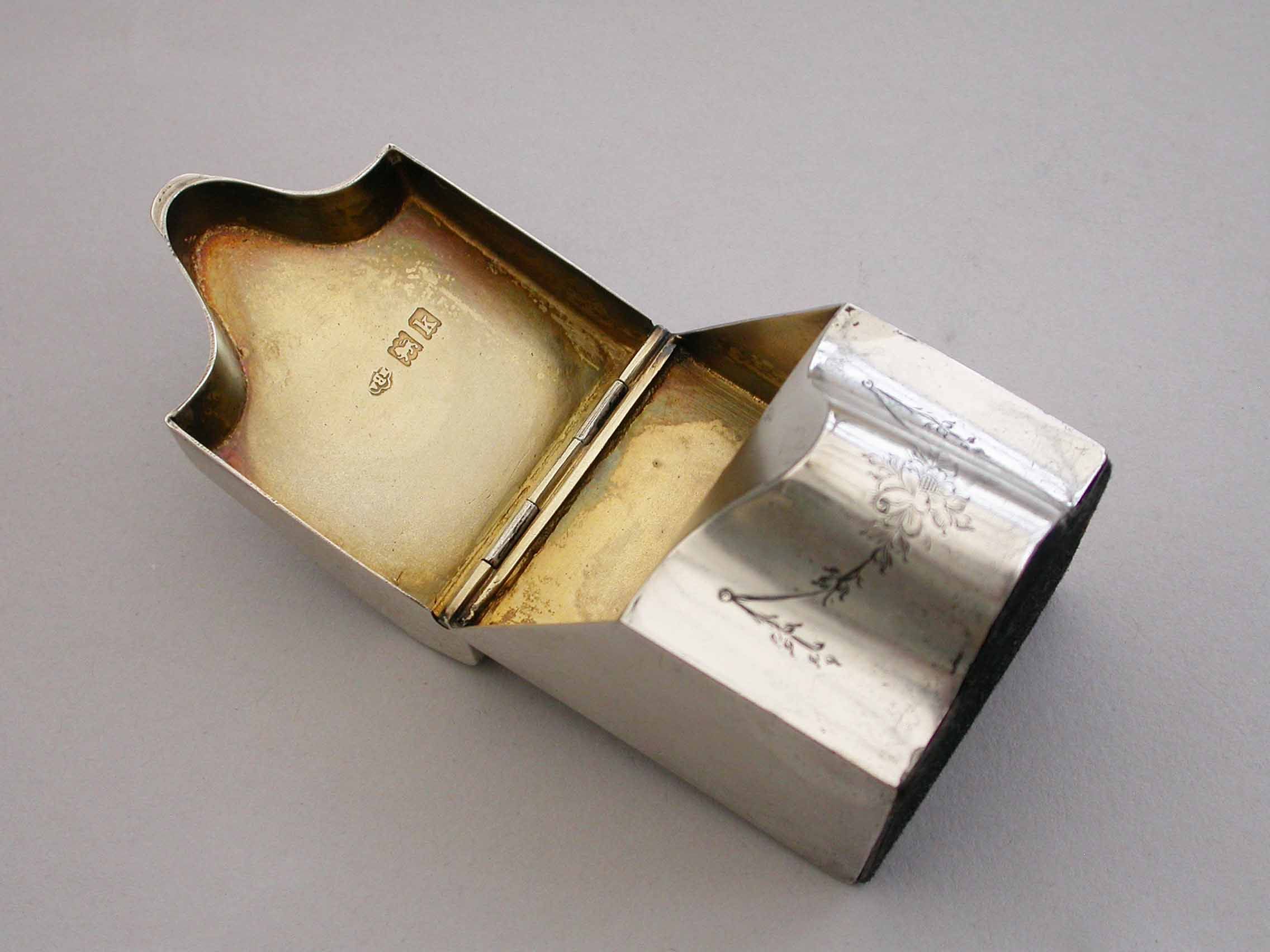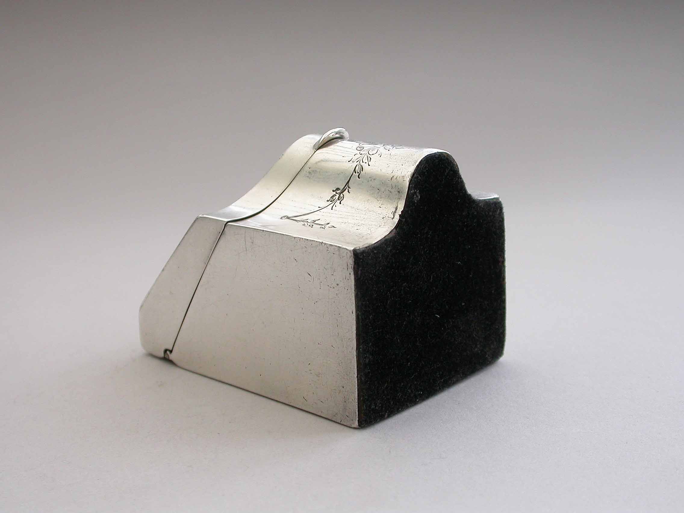 A rare Edwardian novelty silver Stamp Box modeled as a wooden Knife Box, the bow front and sloping hinged lid engraved with floral garlands and an oval cartouche engraved with contemporary initials, the interior with single gilded sloping compartment.