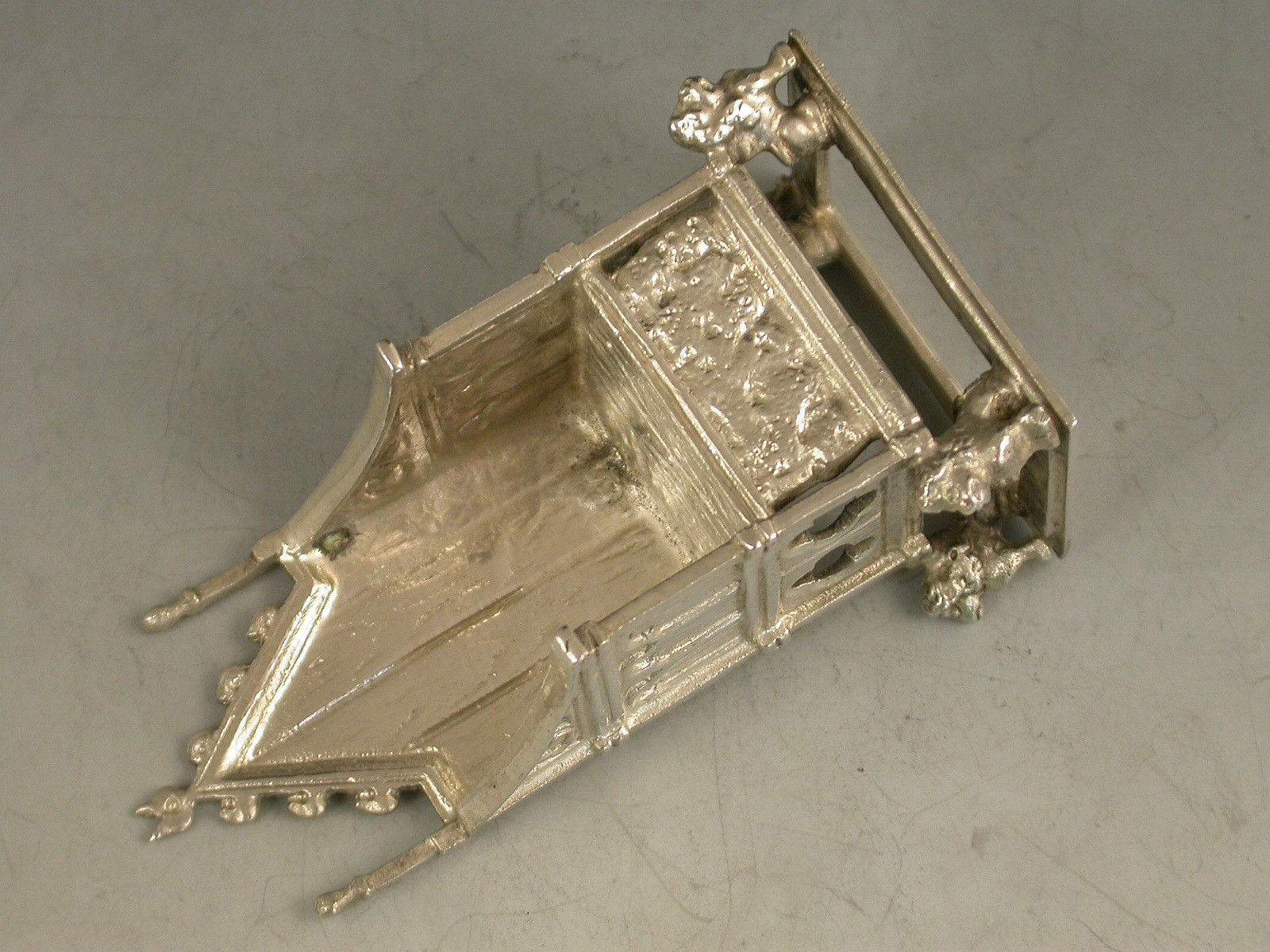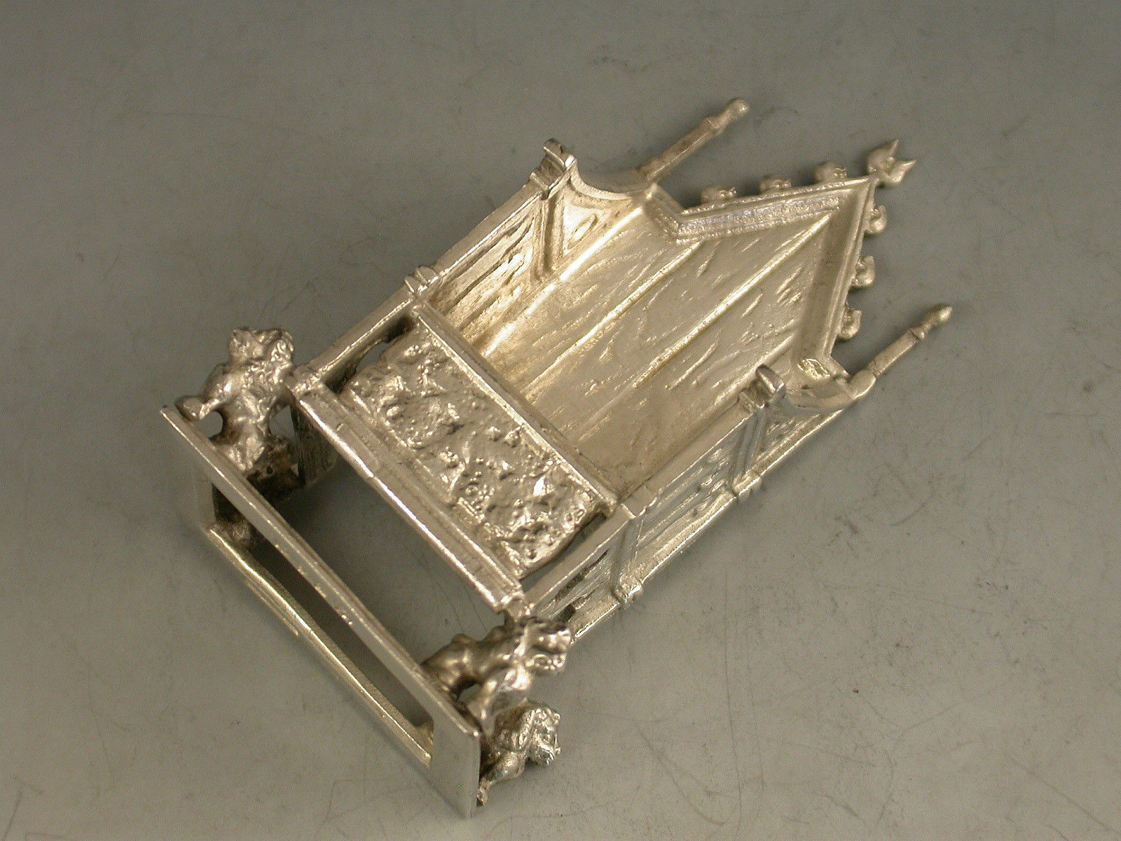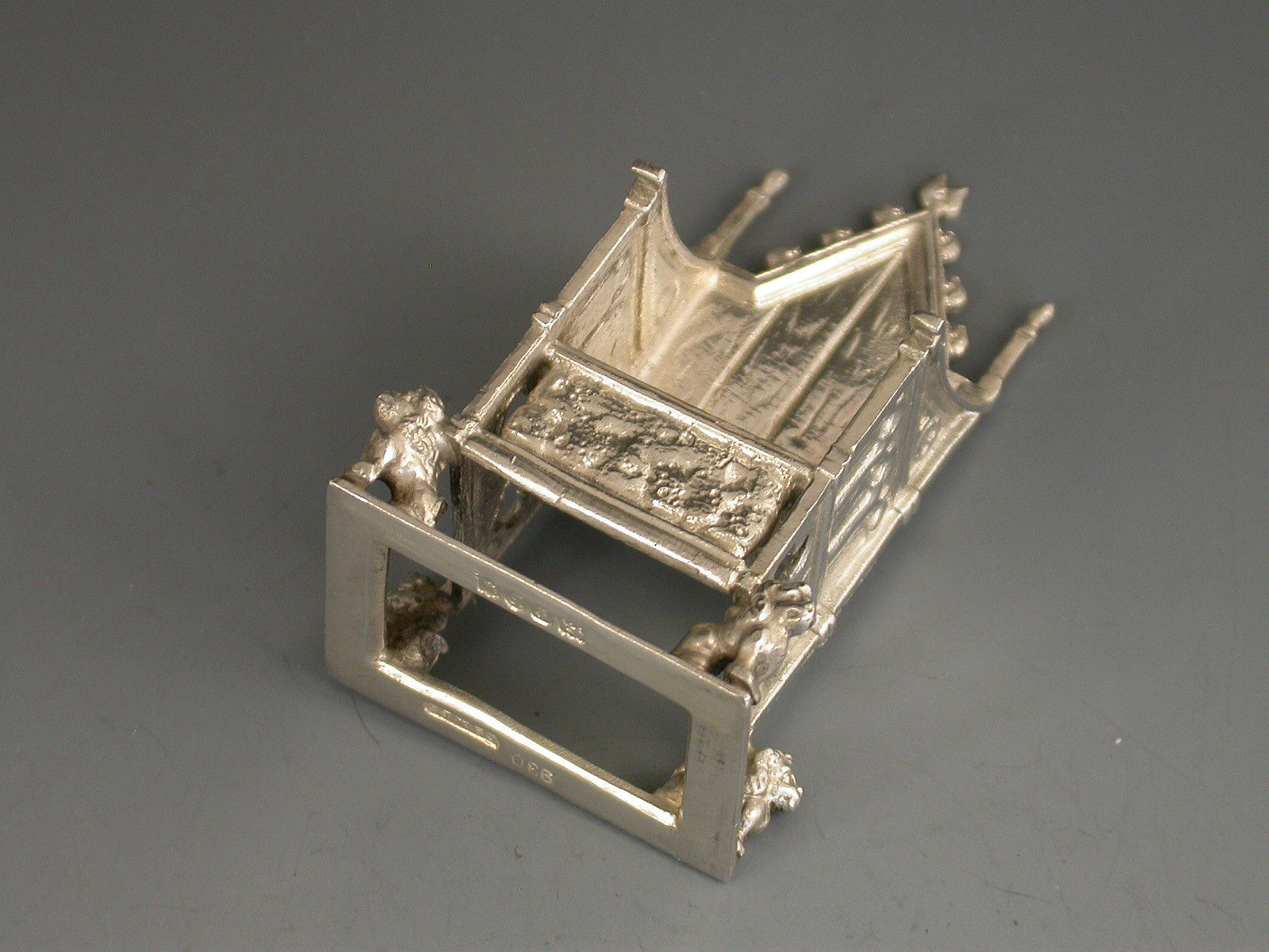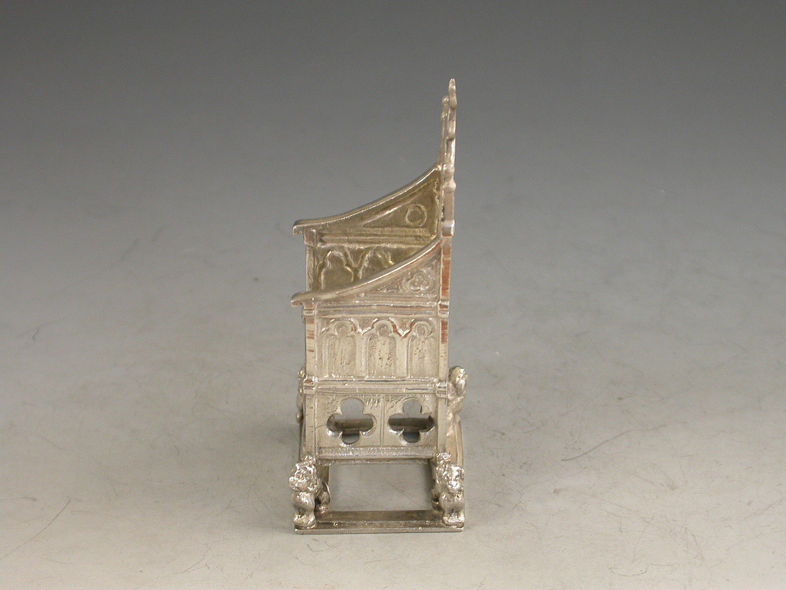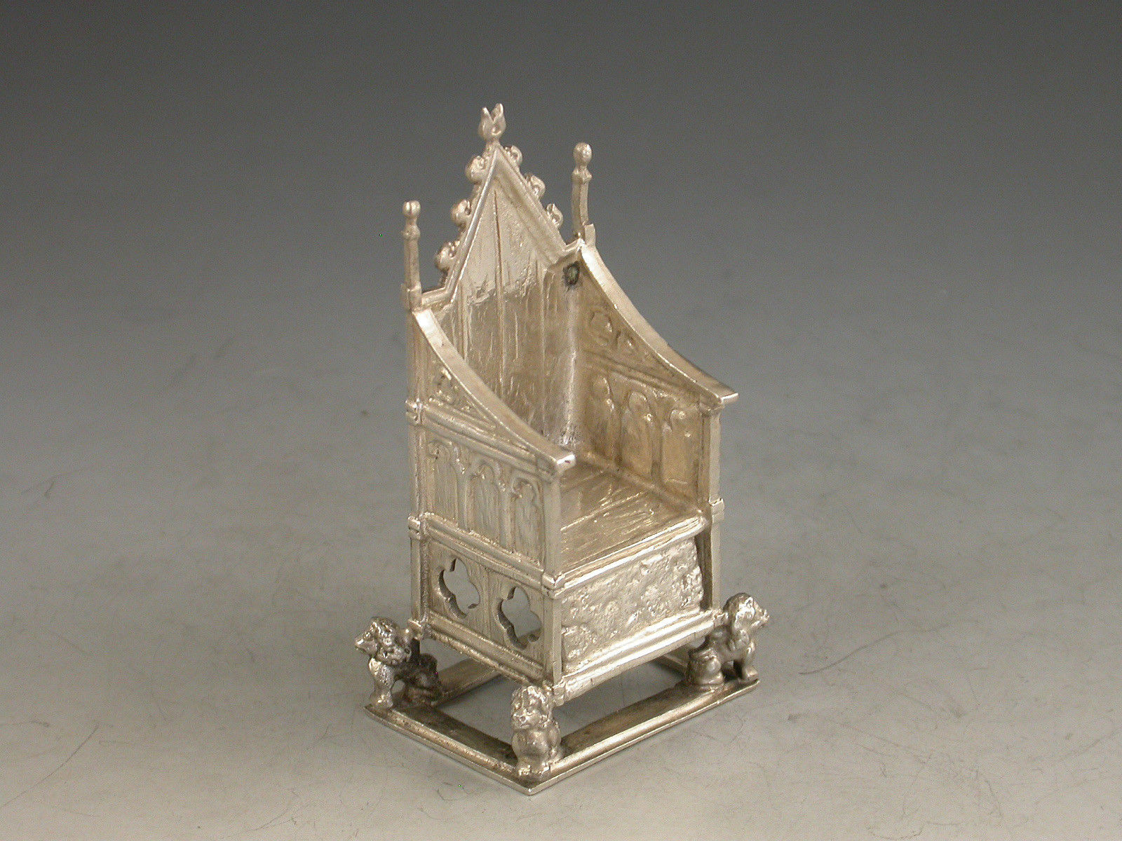 An Edwardian novelty silver miniature Coronation Chair made as an exact replica of King Edward's chair in Westminster Abbey.
