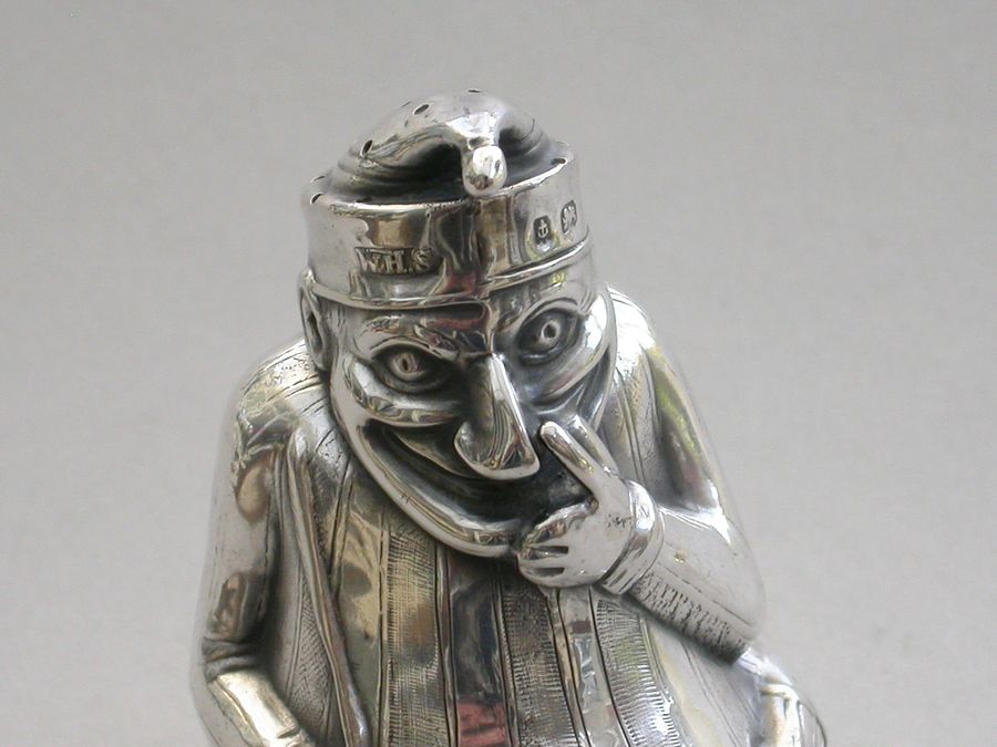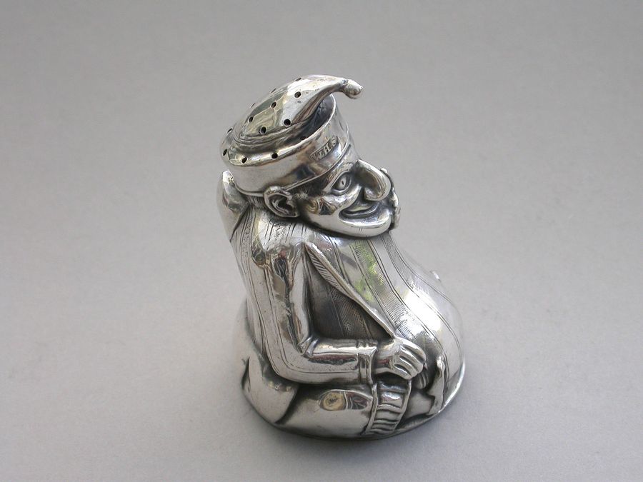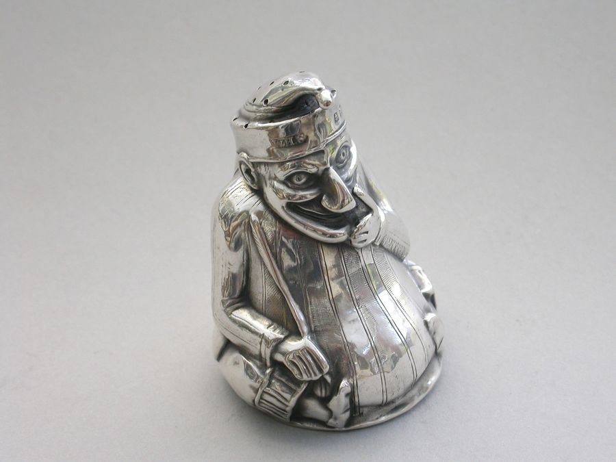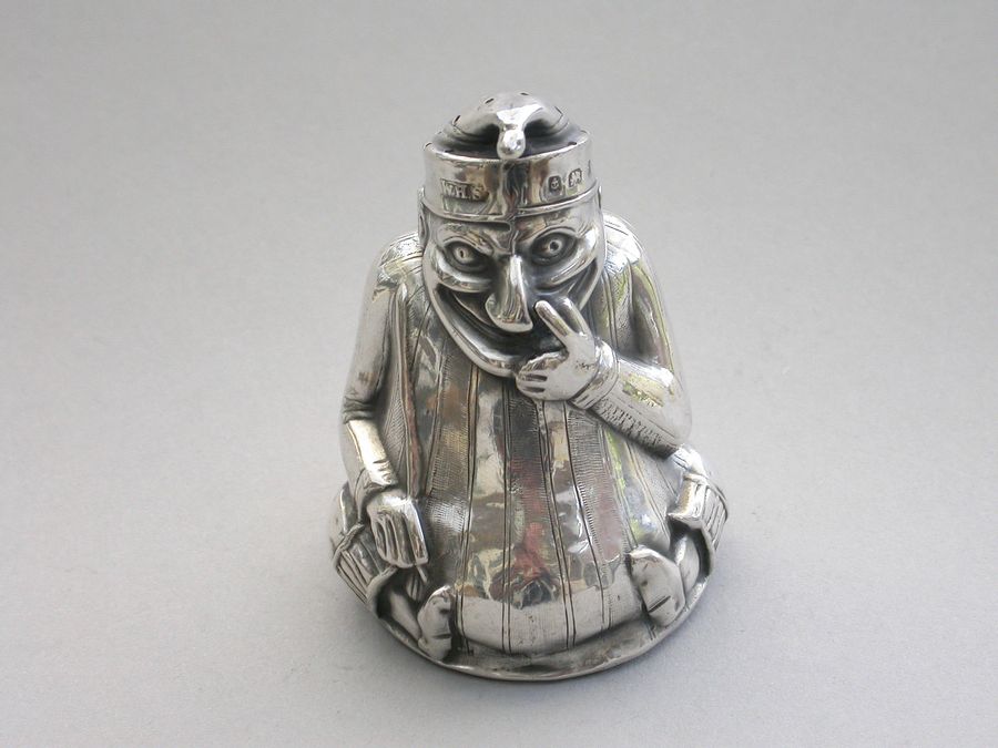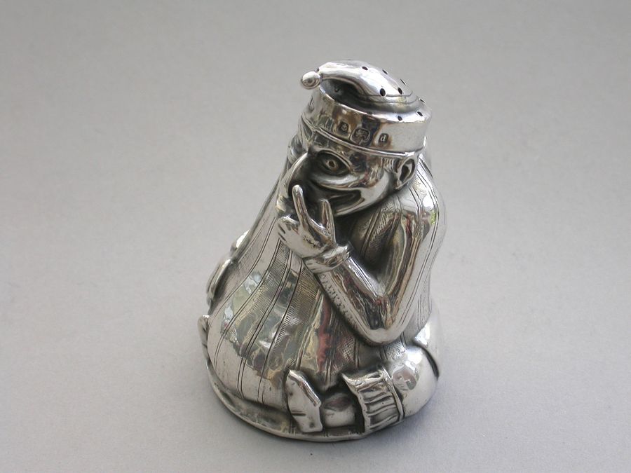 A rare Edwardian novelty silver Pepper made in the form of a seated Mr Punch with his stripey suit and pot belly, a finger to his nose and a quill pen in his right hand. Screw off lead weighted stopper to the base.
