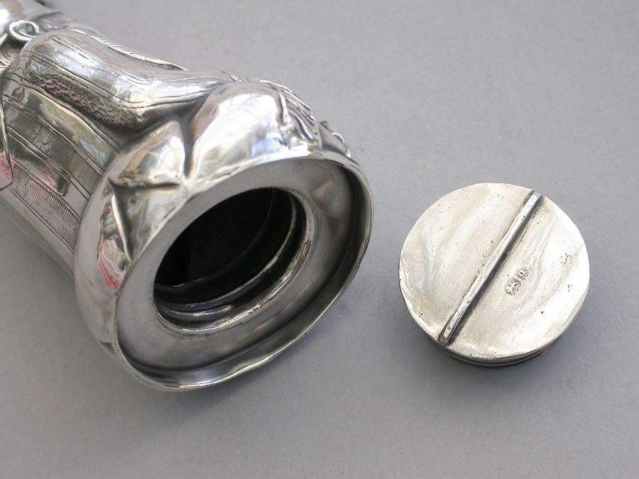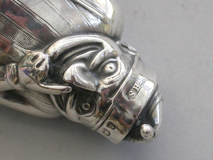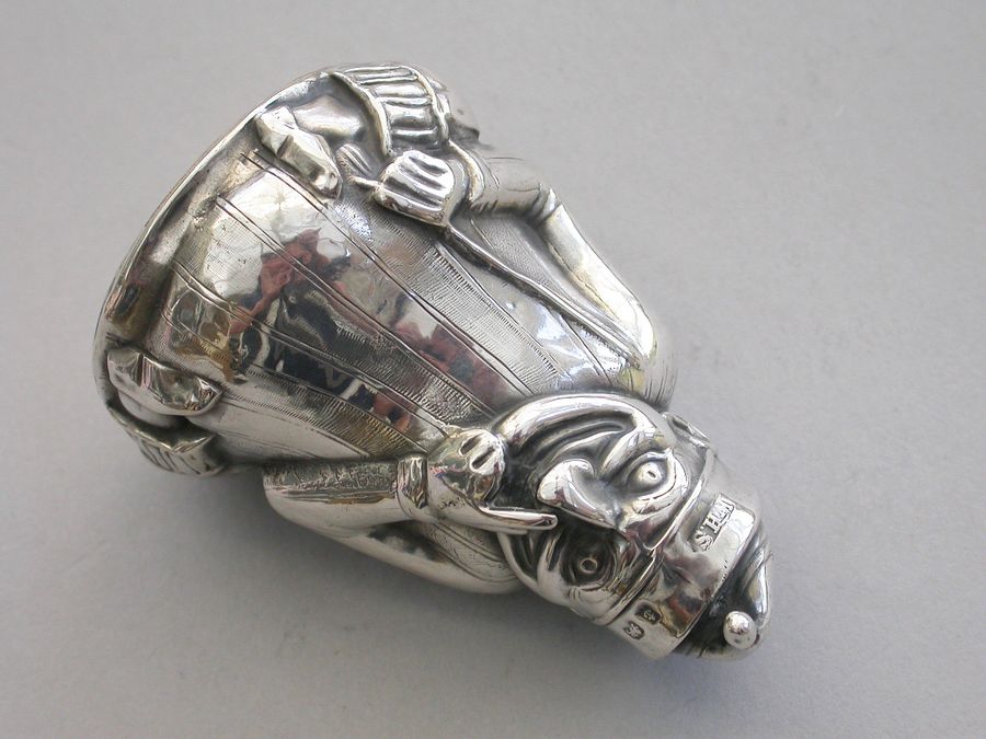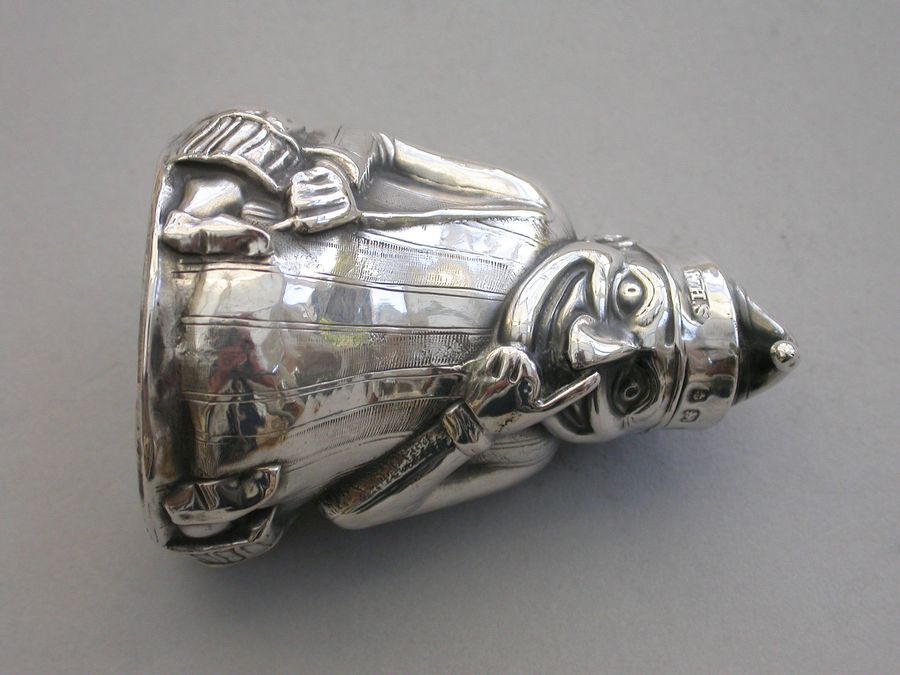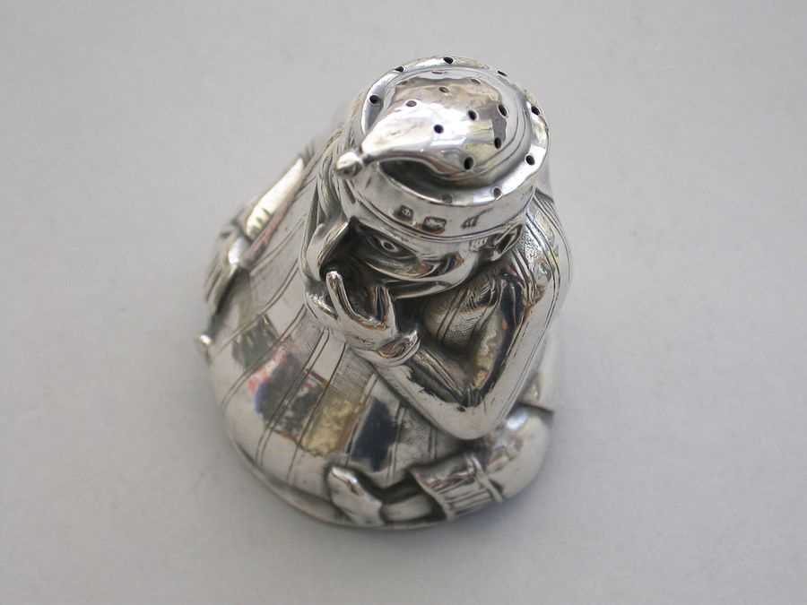 A rare Edwardian novelty silver Pepper made in the form of a seated Mr Punch with his stripey suit and pot belly, a finger to his nose and a quill pen in his right hand. Screw off lead weighted stopper to the base.