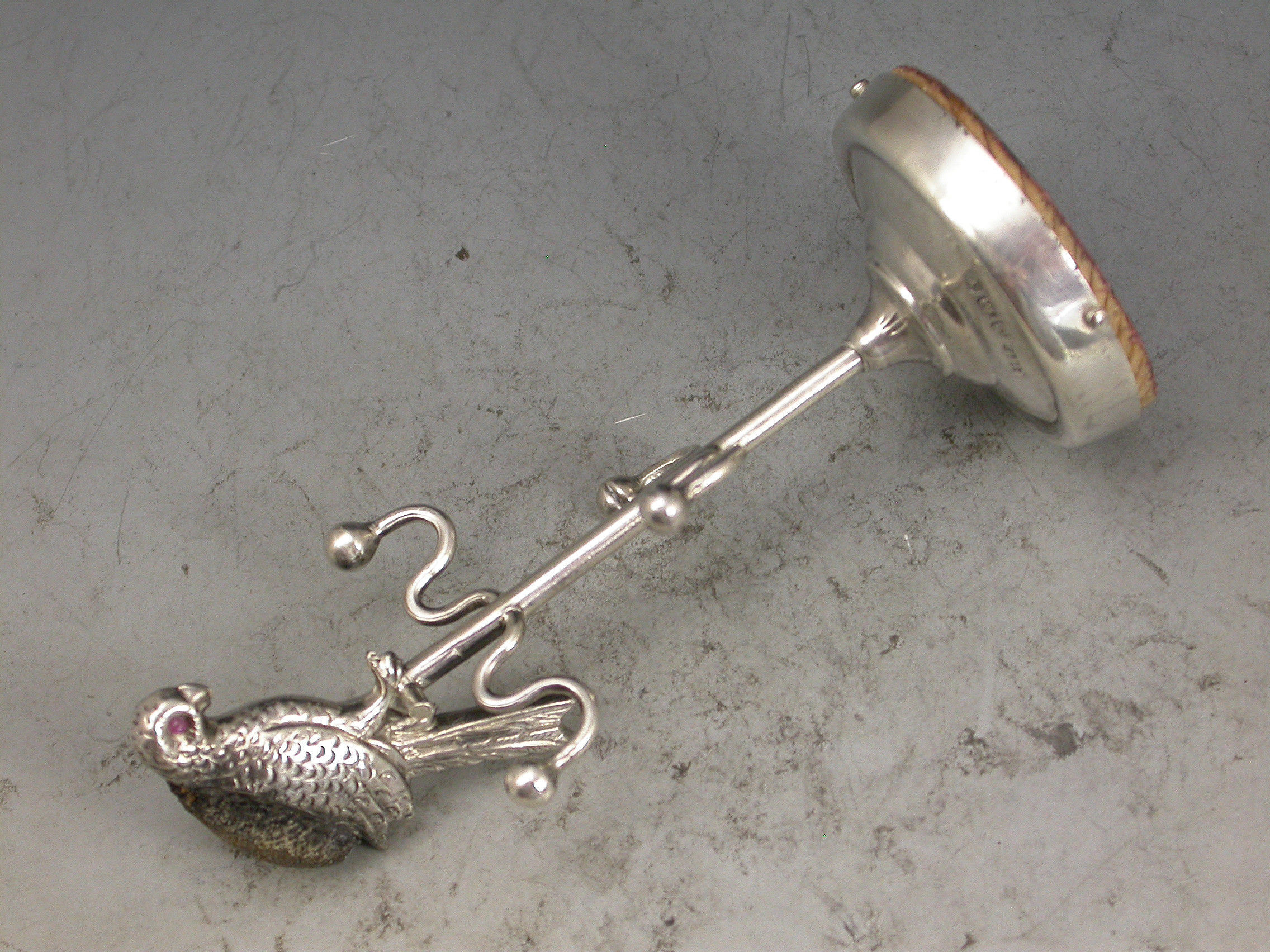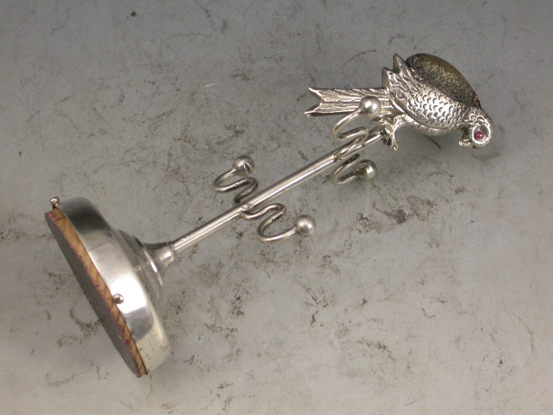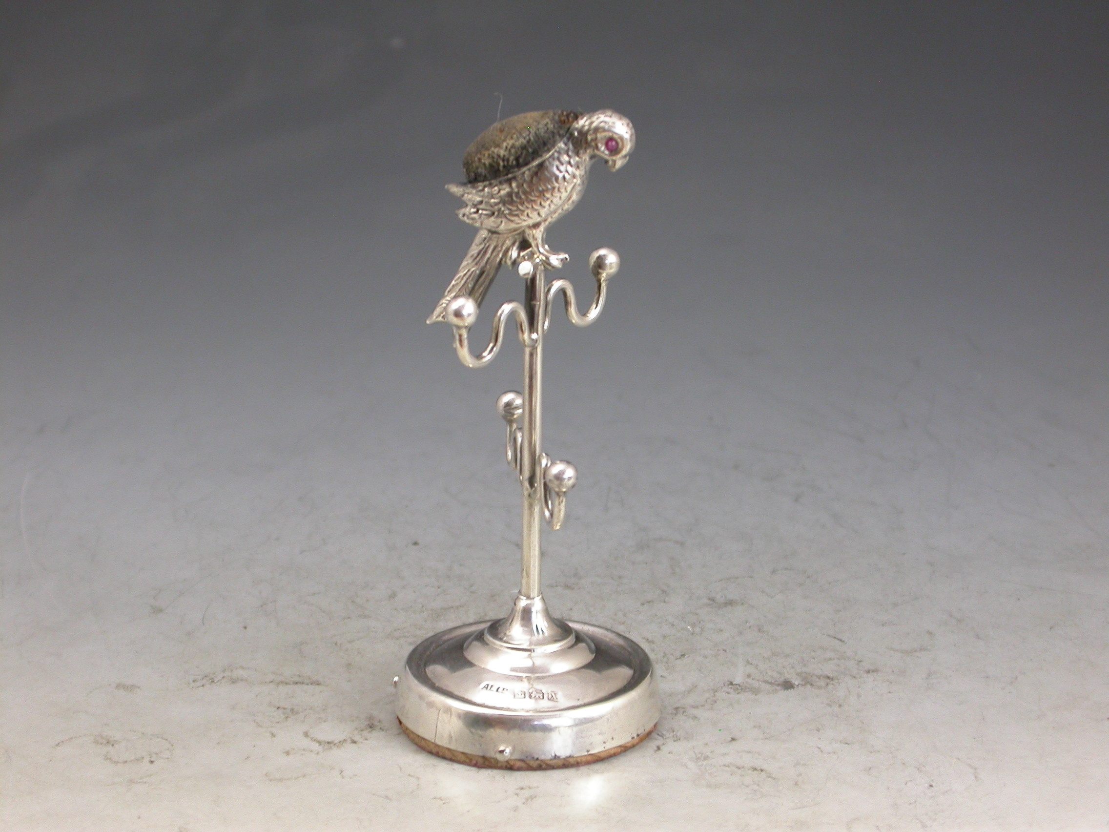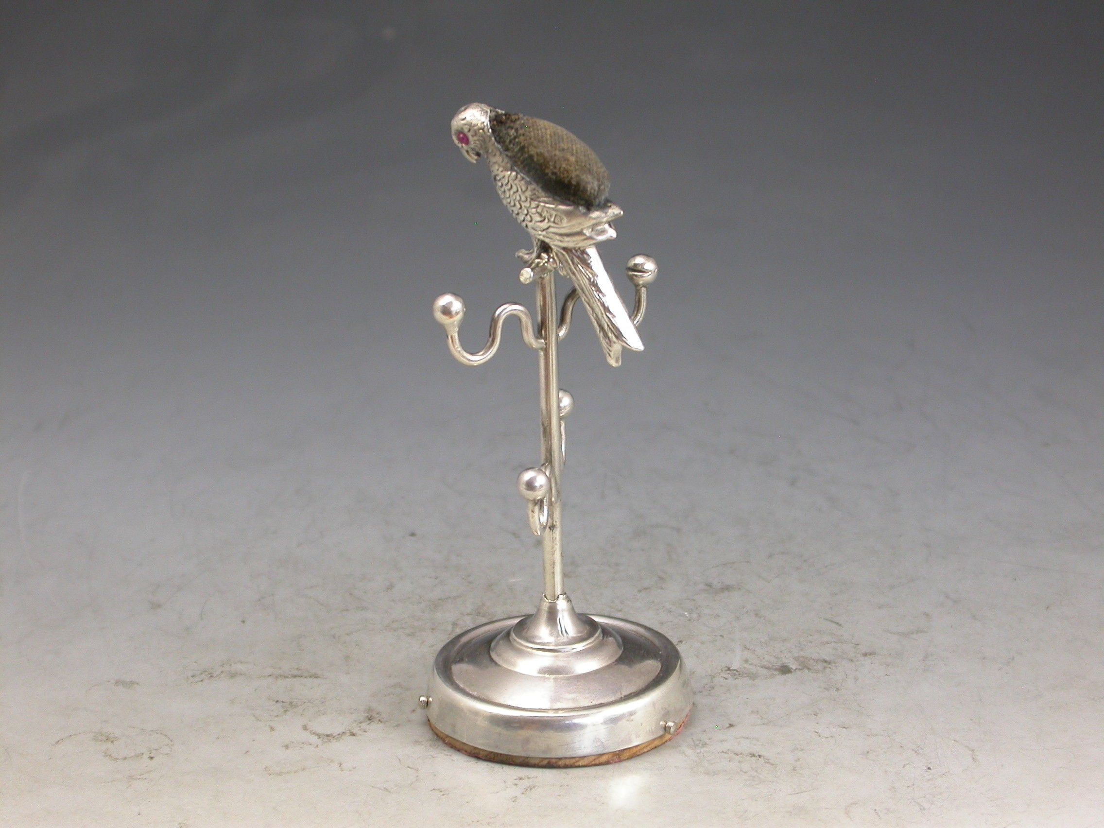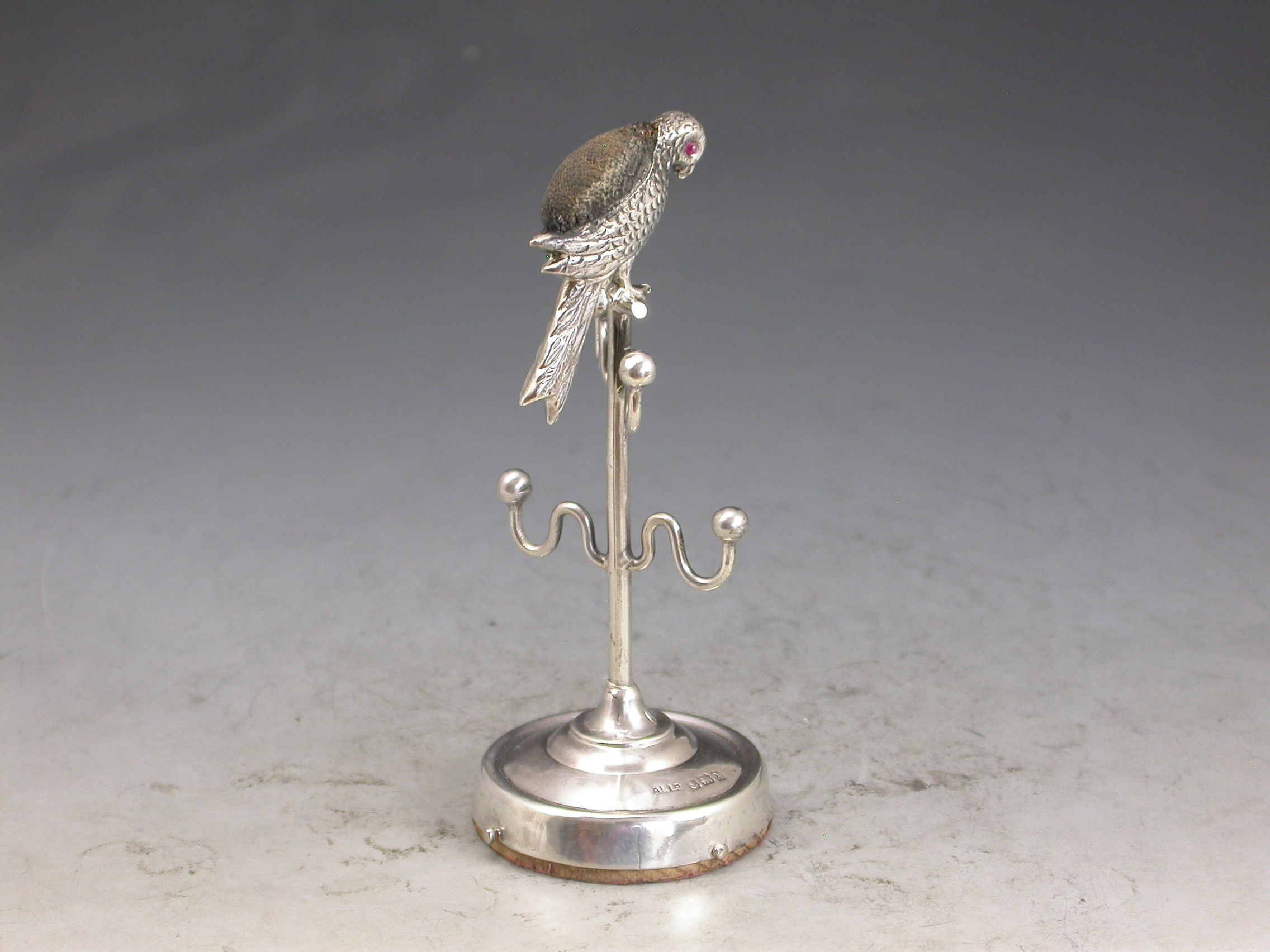 An Edwardian novelty silver Pin Cushion combined with a ring stand, formed as a parrot on its perch, with red glass eyes and original leather cushion. Four branches to hold rings standing on a filled circular pedestal base.