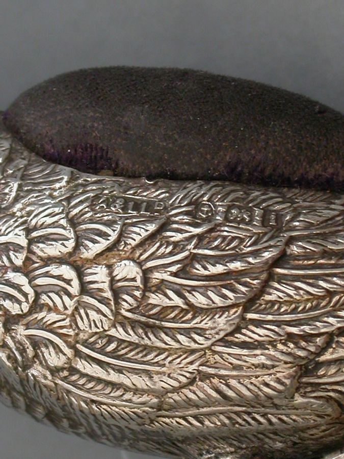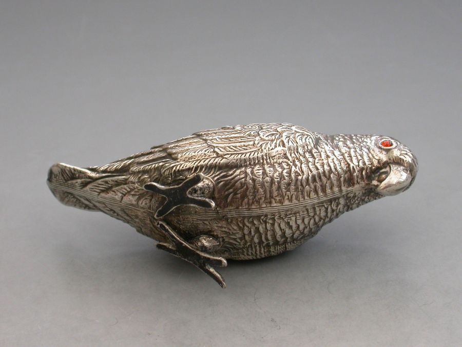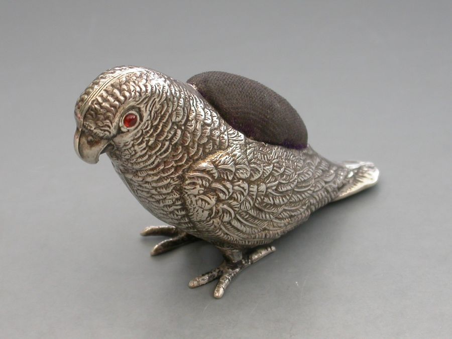An extremely rare Edwardian novelty silver Pin cushion made in the form of a Parrot, set with garnet eyes and complete with original velvet cushion.