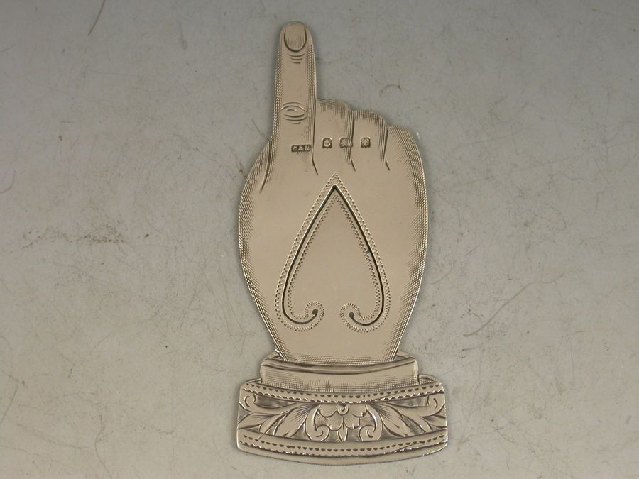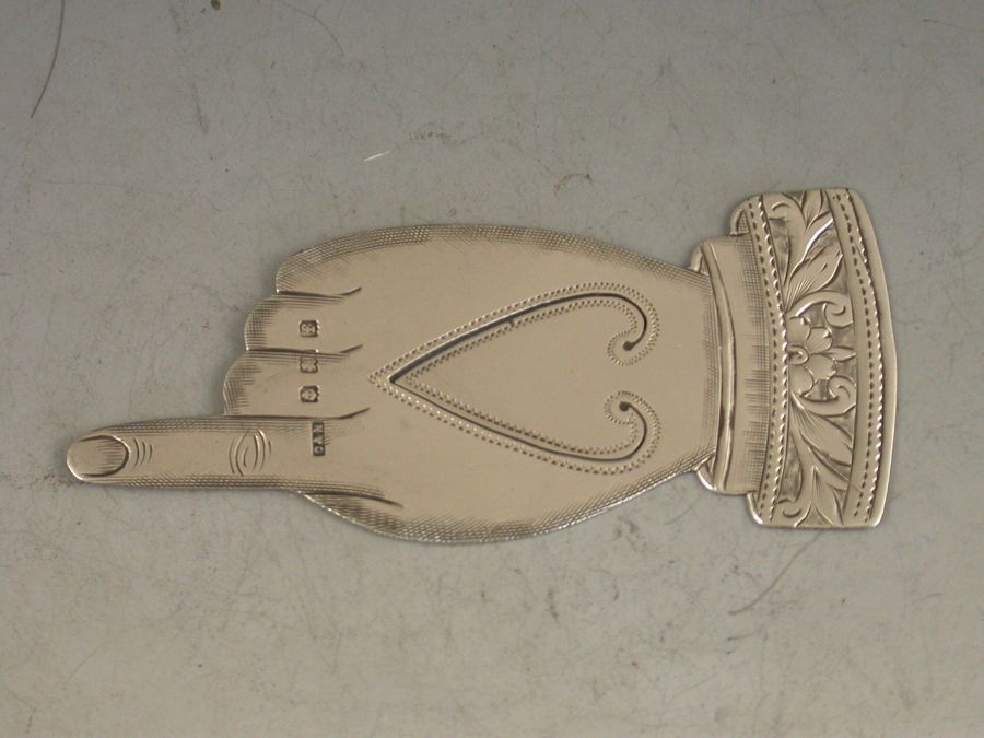An Edwardian novelty silver bookmark modelled as a hand with a pointing index finger. Fine bright cut engraved decoration to the cuff and life like engraving to the hand itself.