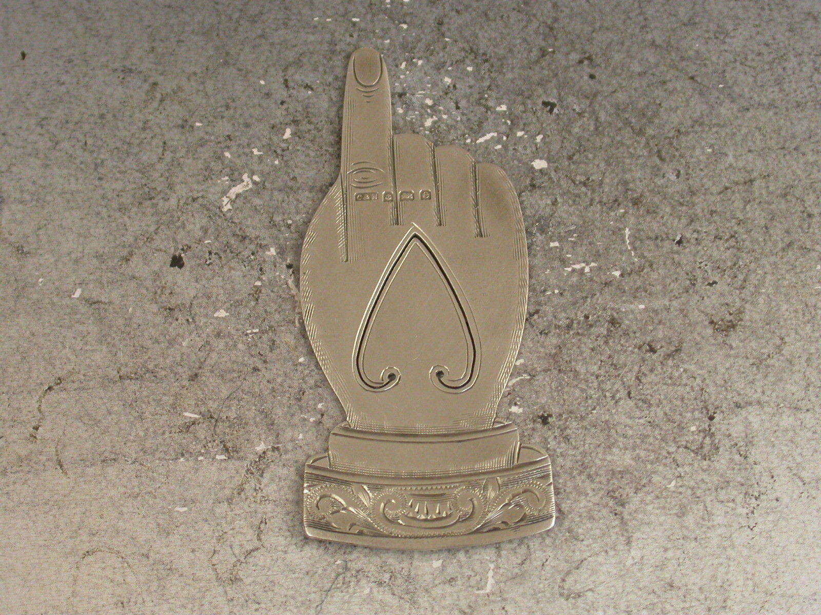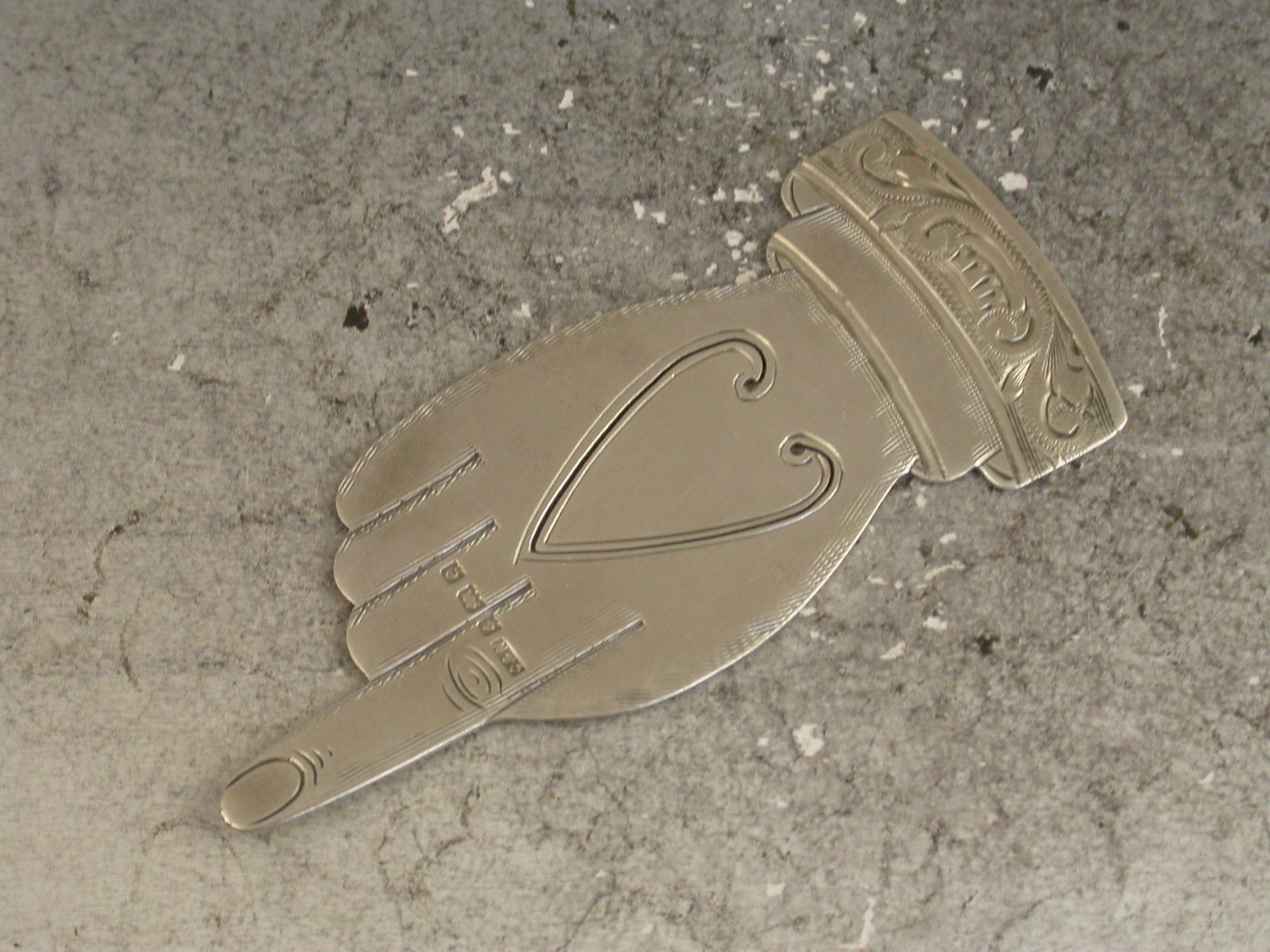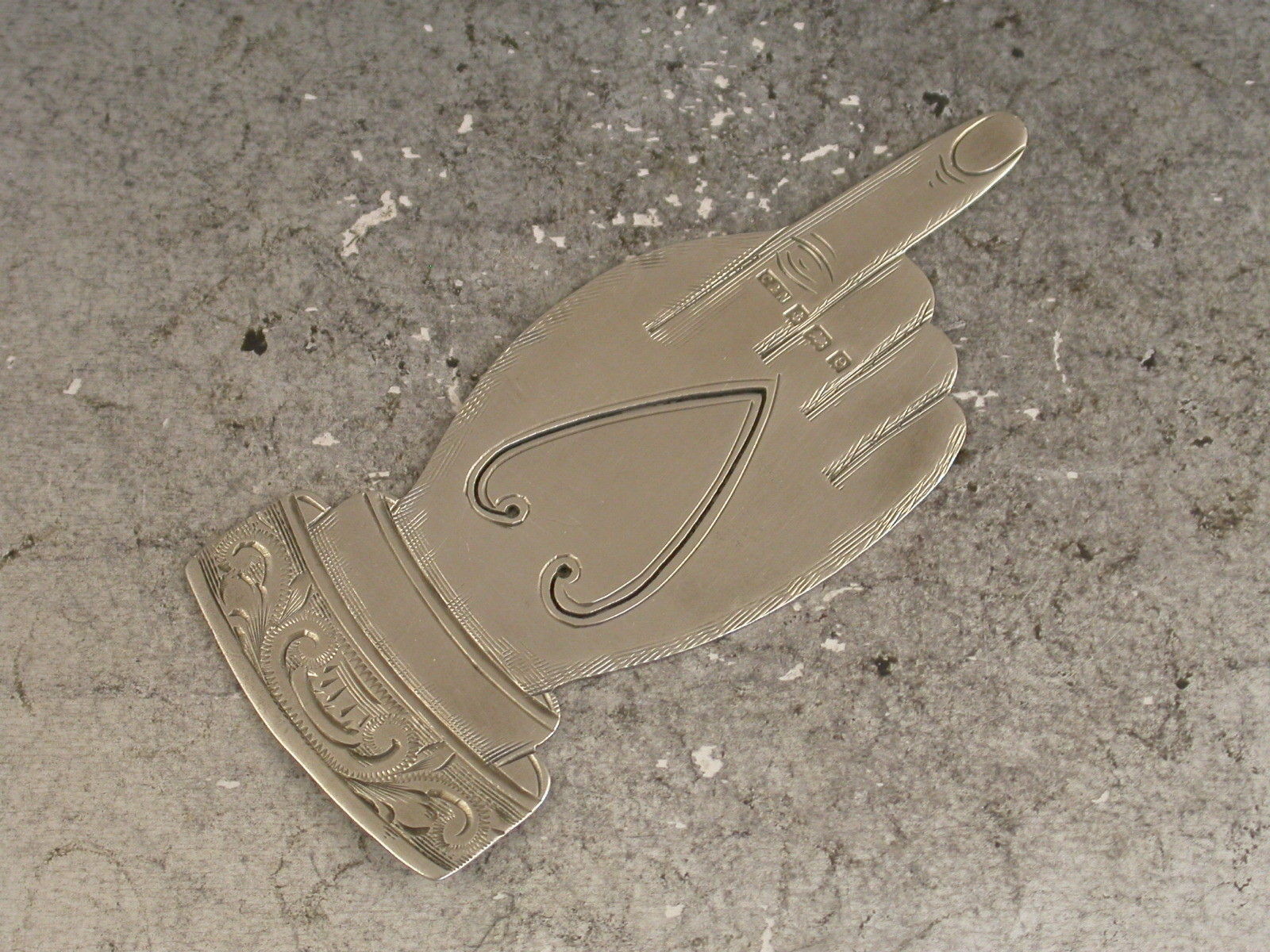 An Edwardian novelty silver Bookmark modelled as a hand with a pointing index finger, fine bright-cut engraved decoration to the cuff and life like engraving to the hand.
