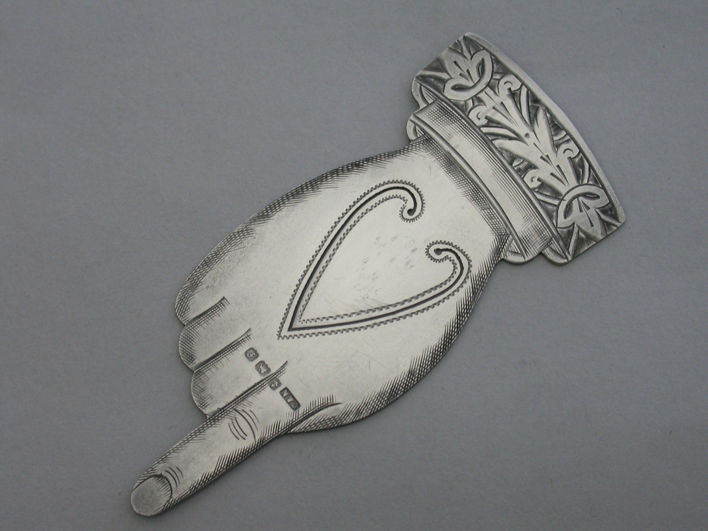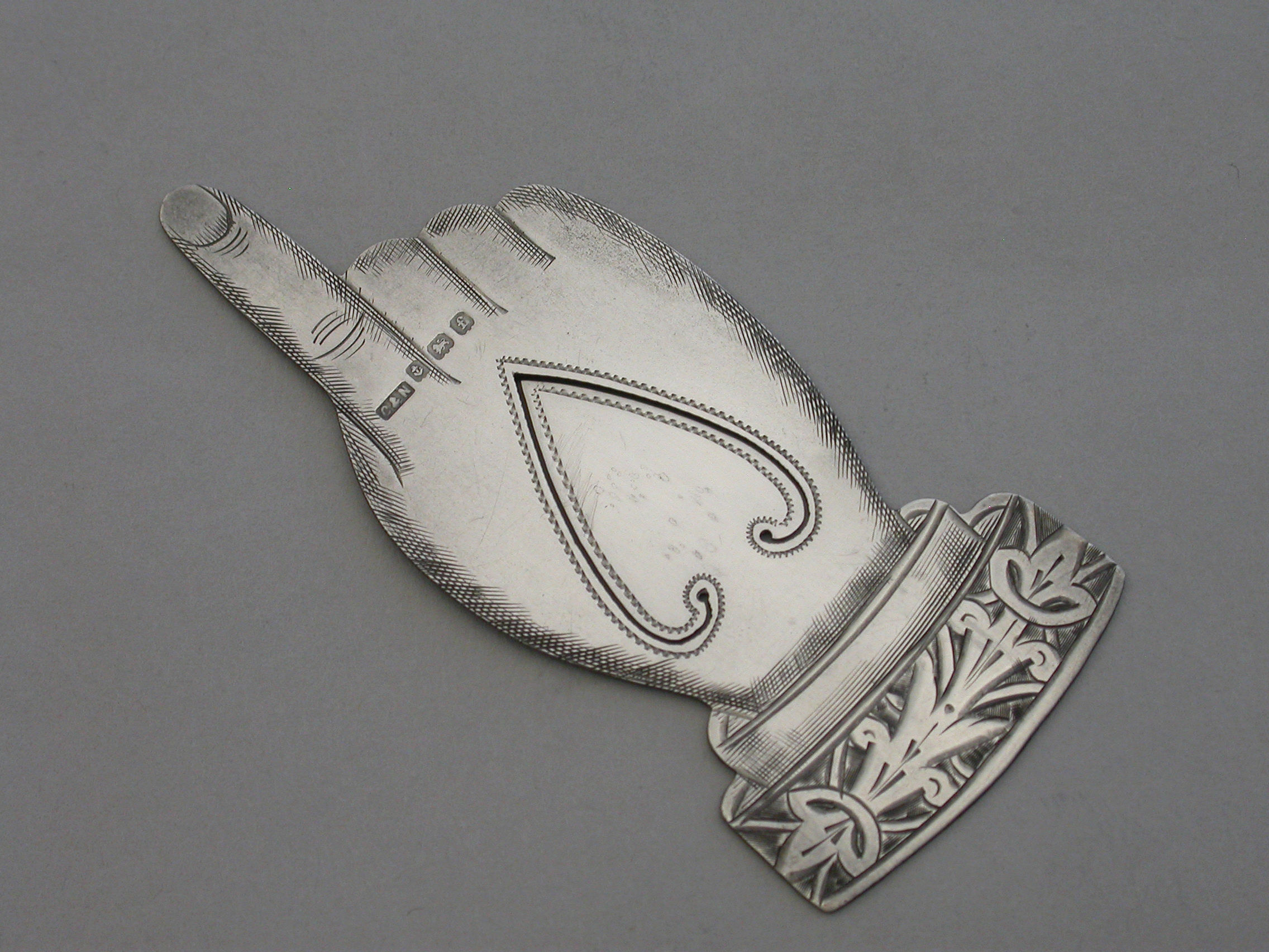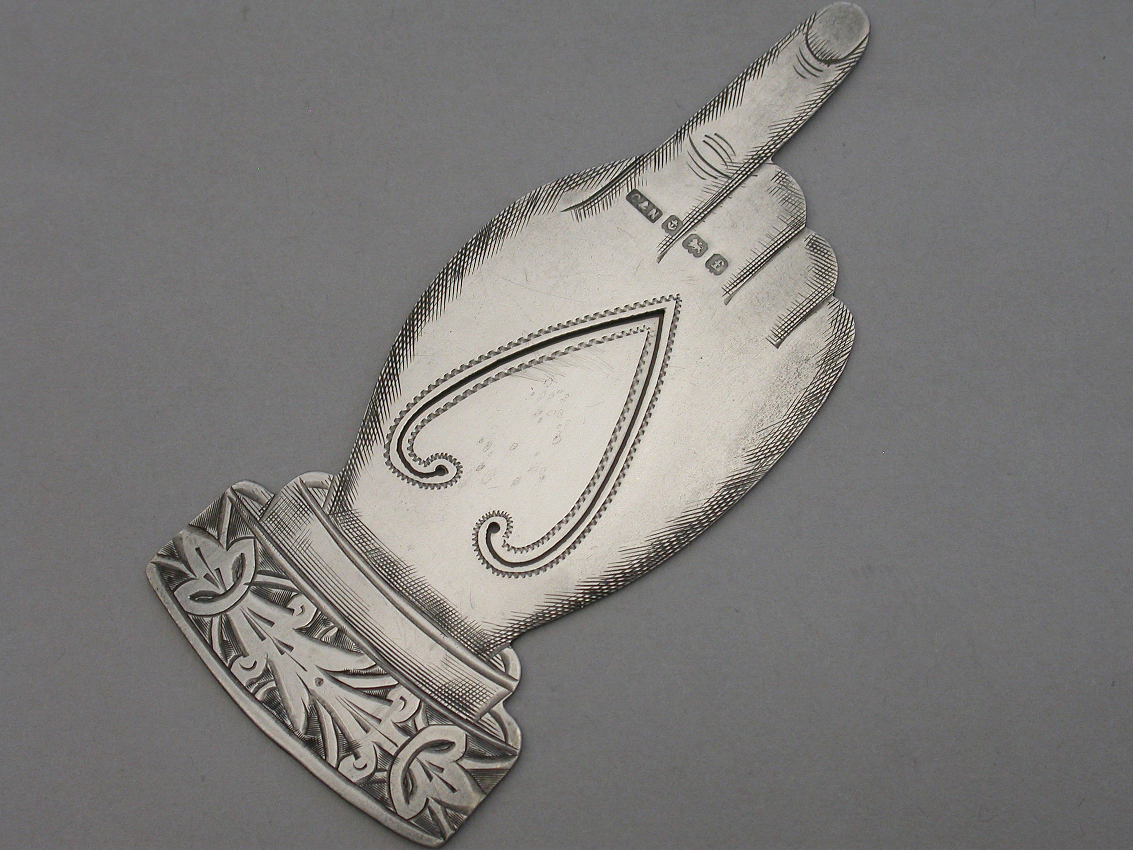 An Edwardian novelty silver bookmark modelled as a hand with a pointing index finger. Fine bright-cut engraved decoration to the cuff and lifelike engraving to the hand itself.