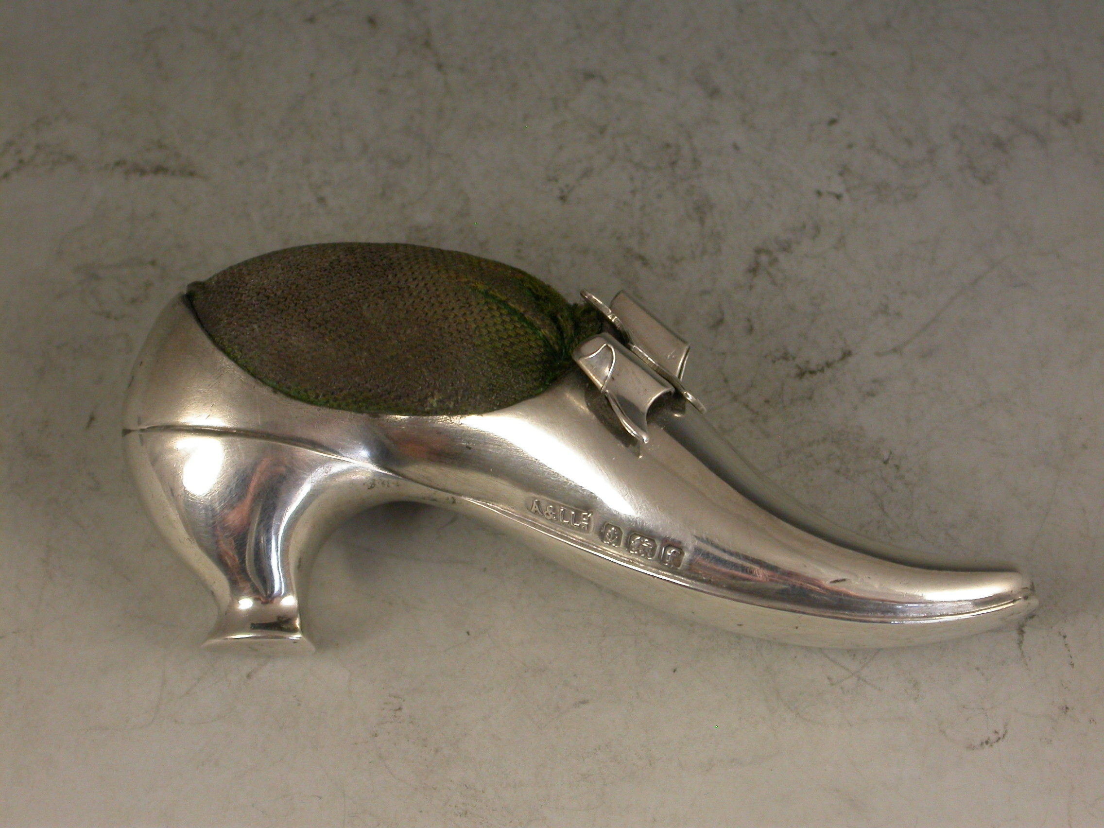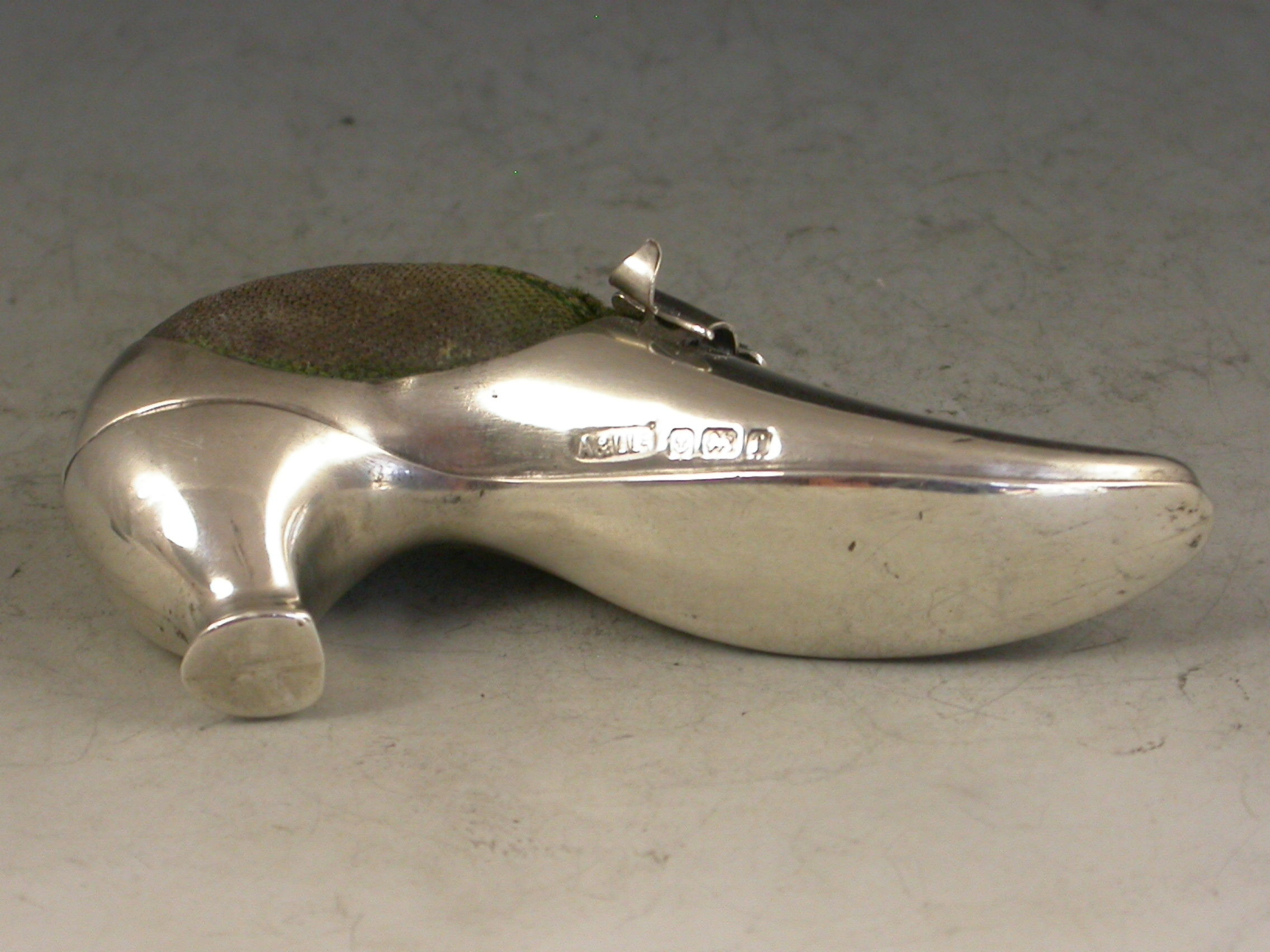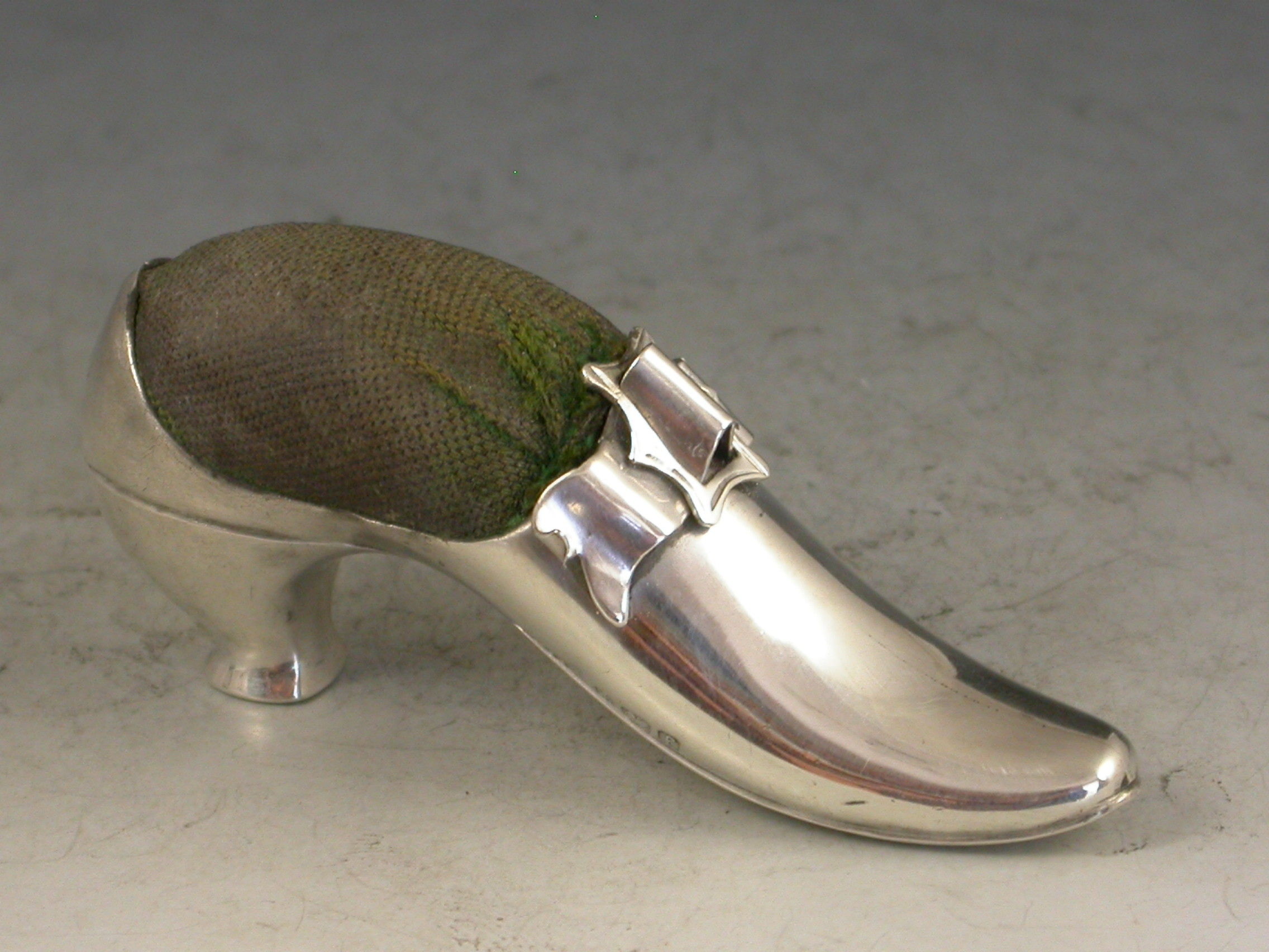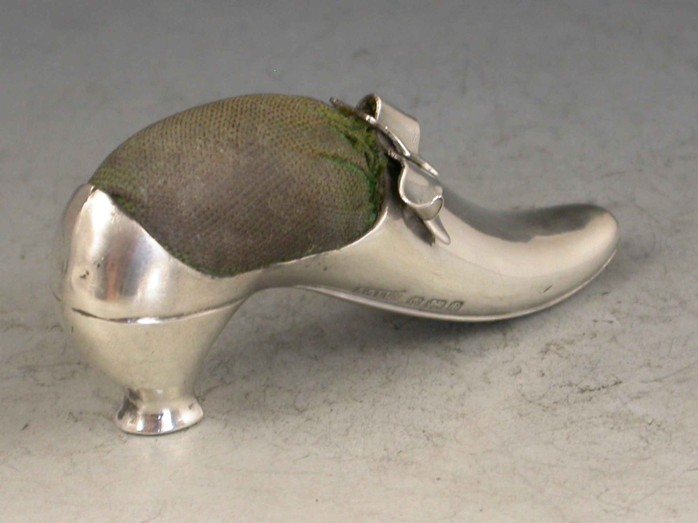 A good Edwardian novelty silver Pin Cushion made in the form of a high heeled fancy shoe with applied buckle and ribbon. Complete with original cushion.