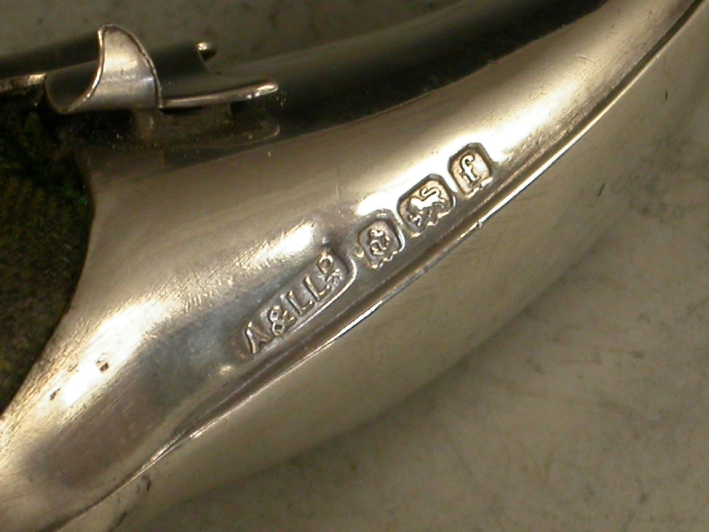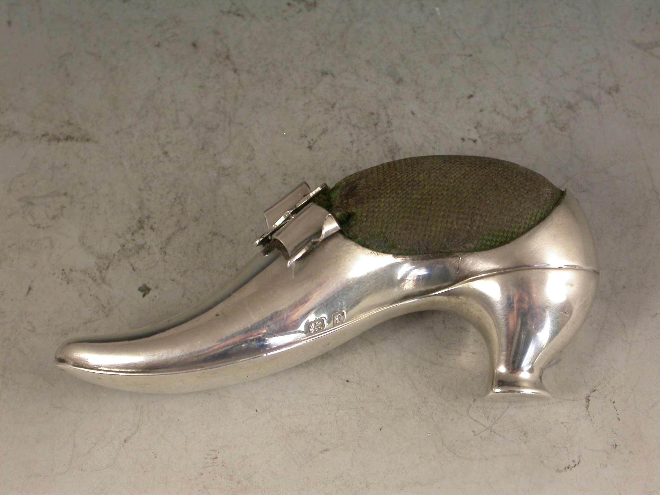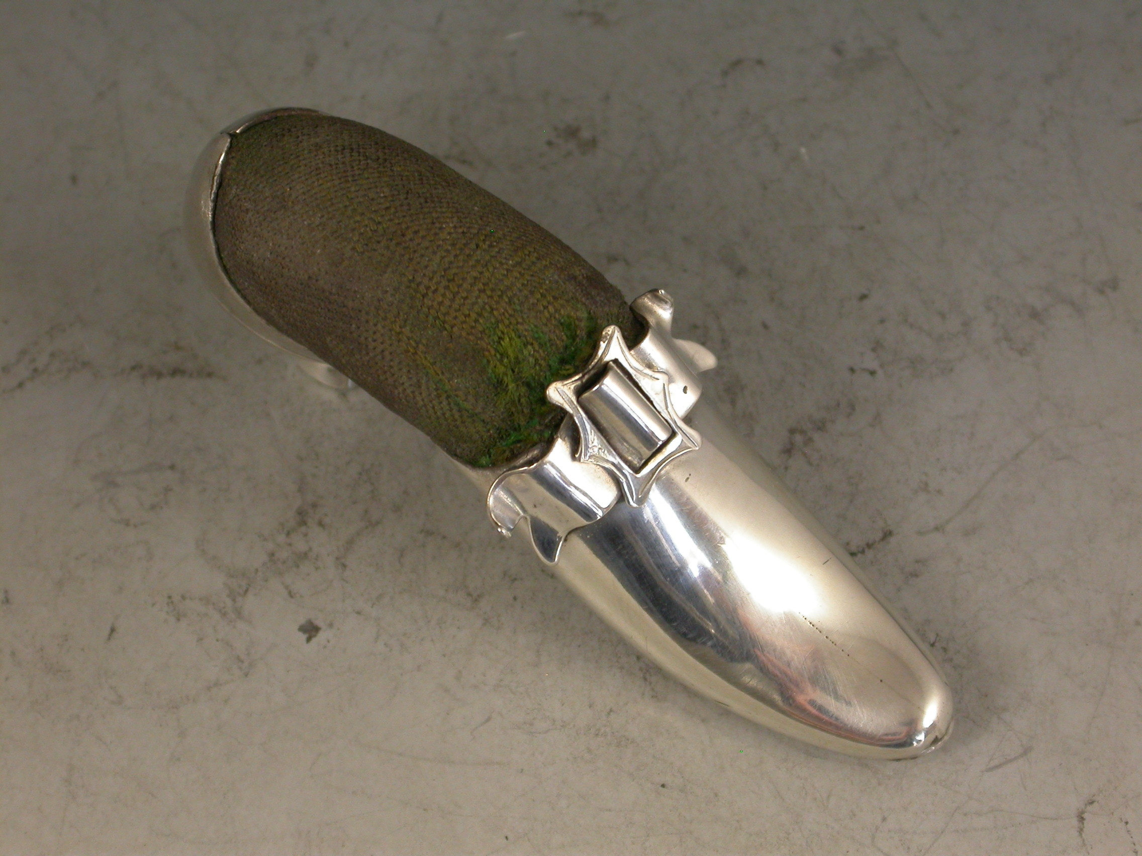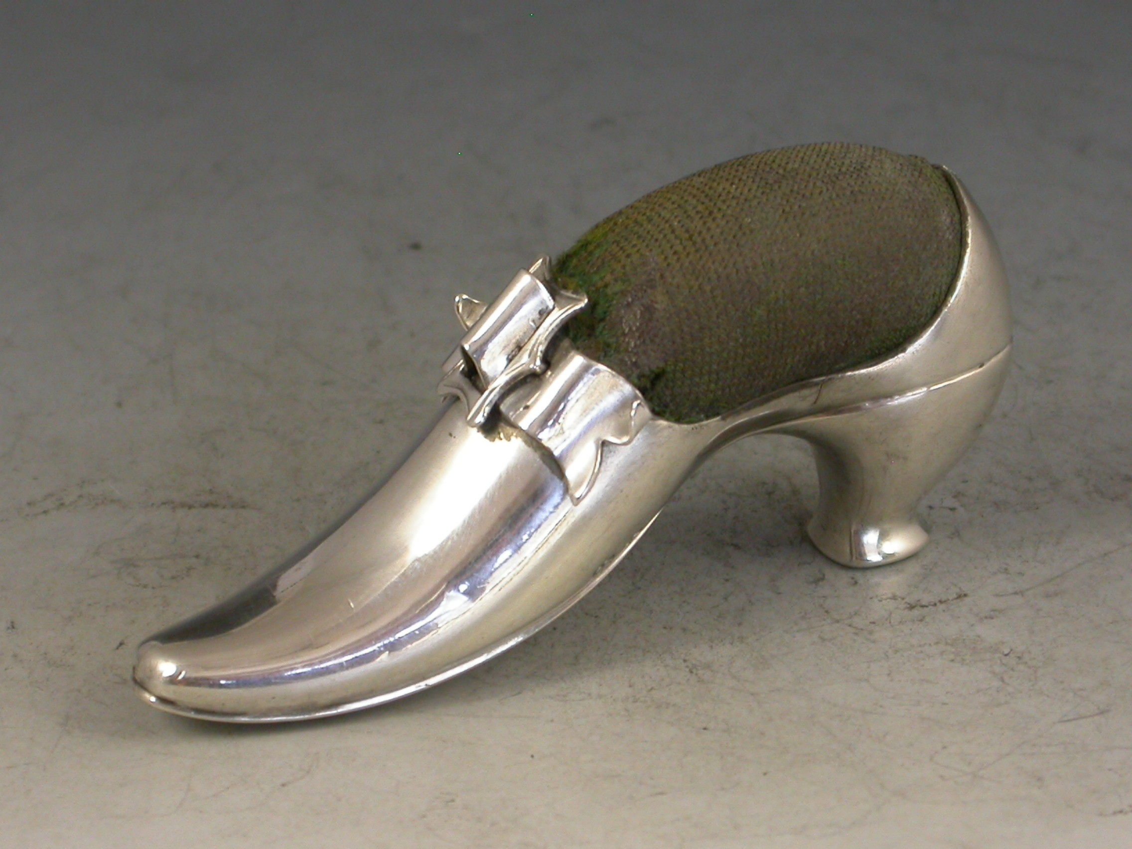 A good Edwardian novelty silver Pin Cushion made in the form of a high heeled fancy shoe with applied buckle and ribbon. Complete with original cushion.