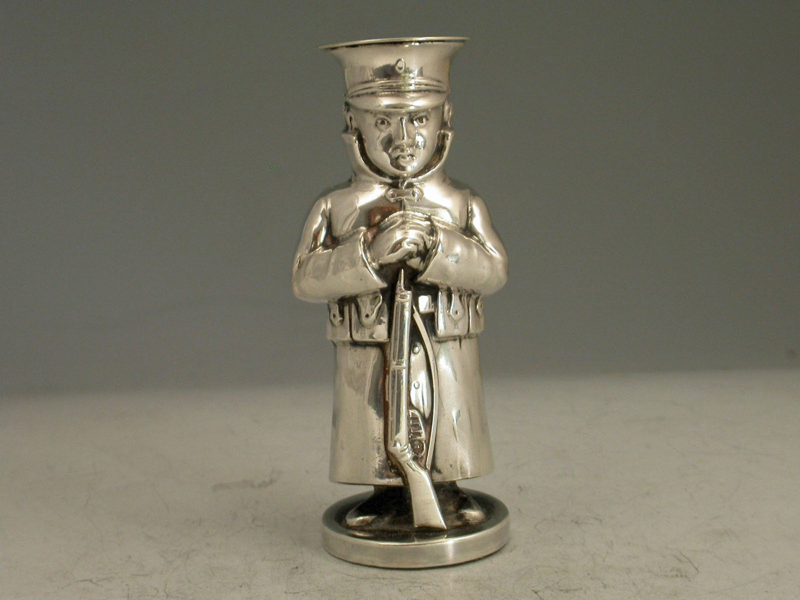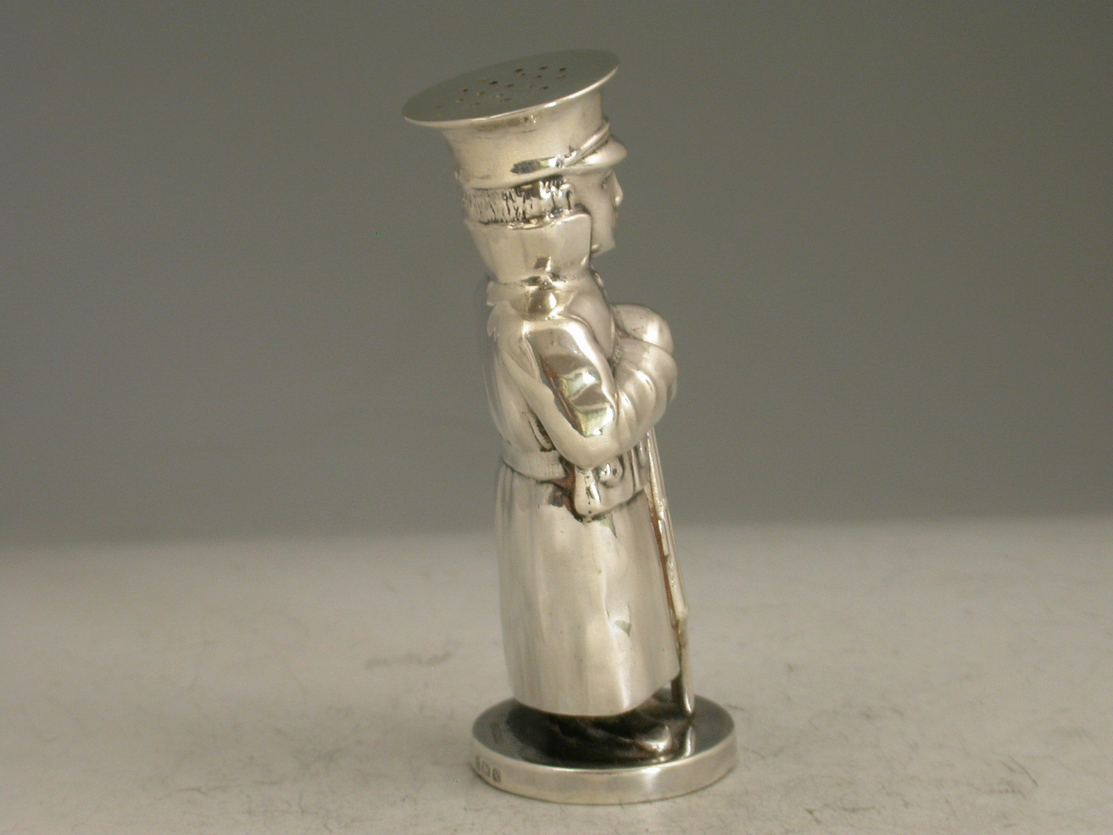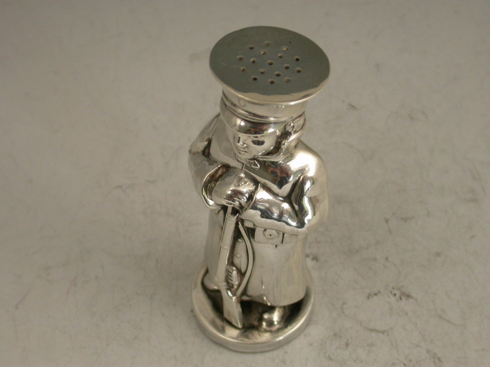 A rare Edwardian novelty silver figural Pepper made in the form of a British Army Soldier standing with his rifle, dressed against the cold in his great coat and cap.