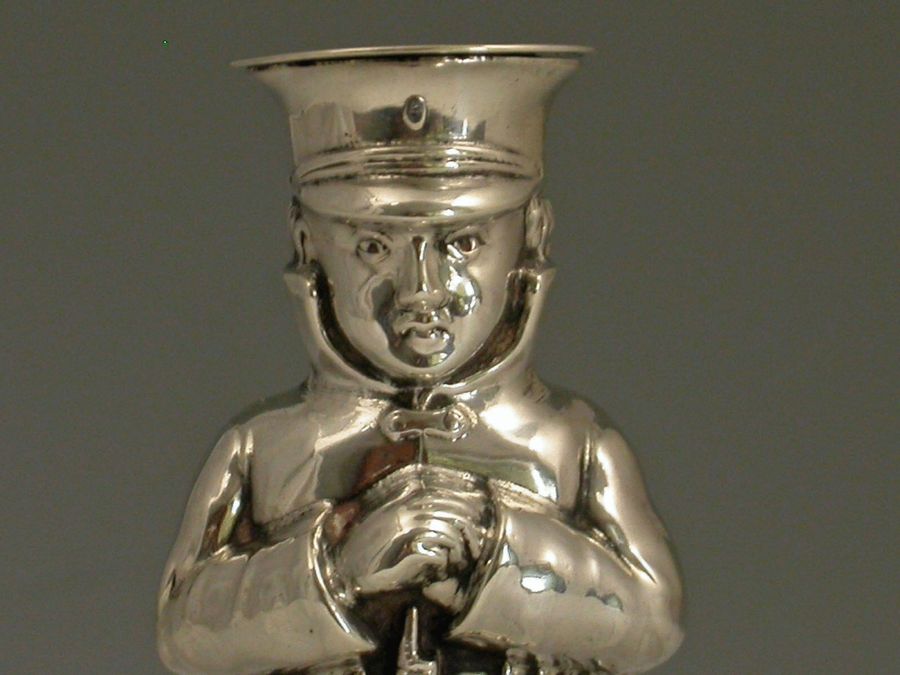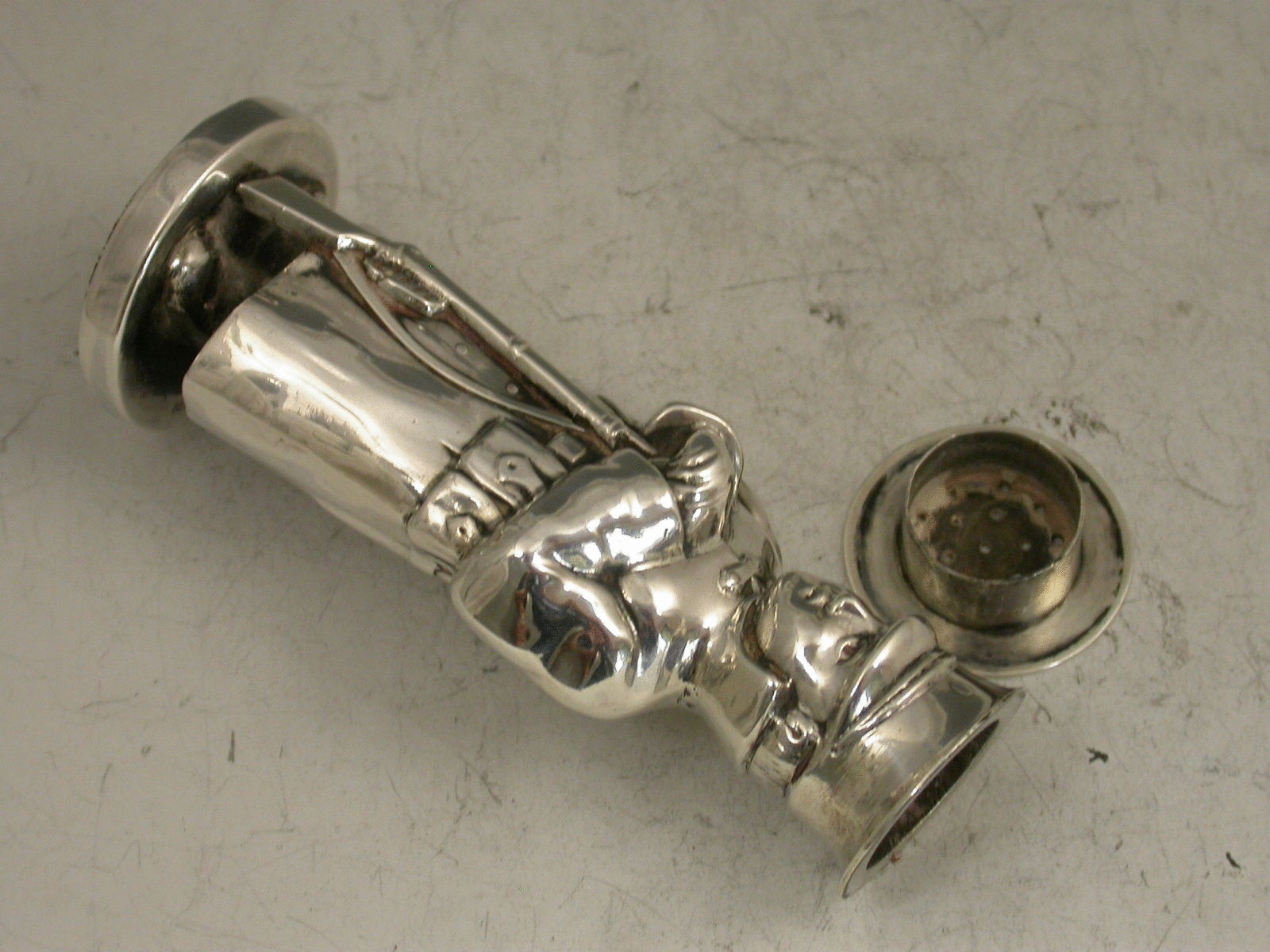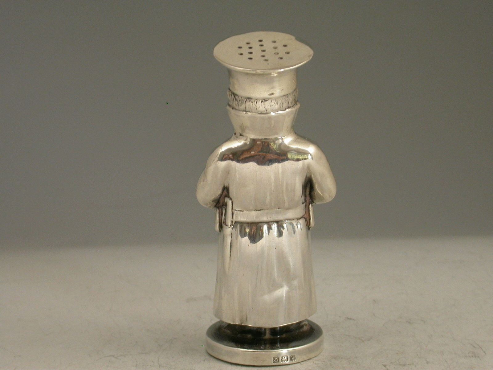 A rare Edwardian novelty silver figural Pepper made in the form of a British Army Soldier standing with his rifle, dressed against the cold in his great coat and cap.