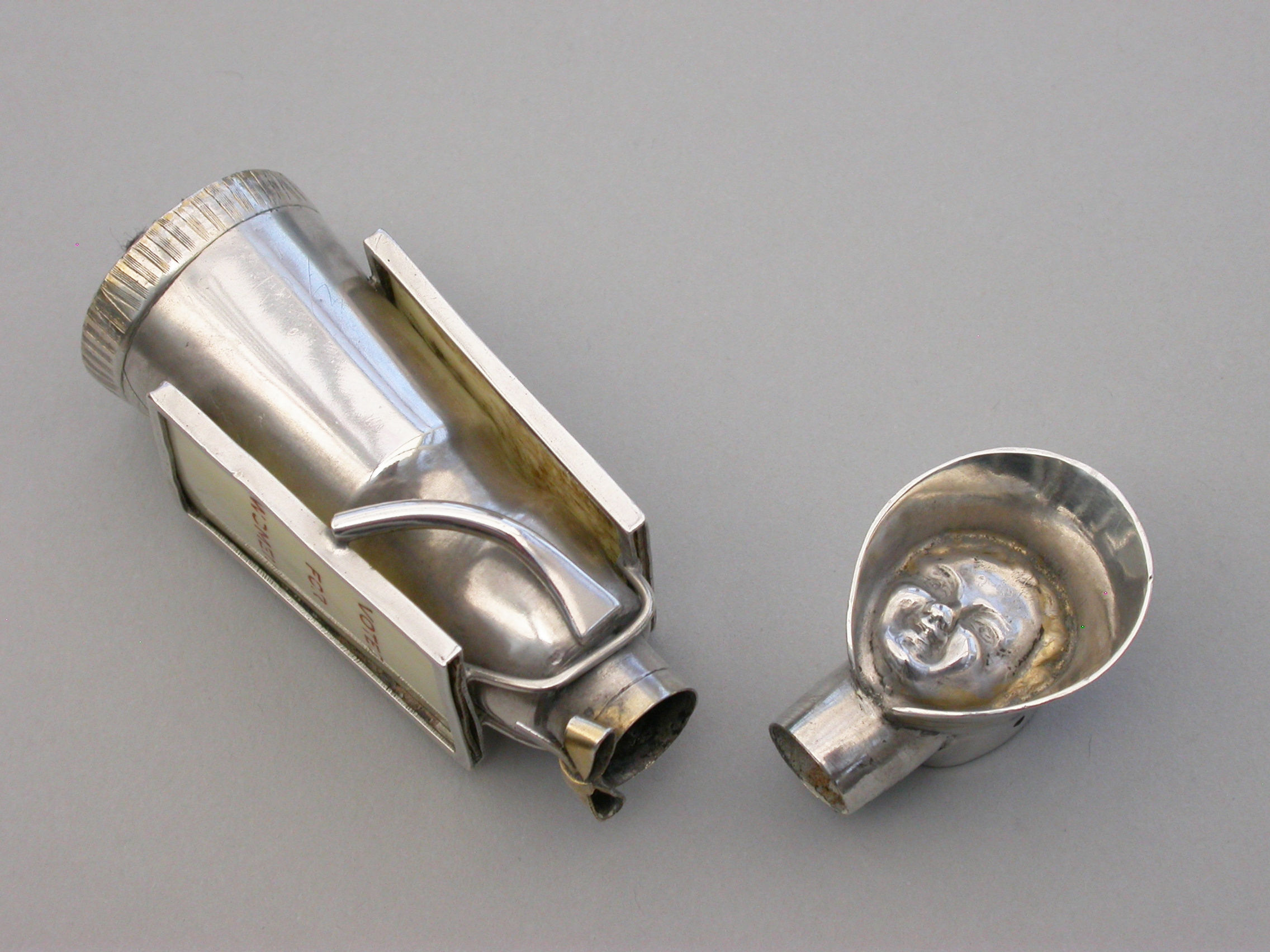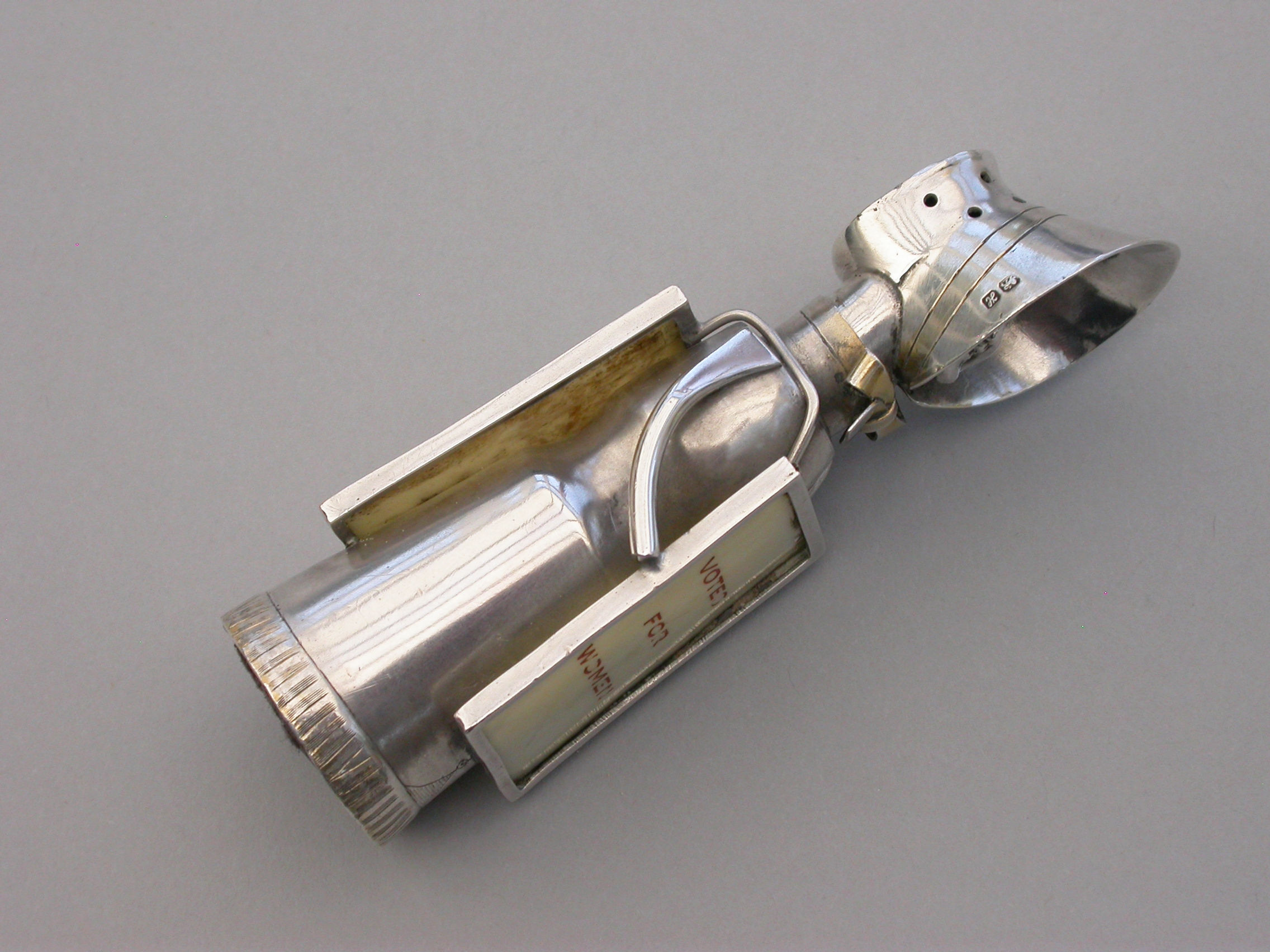 An extremely rare Edwardian novelty silver Pepper made in the form of a Suffragette holding two painted placards with the legends; ""Votes for Women"" and ""We can make things hot for you"". The pull-off lid with pierced bonnet.