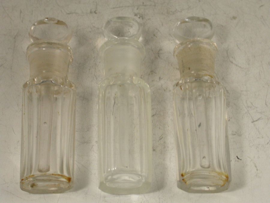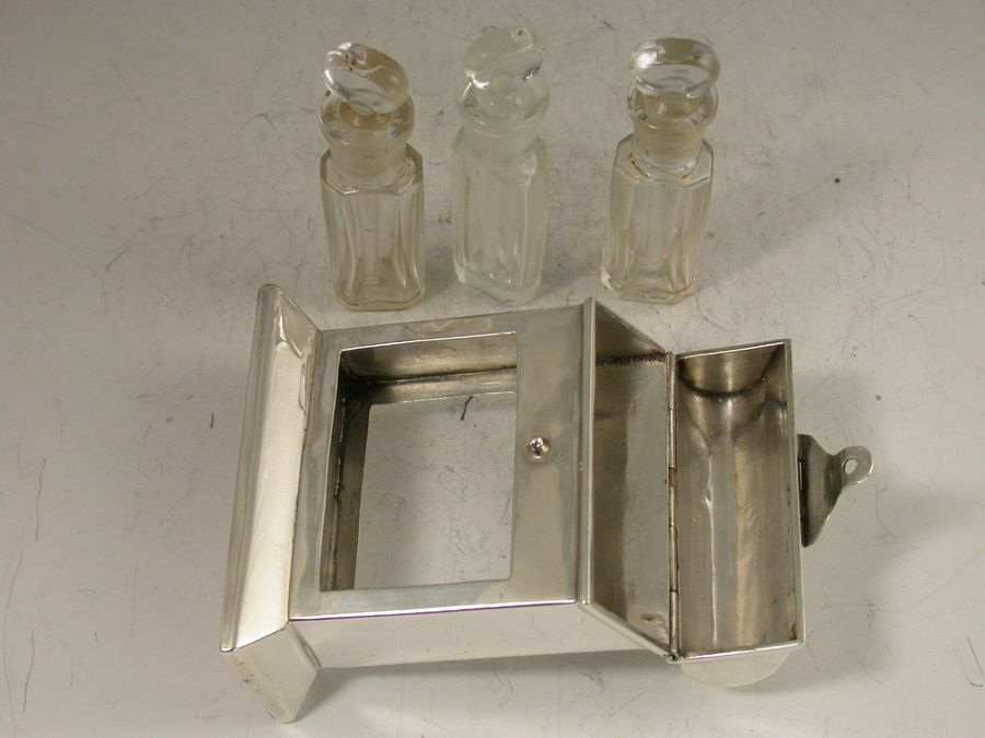 An unusual Edwardian novelty silver Scent Bottle Case in the form of a wooden Tantalus, on a beveled oblong base with hinged domed cover, containing three clear glass scent phials.