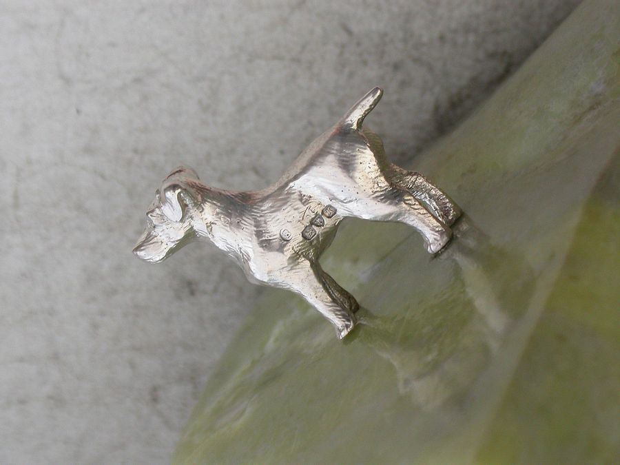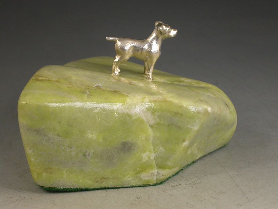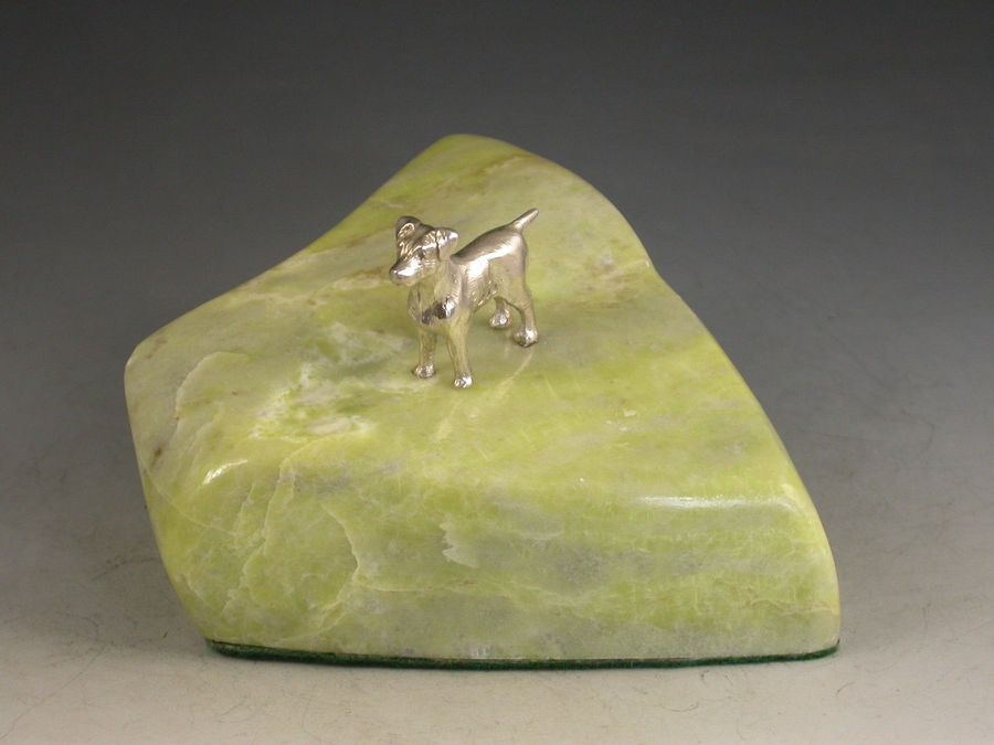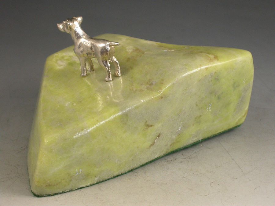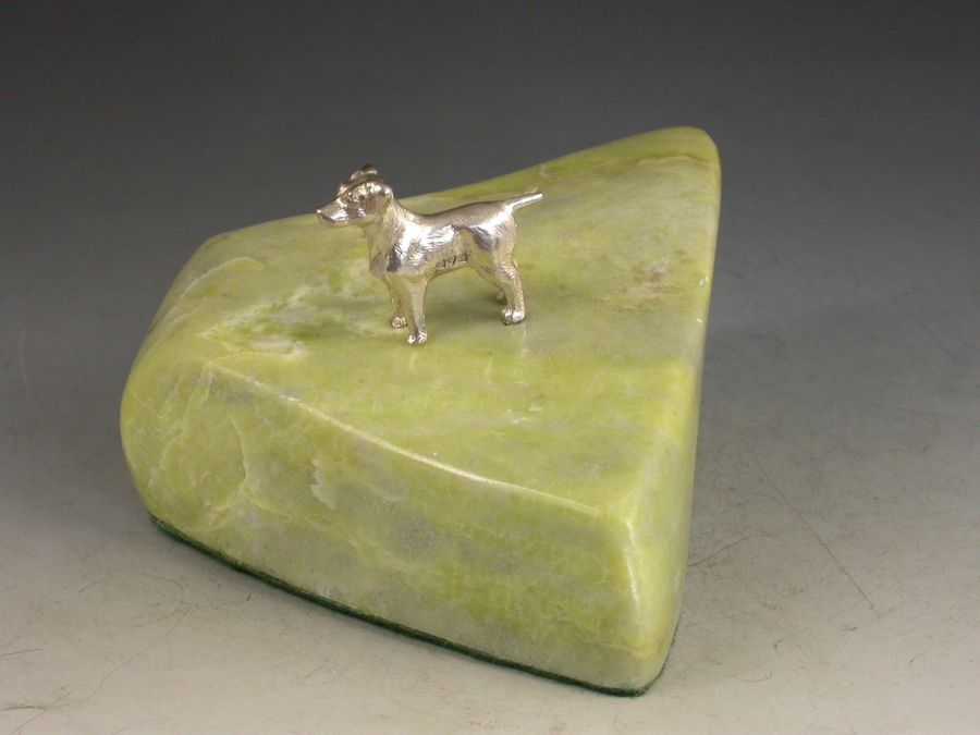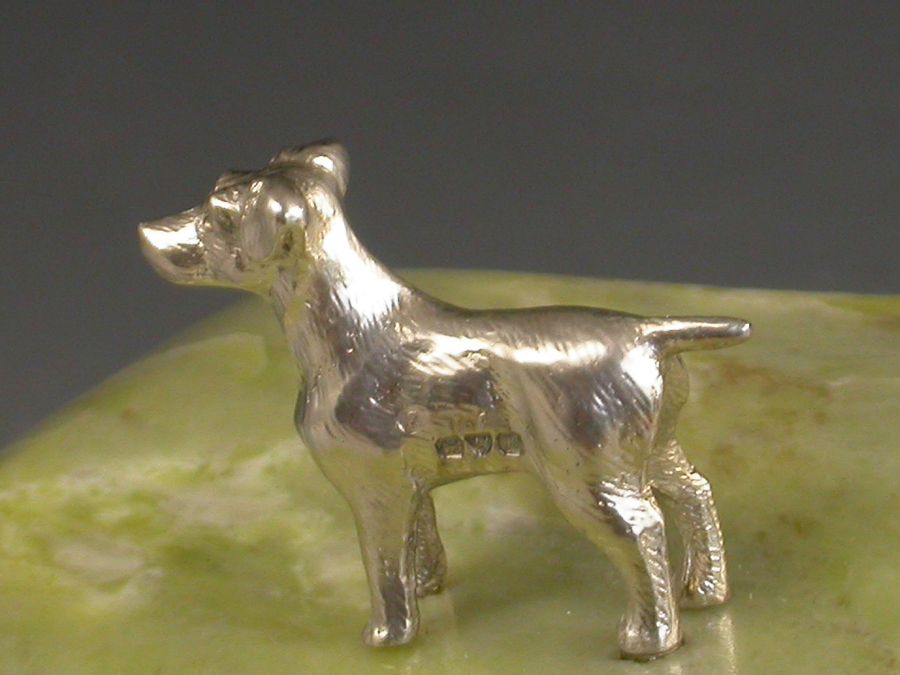 A fine quality Edwardian silver model of a small Terrier Dog standing on a shaped green Connemara marble base. Realistically modelled and very well defined.