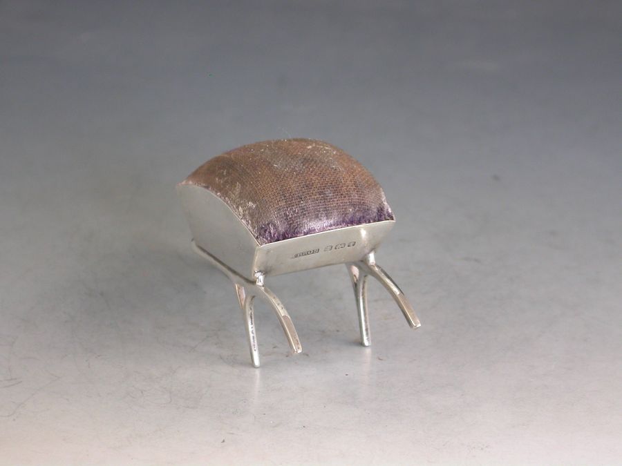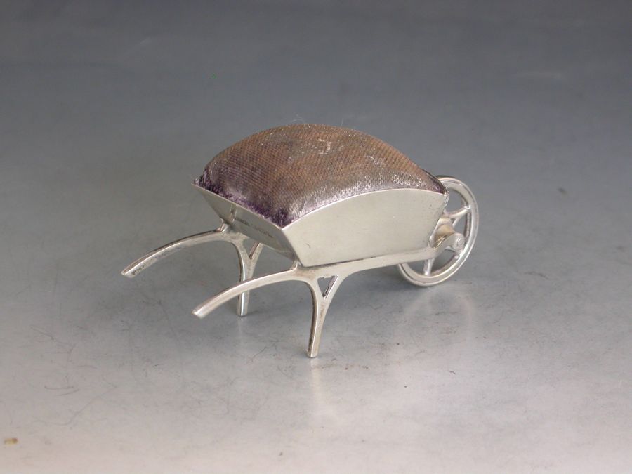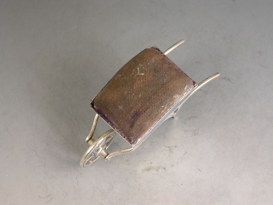 A good Edwardian novelty silver Pin cushion made in the form of a Wheel Barrow, complete with original blue velvet cushion.