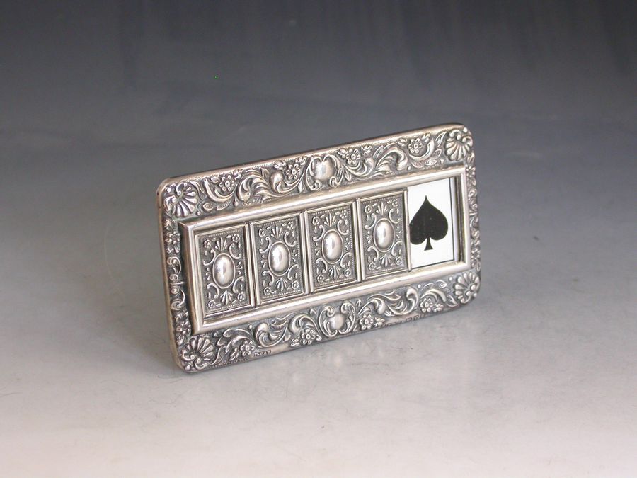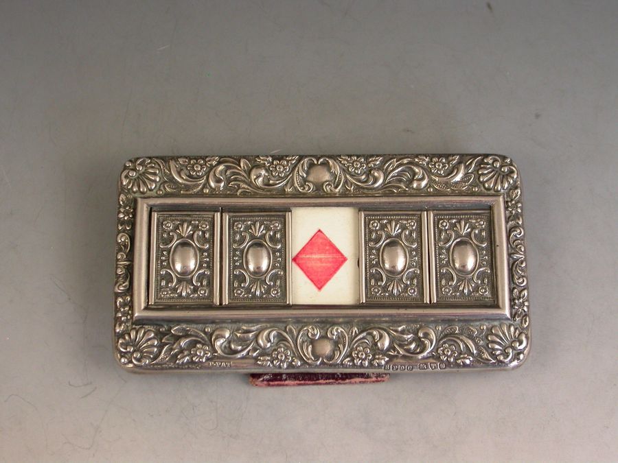 A good Edwardian Patented silver mounted Trumps Marker with red leather easel type back and stand, the silver frame with flower head, shell and scroll decoration, four sliding panels opening to reveal the trumps or no trumps painted on a celluloid backing.