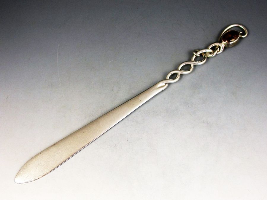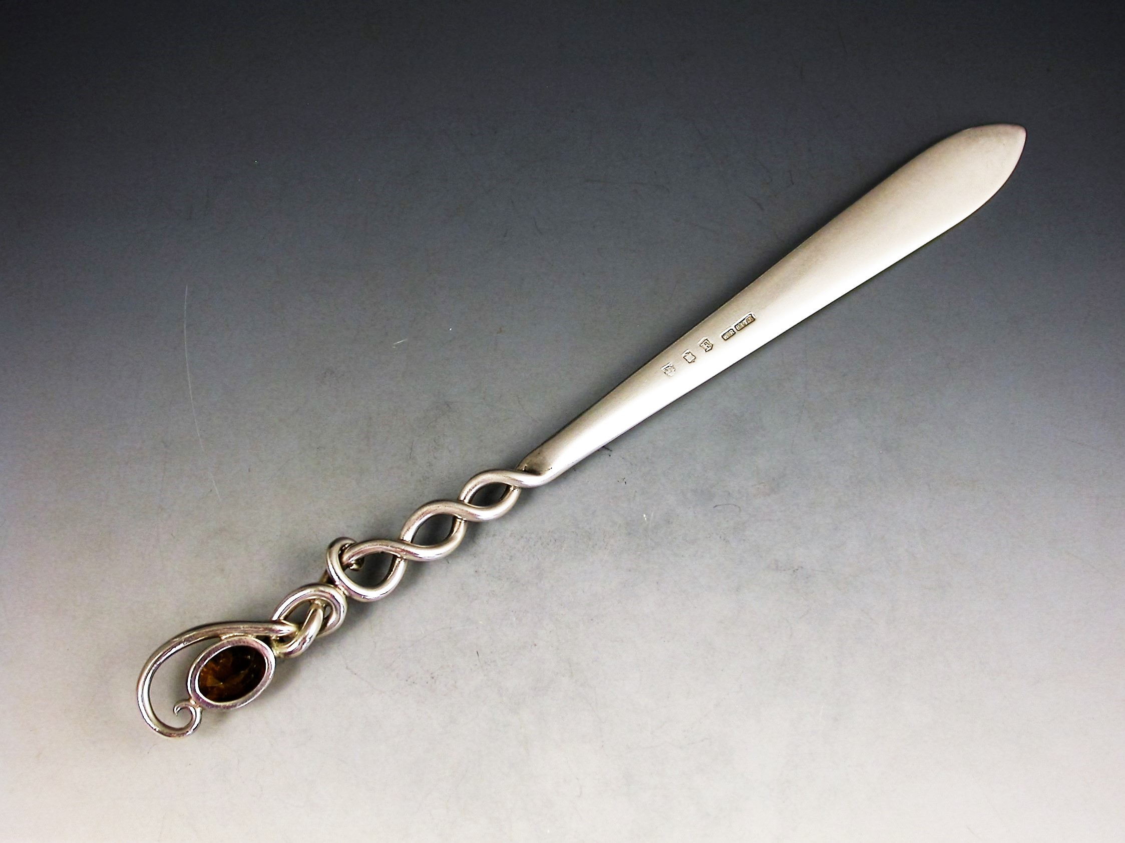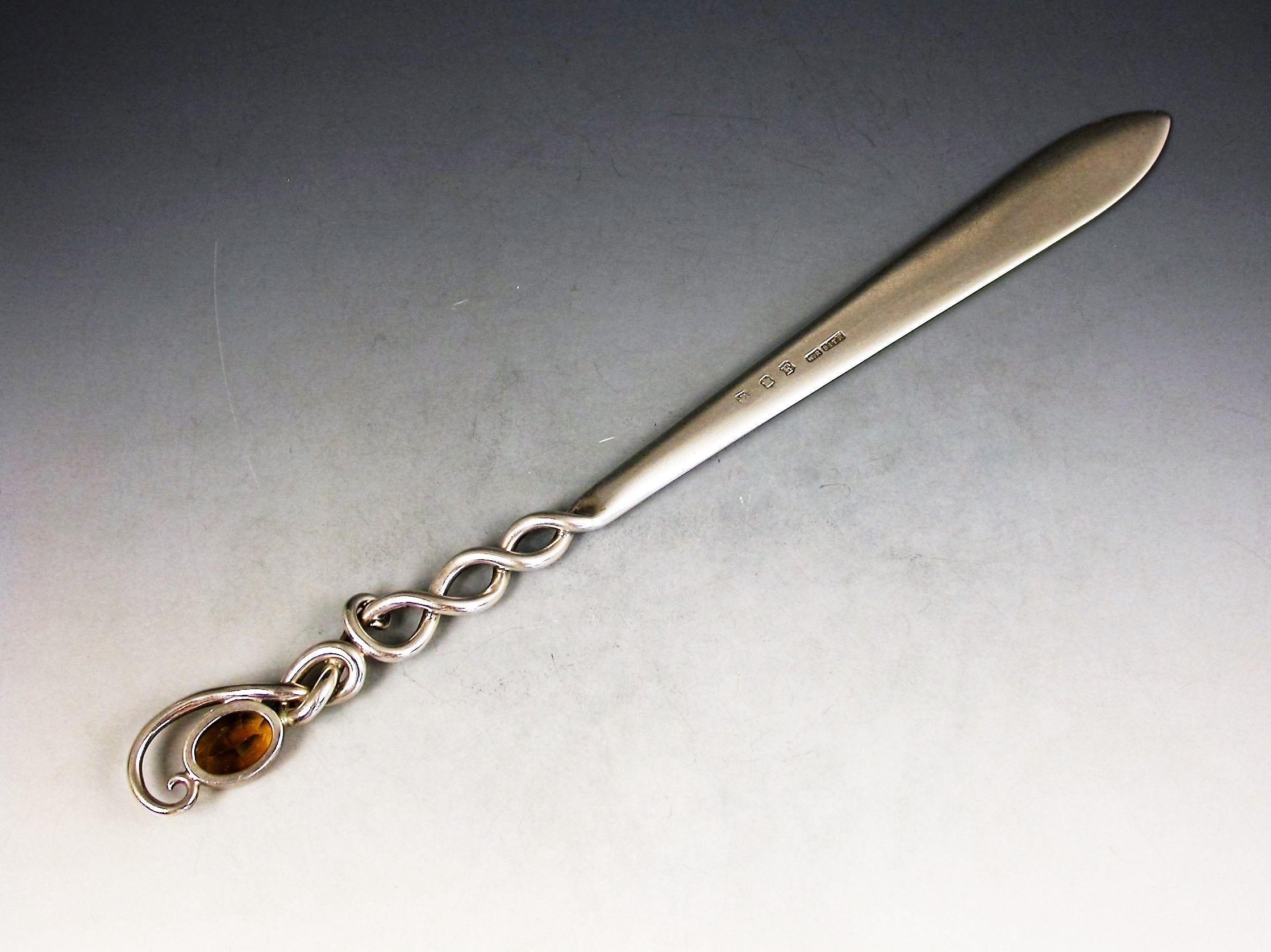 A good Edwardian Scottish Provincial silver Letter Opener with plain flared blade and pierced Celtic wire-work handle with a lozenge inset with a faceted citrine.