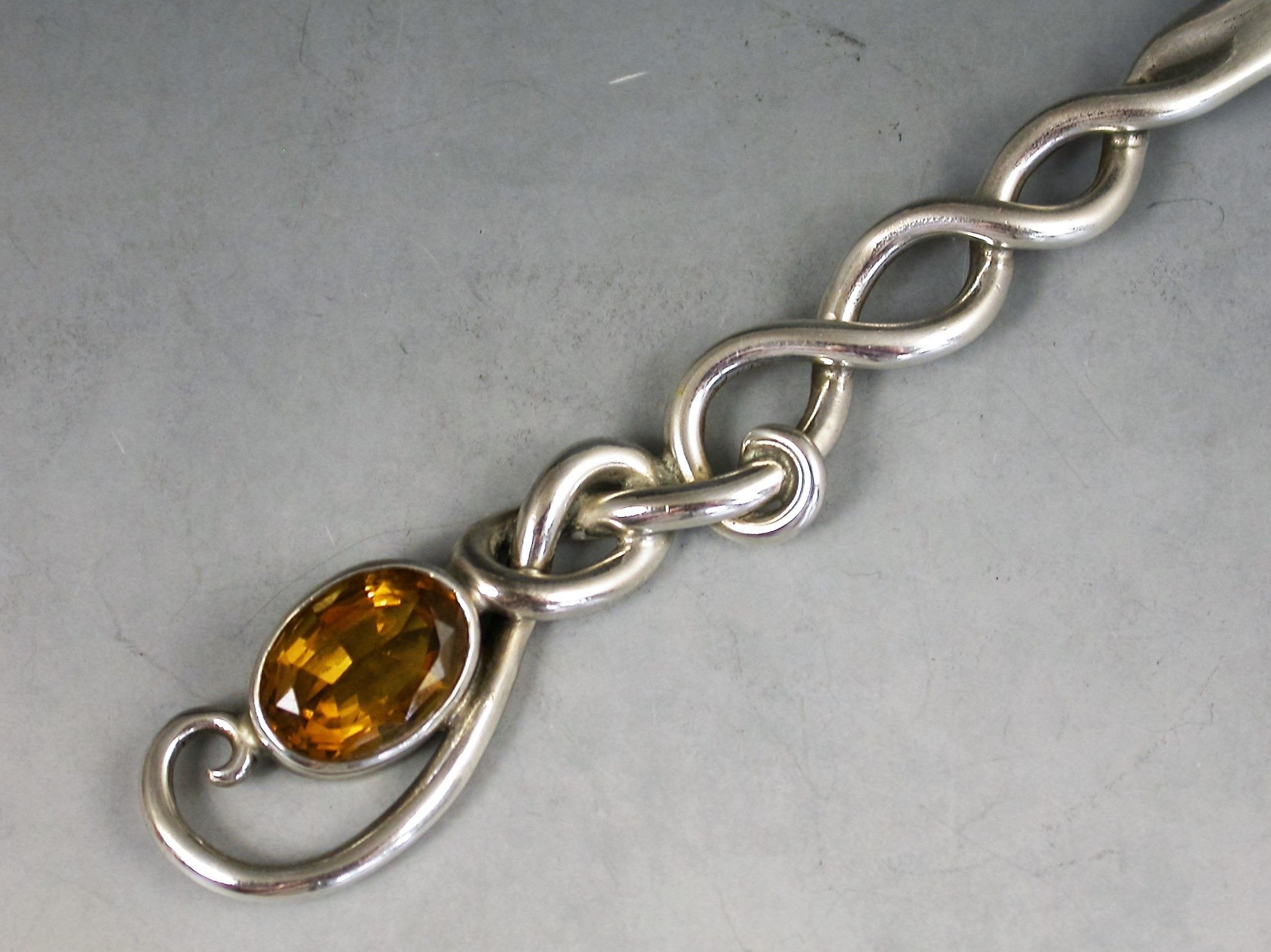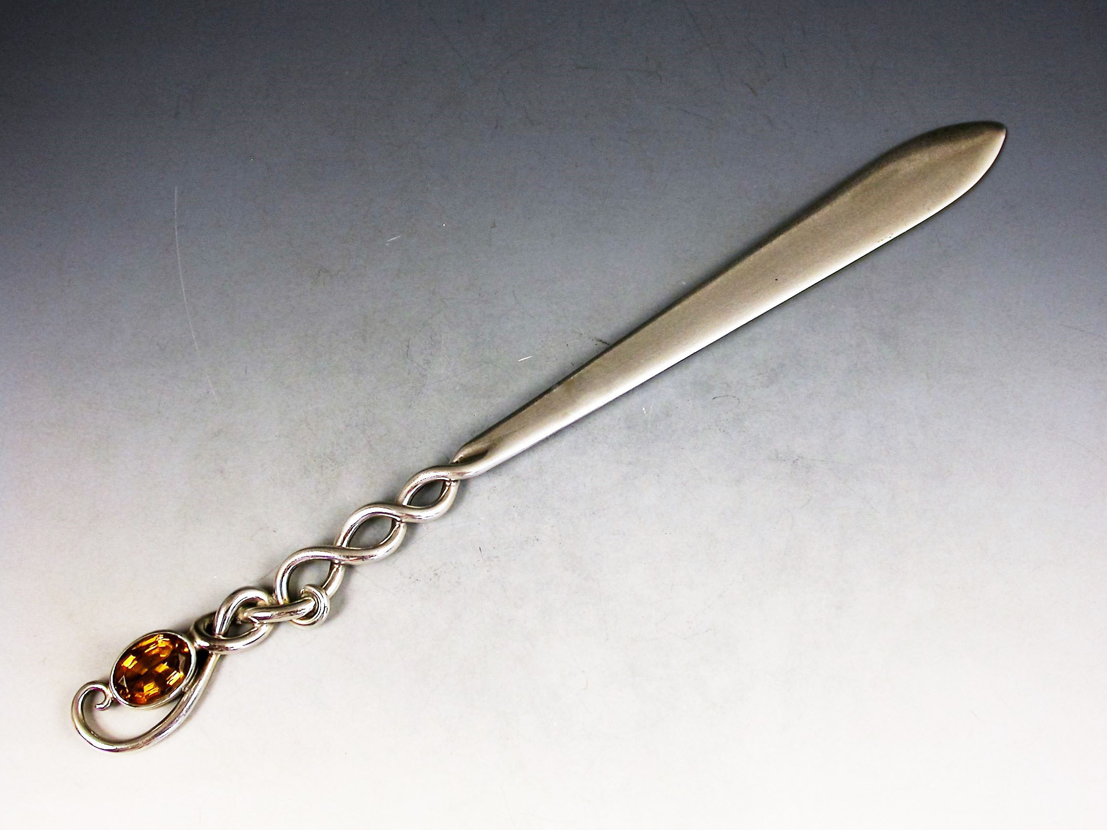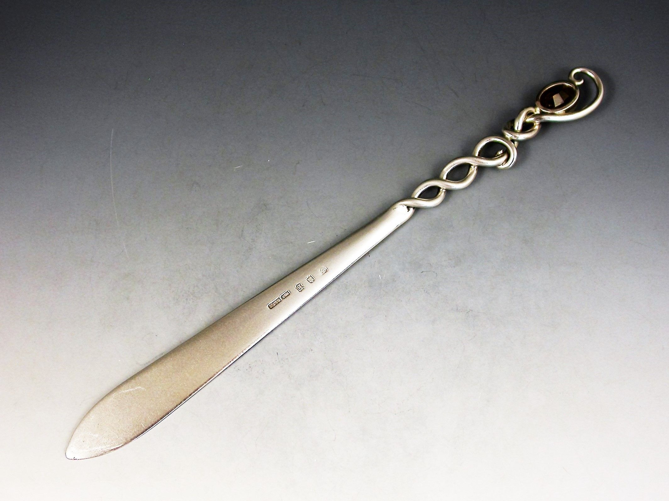 A good Edwardian Scottish Provincial silver Letter Opener with plain flared blade and pierced Celtic wire-work handle with a lozenge inset with a faceted citrine.