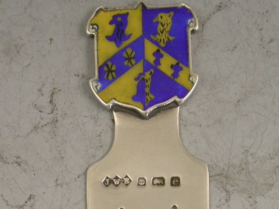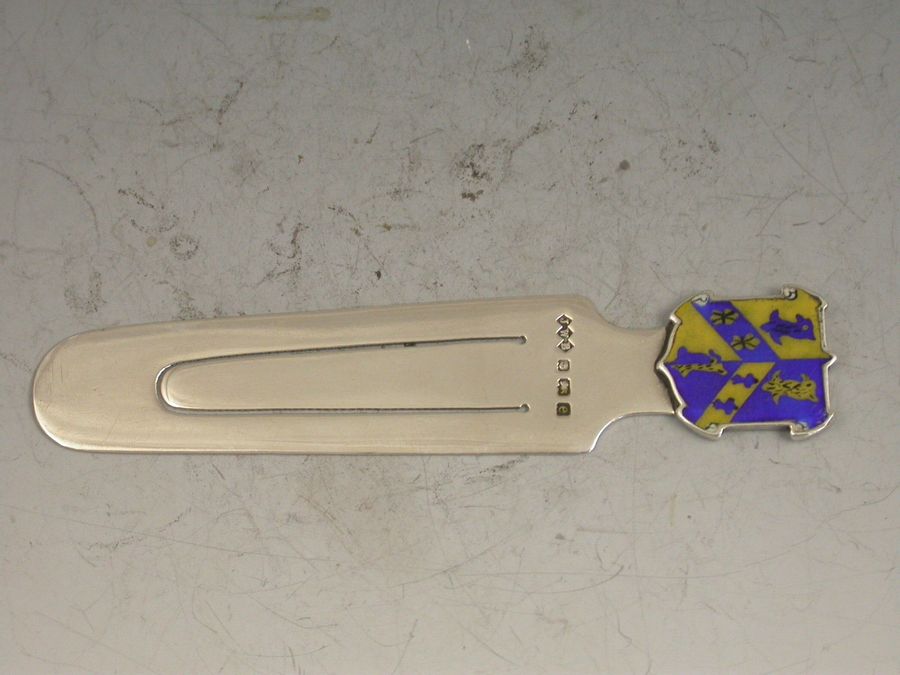 A rare Edwardian silver Bookmark, the terminal formed as a shield and enamelled with the Coat of Arms of Trinity College, Oxford University.