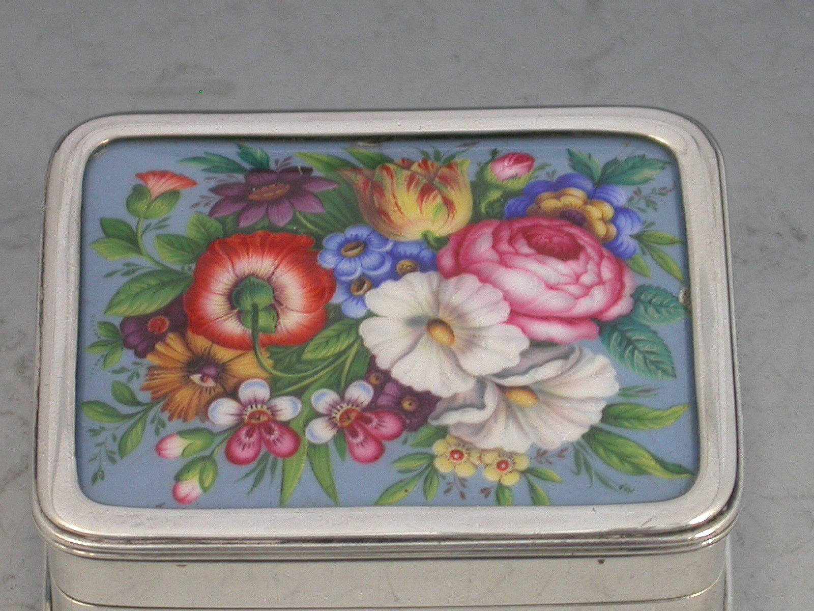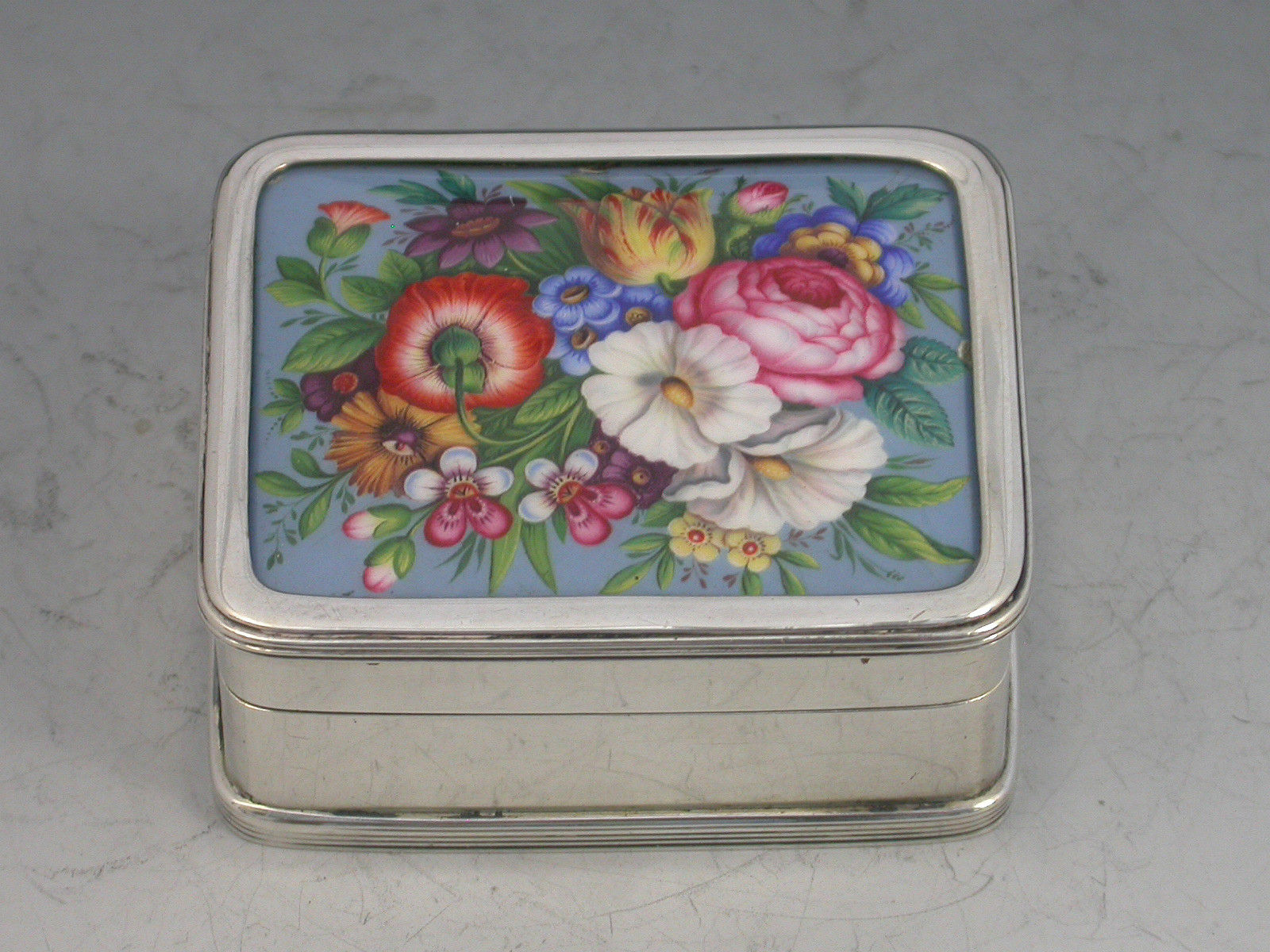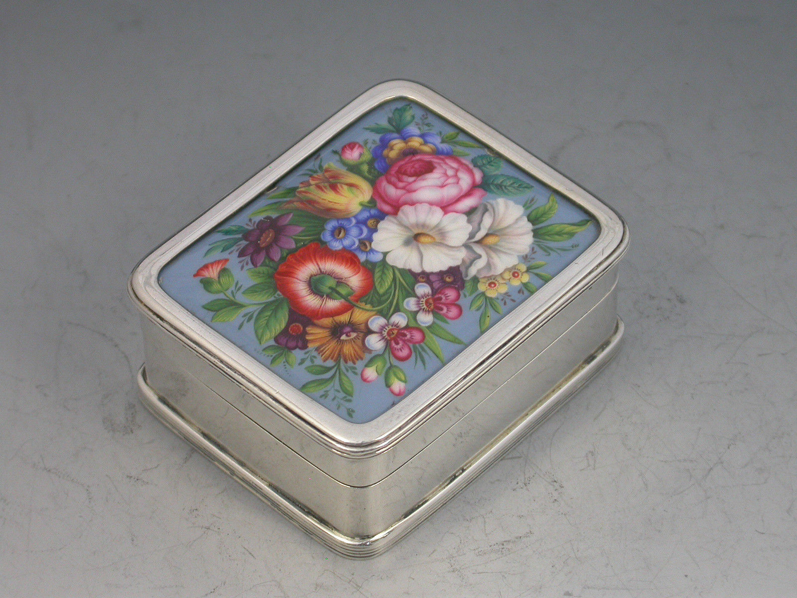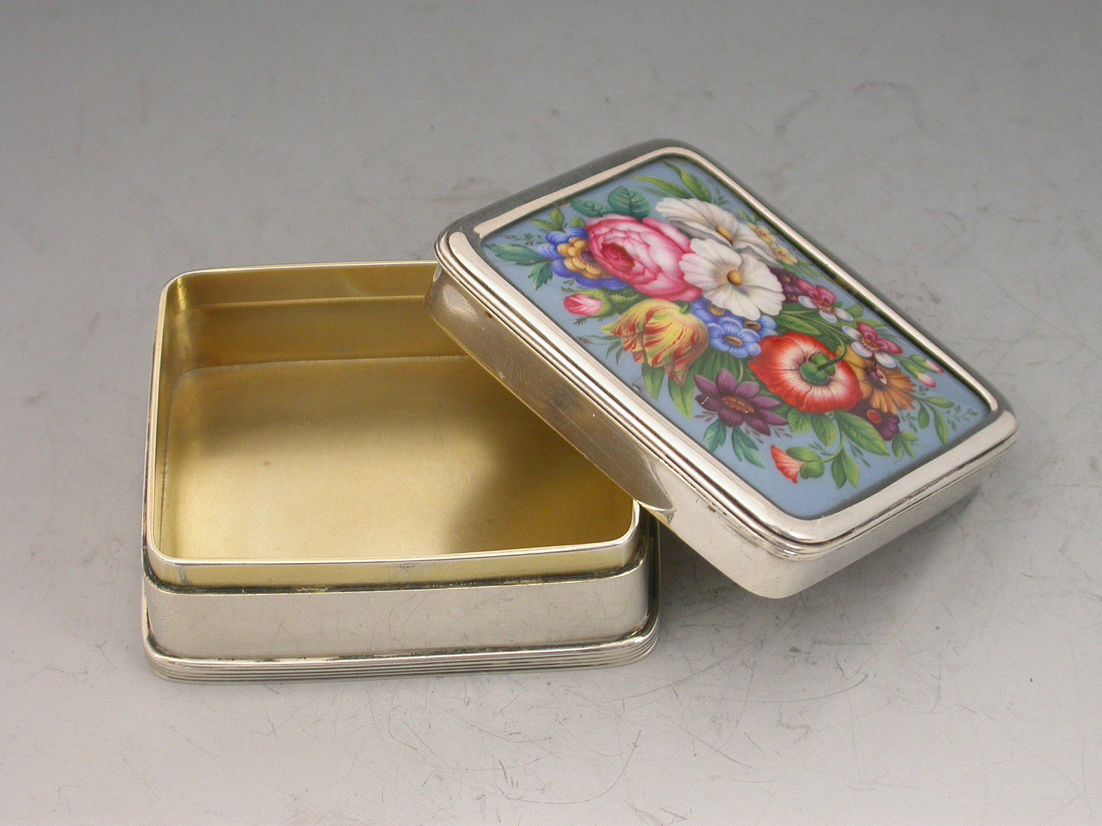 A fine quality Edwardian silver Pill Box of plain rectangular form with reeded borders, the lid inset with finely painted enamel panel depicting a bouquet of English flowers. Silver gilt interior.