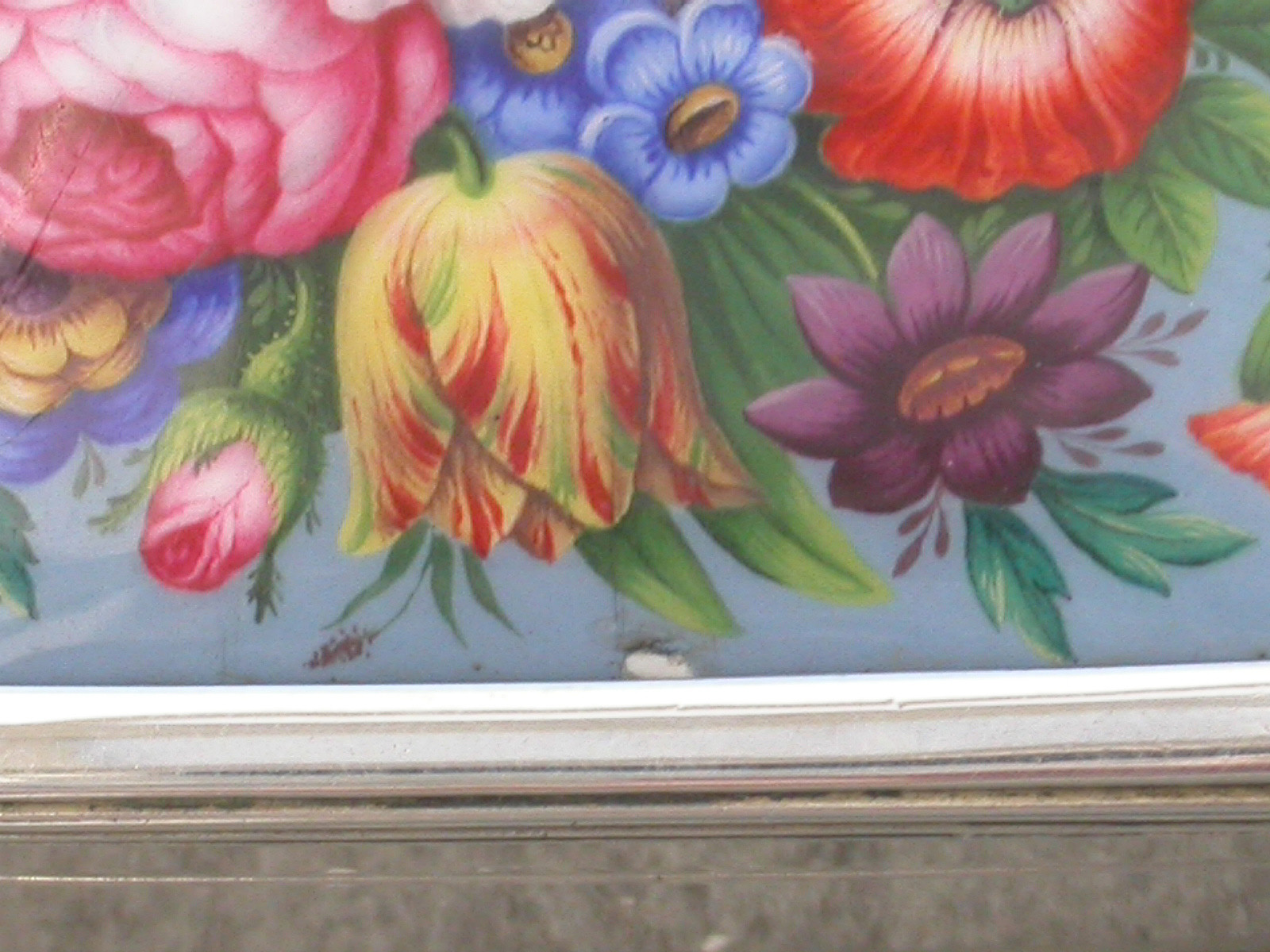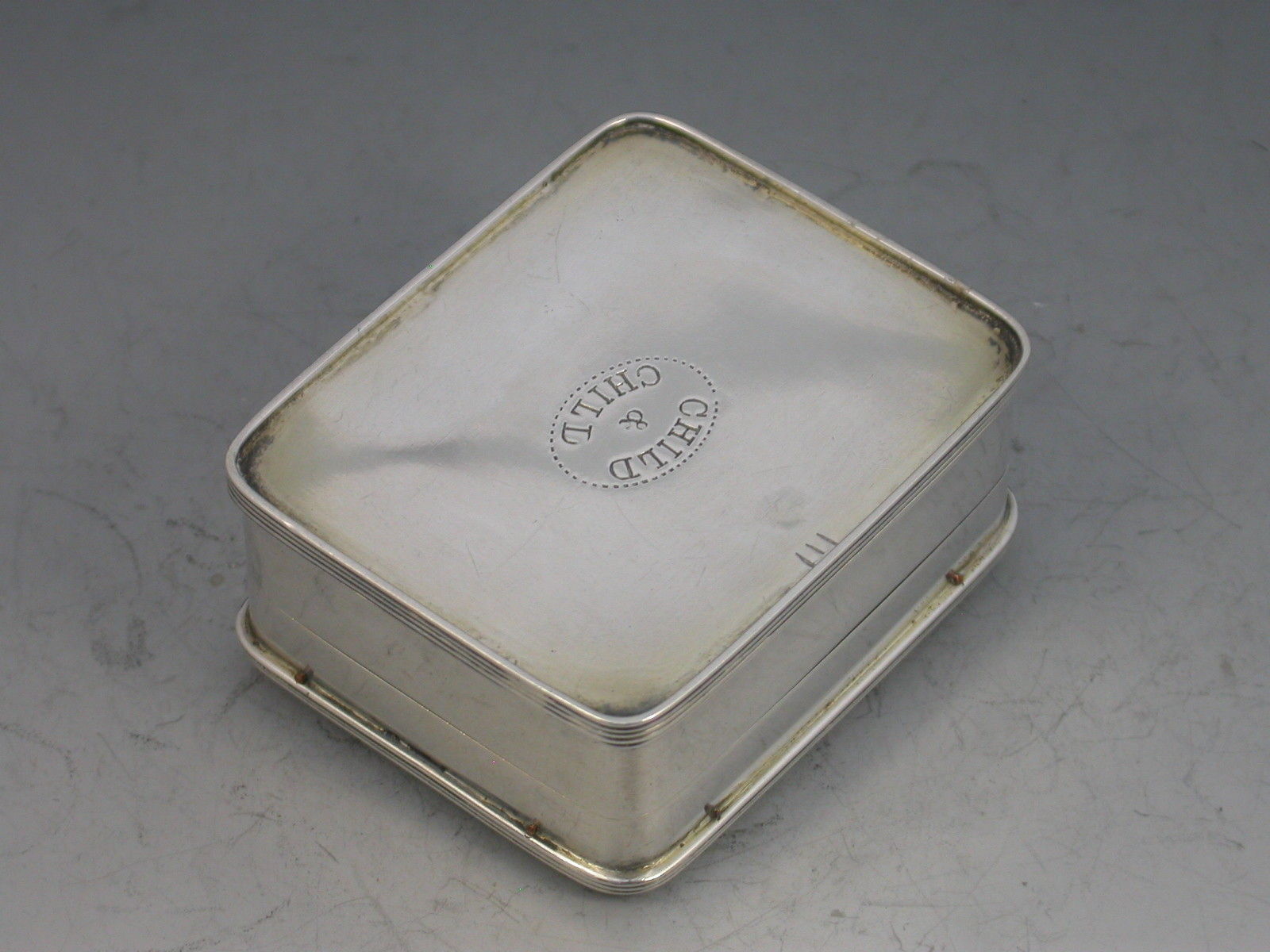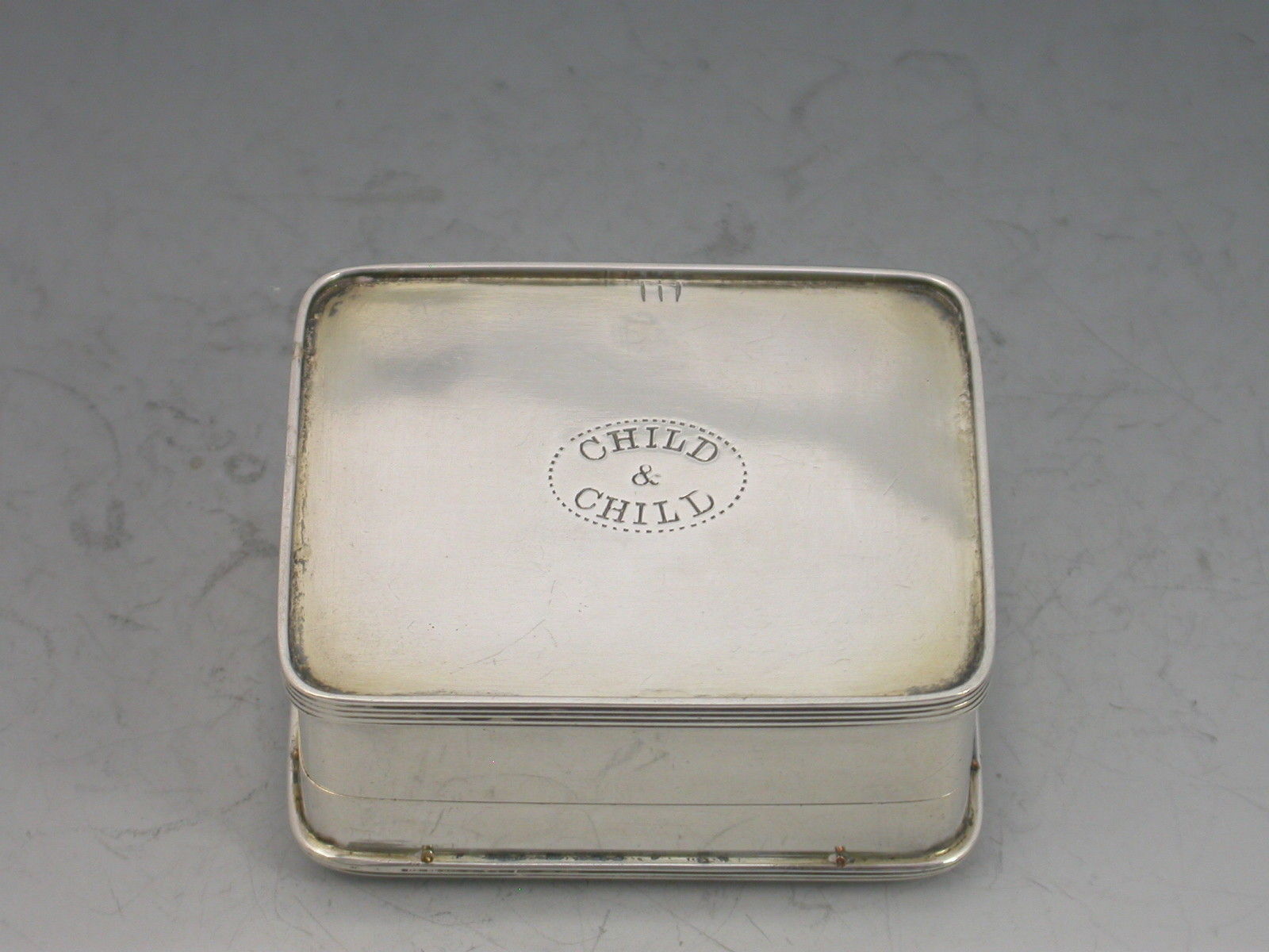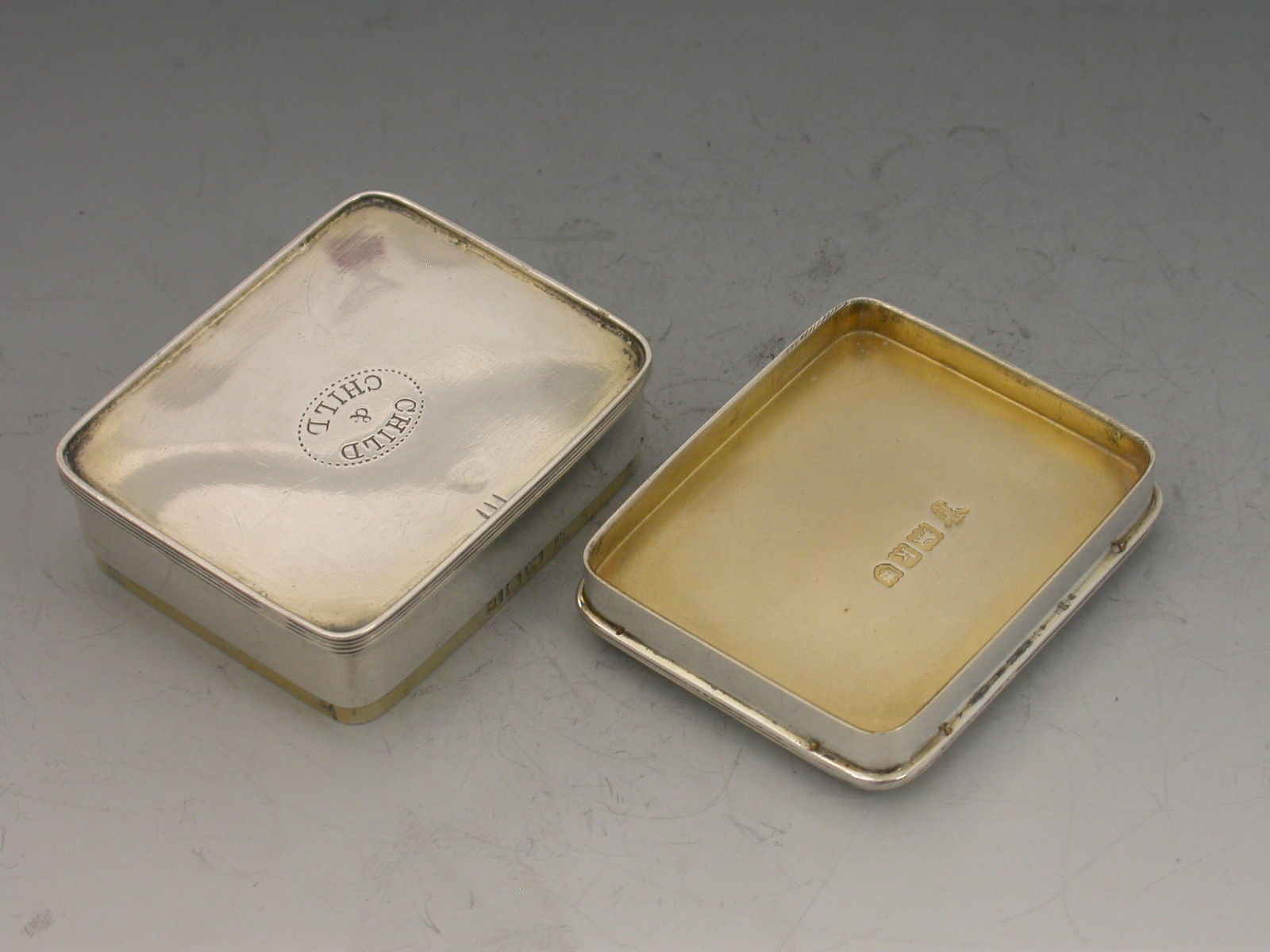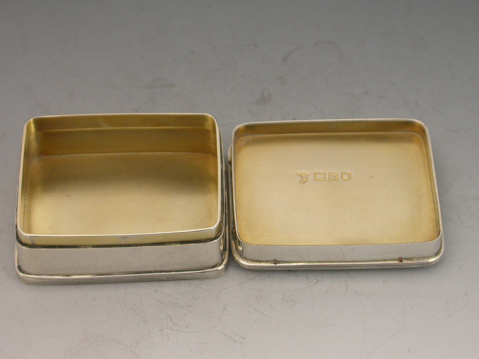 A fine quality Edwardian silver Pill Box of plain rectangular form with reeded borders, the lid inset with finely painted enamel panel depicting a bouquet of English flowers. Silver gilt interior.