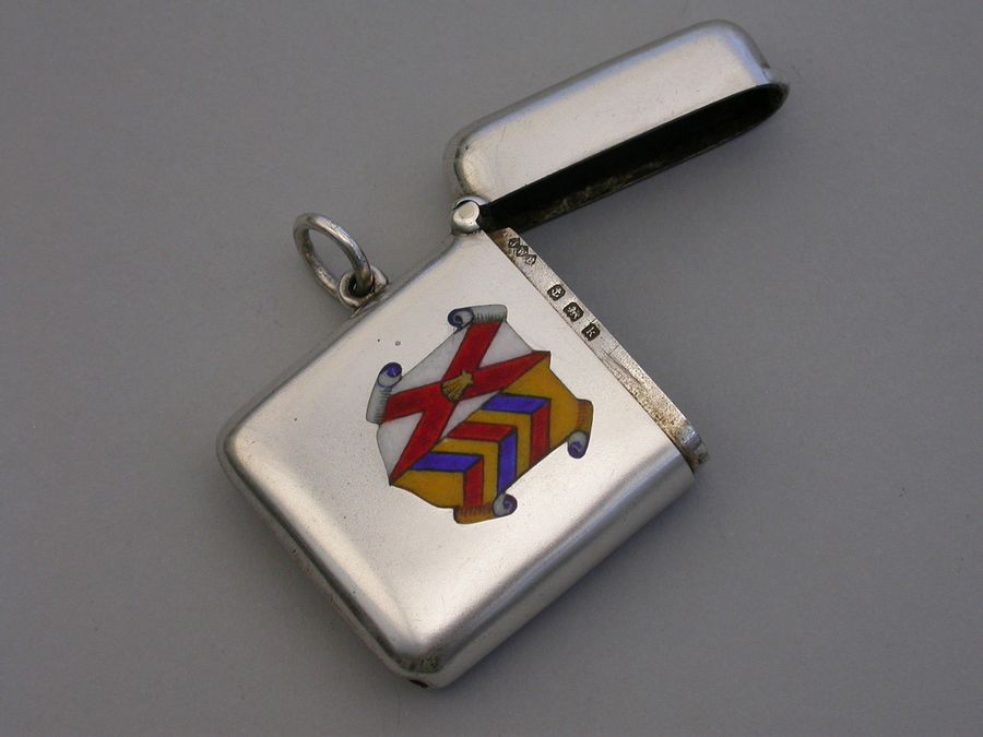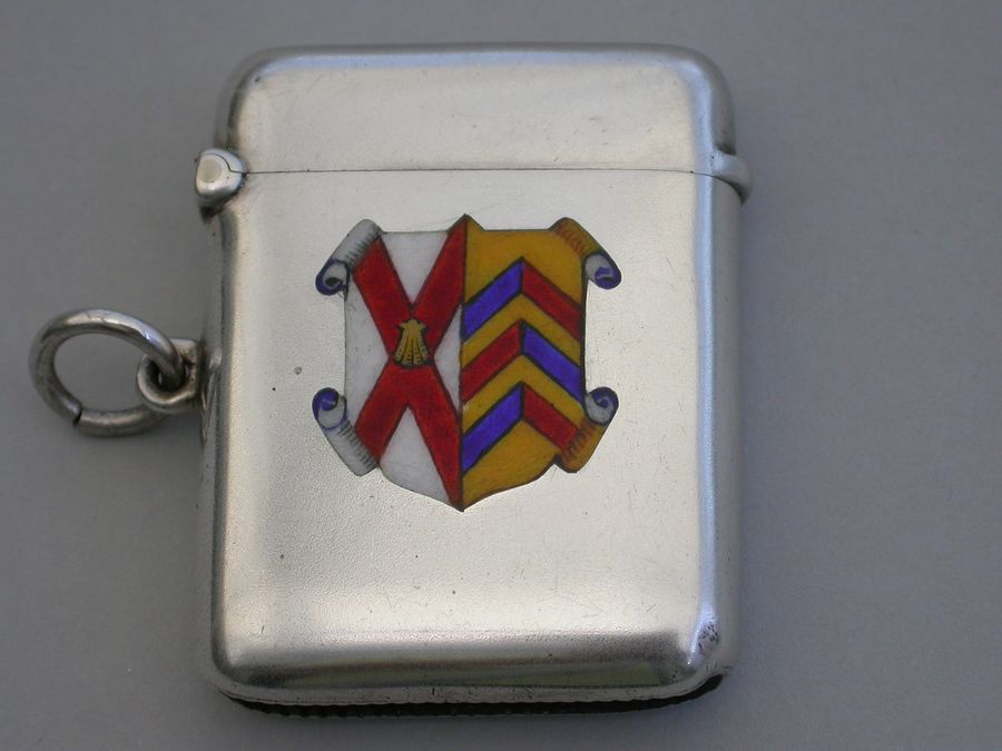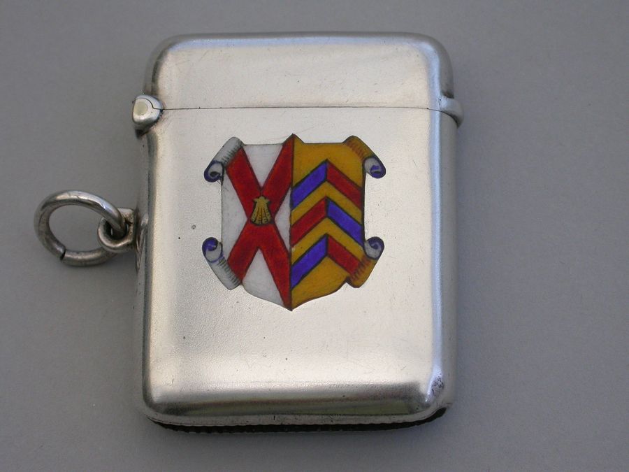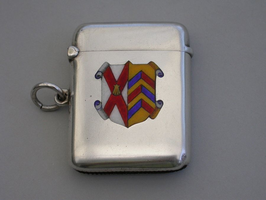 A good Edwardian silver and enamel Vesta Case of rounded rectangular form with hinged flip-top lid and attached suspension ring, the face enamelled with the Coat of Arms and Blazons of Merton College, Oxford University.